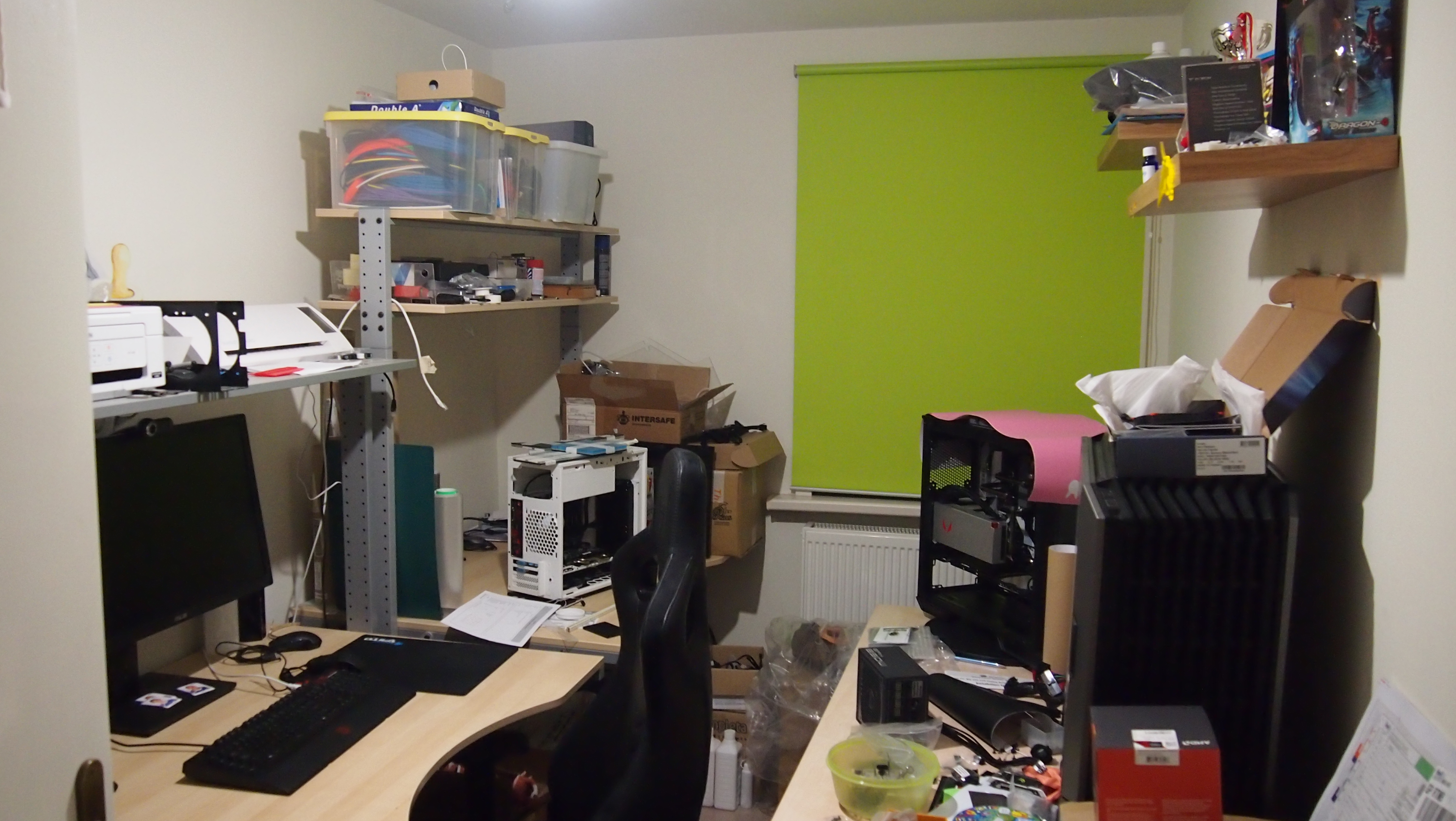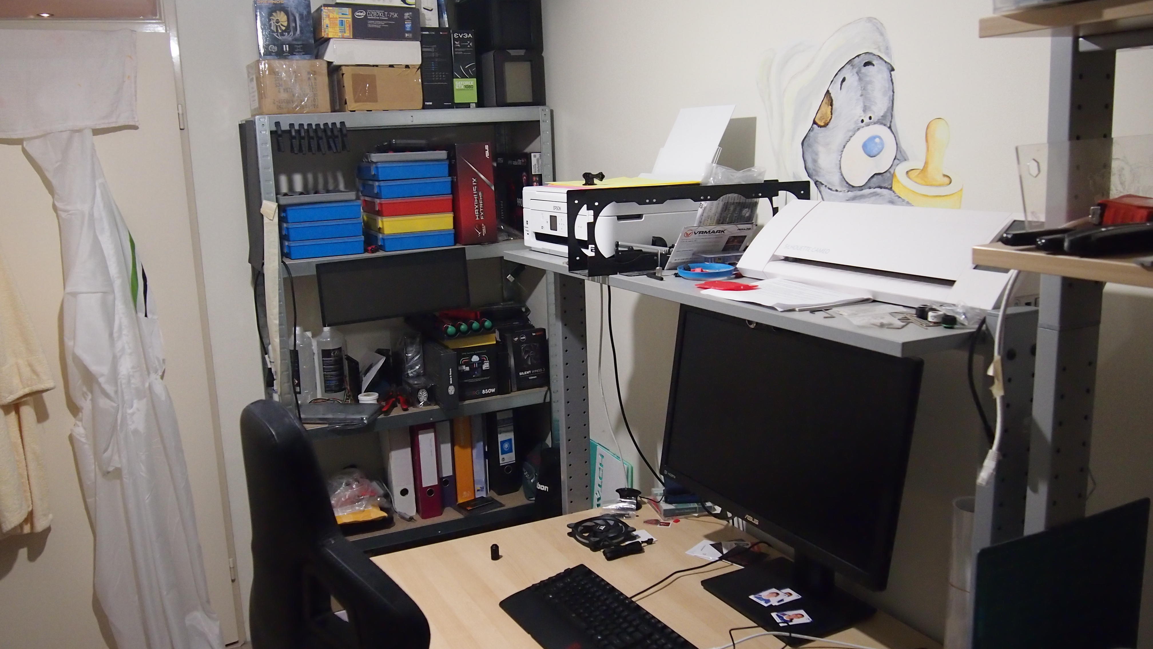 My modding space consists of two small areas. I have occupied the old baby room in the house. This is where I do all the clean work on systems, and here is also where I have my stash of random PC stuff, our family PC, and my vinyl plotter.