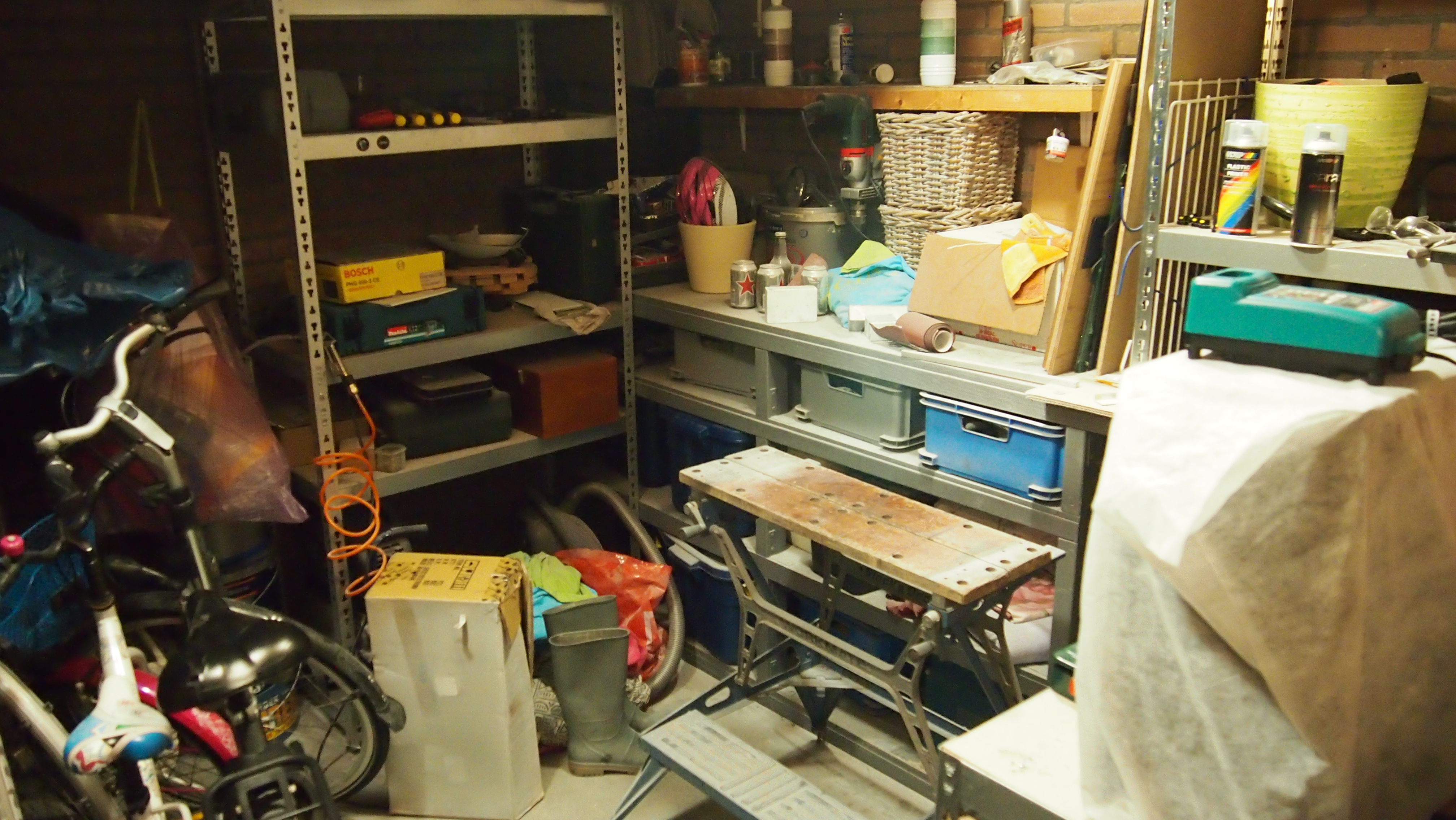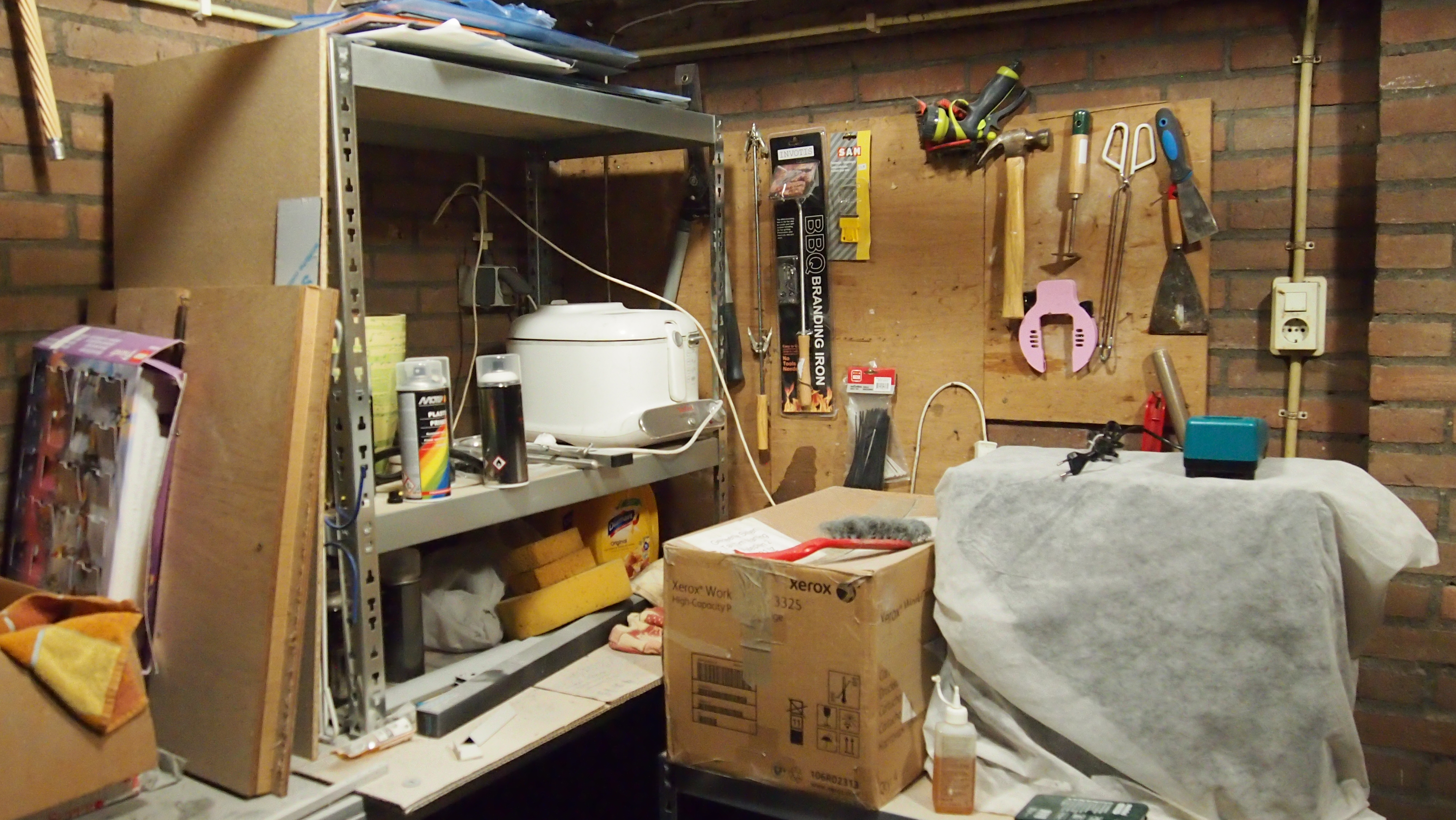 I do the dirty case mod work in our shed, where I also have loads of stuff belonging to my two daughters and bicycles. It is basically a very old Black & Decker Workmate and various tools like the jigsaw and files and drill and plexiglass bender (ghetto style).