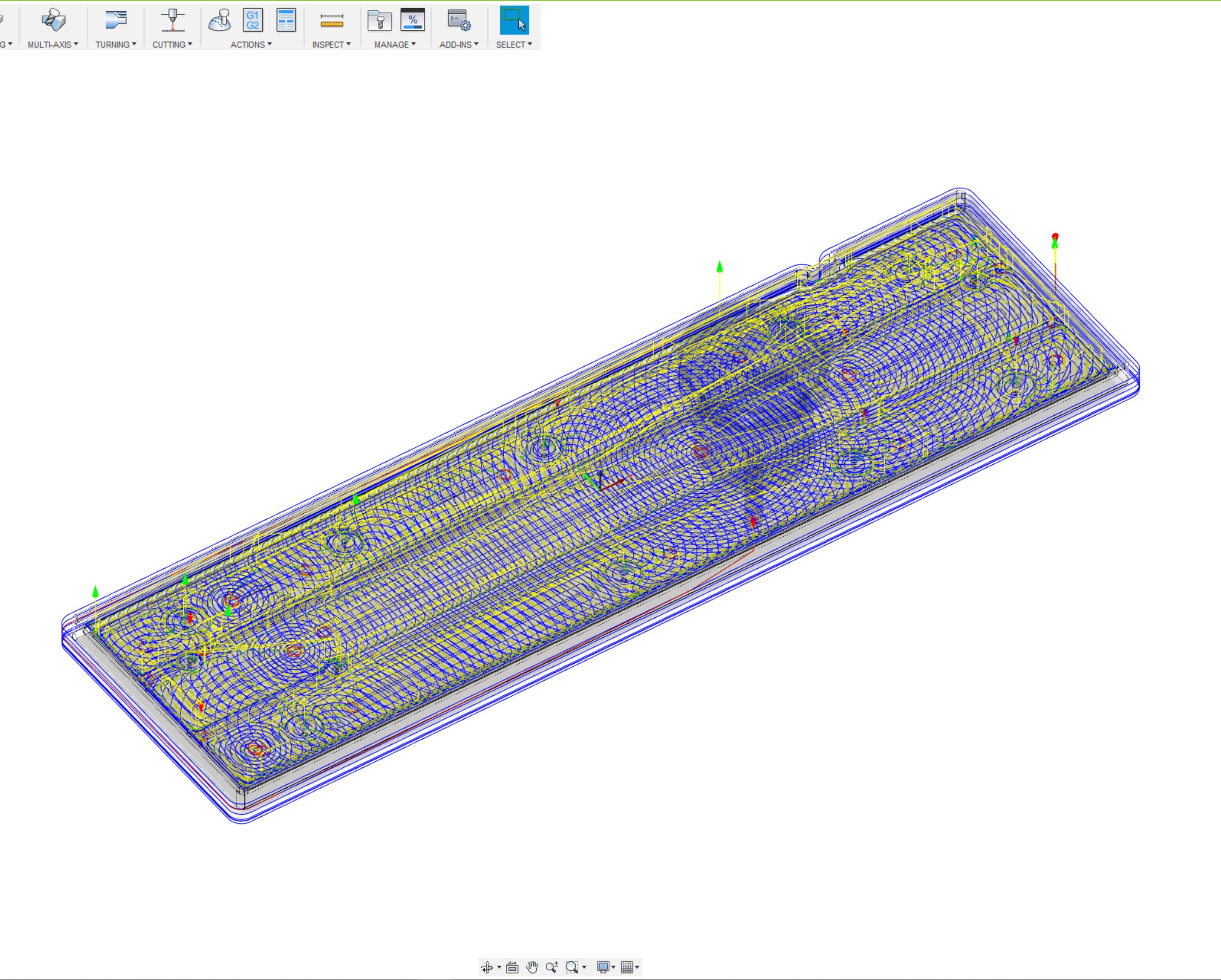 I was originally going to machine some protruding feet on the underside of the board, but the more I looked at it, the less confident I became that the piece would be able to remain flat on the bed after the internal machining, so I shelved that for another day. With the model done it was time to toolpath up and export to the machine for cutting.