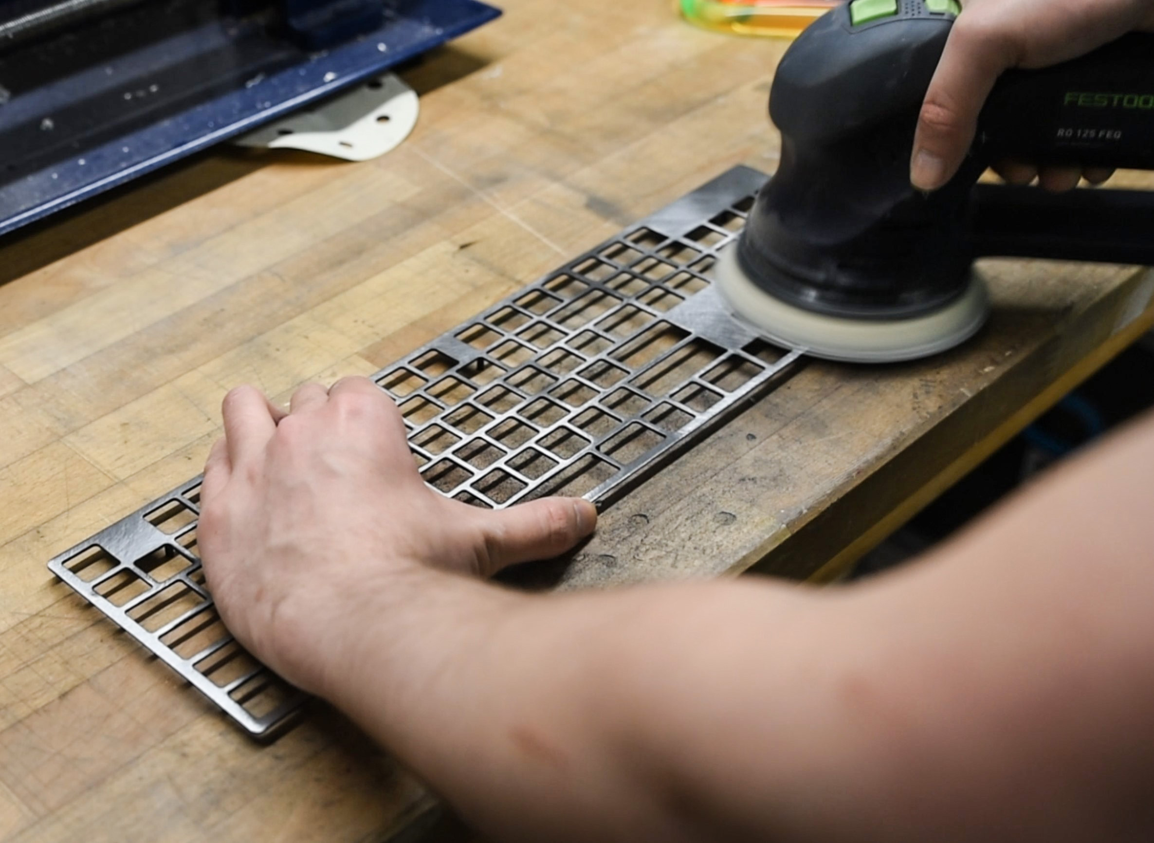 With the housing complete, it was time to have a look at the surface of the board. The top may appear at first glance to be plastic, but it is in fact a fairly hefty piece of steel that's been painted. So to bring out that material a bit, I decided to sand down and polish it. Starting with 120-grit and going in rotary mode, I removed the paint from the surface and the outer edge. Next, I worked my way up the grits, going 180/320/500/500 soft/1,000 soft/2,000 soft, then finally finishing with 6k and 11k polish on a lambswool polishing head.