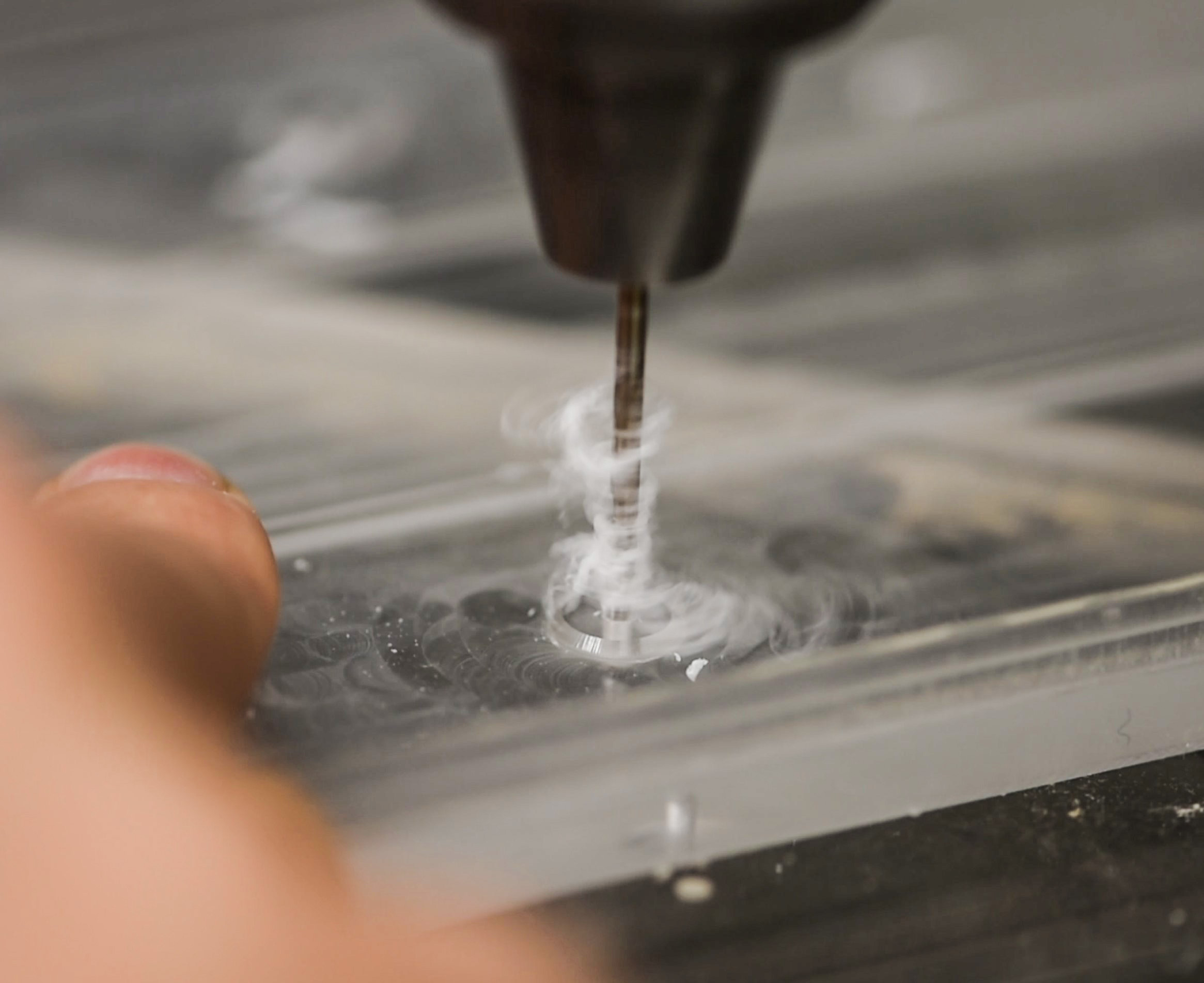 Skipping the finishing pass (since the exterior will be frosted anyway), I decided not to drill the mounting holes using the machine but rather to spot drill instead. Normally, it wouldn't be a problem, but M2 is tiny and I didn't have an endmill both long and narrow enough for the job. I could also have used a normal drill bit but didn't have a collet of the correct size around.