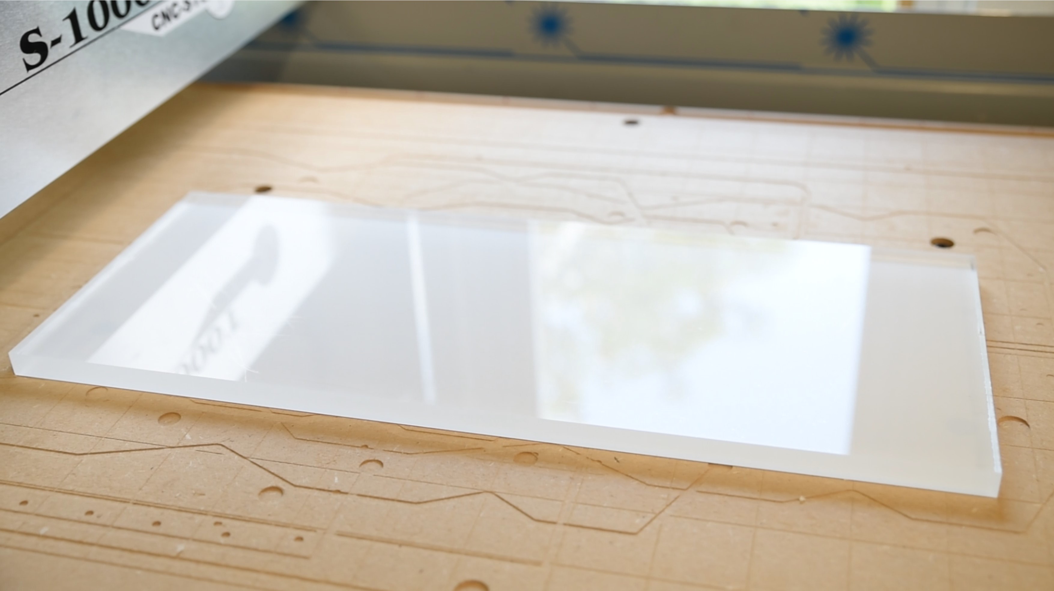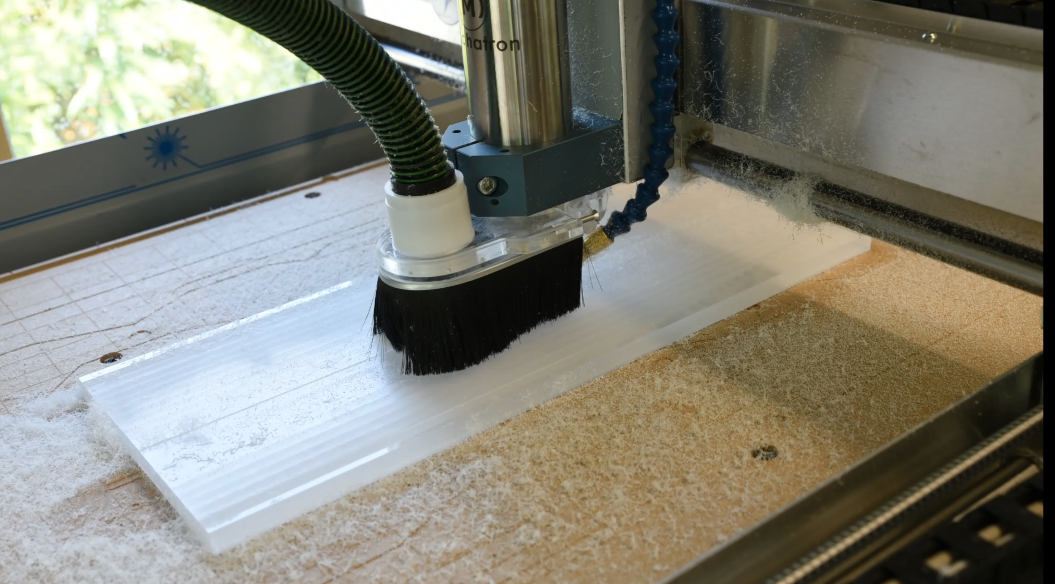 Up to this point, I've not actually cut 15mm acrylic on my machine before. Whilst not intrinsically different to 10mm, it does require some pre-treatment to have any hope of being accurate. To get around the wonky surface, a simple face milling job was in order. After taking off just under a millimetre, the top was now nice and level. Starting with an 8mm Datron 4-in-1 endmill, I roughed the main cavities and exterior, finishing with a 4mm to ensure the interior corners were crisp enough for the PCB to fit. It's not a complex set of cuts, but it is quite lengthy, as there's a lot of material to remove, plus it was pushing nearly 35°C in my shop thanks to the sun deciding to rock up.