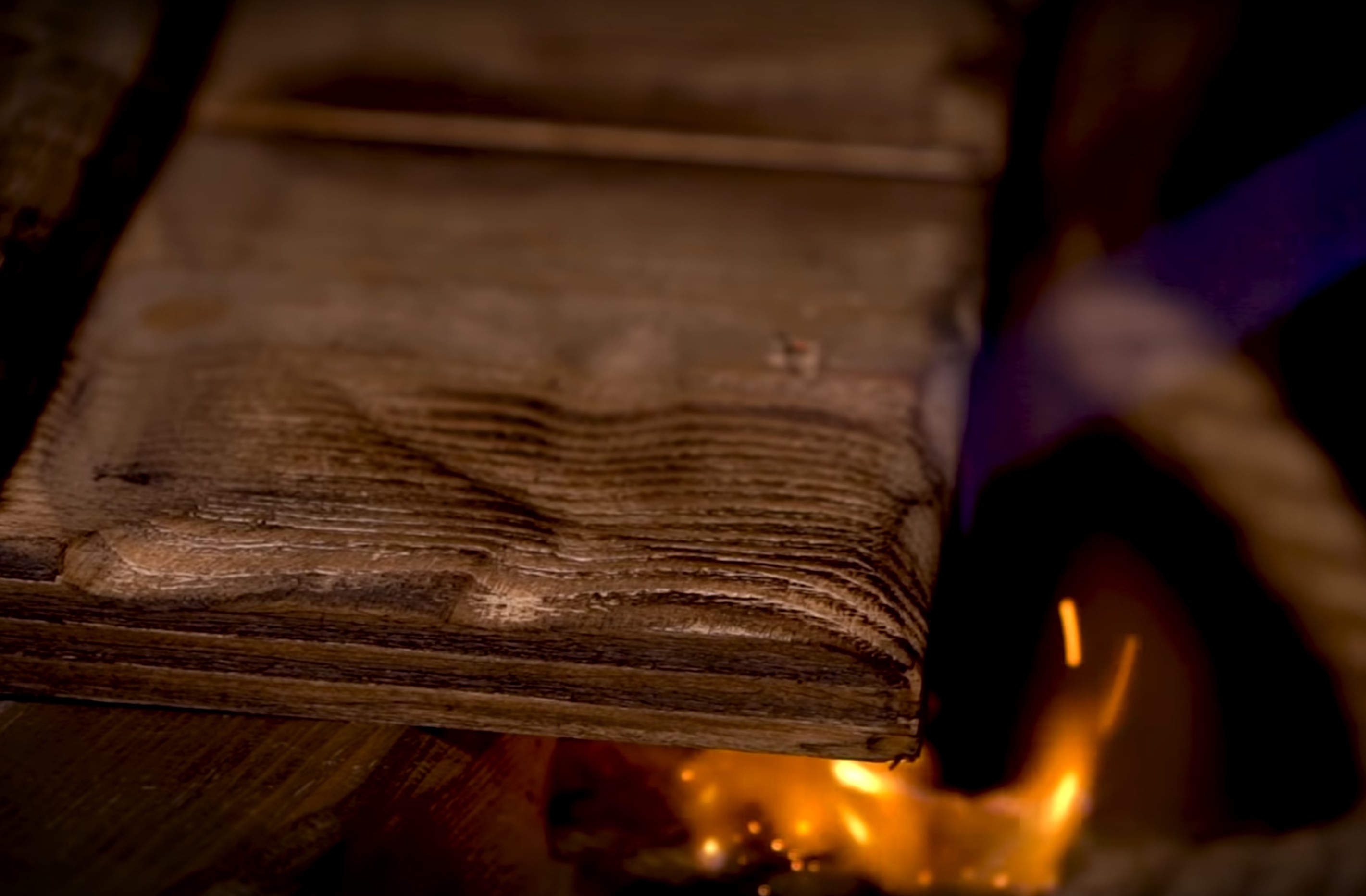 In the second step we used a wire wheel to bring out the wood grain. Normally when wood has been left out in the elements, you'll notice that the the grain can become quite pronounced (particularly with soft woods); the sap wood and the heart wood weather at different rates causing this effect. You can emulate this with a wire wheel/brush, which will sand away the sap wood faster, leaving that same familiar appearance. We finished off the weathering with some classic abuse, hitting it with hammers, throwing spoons at it, that sort of thing.