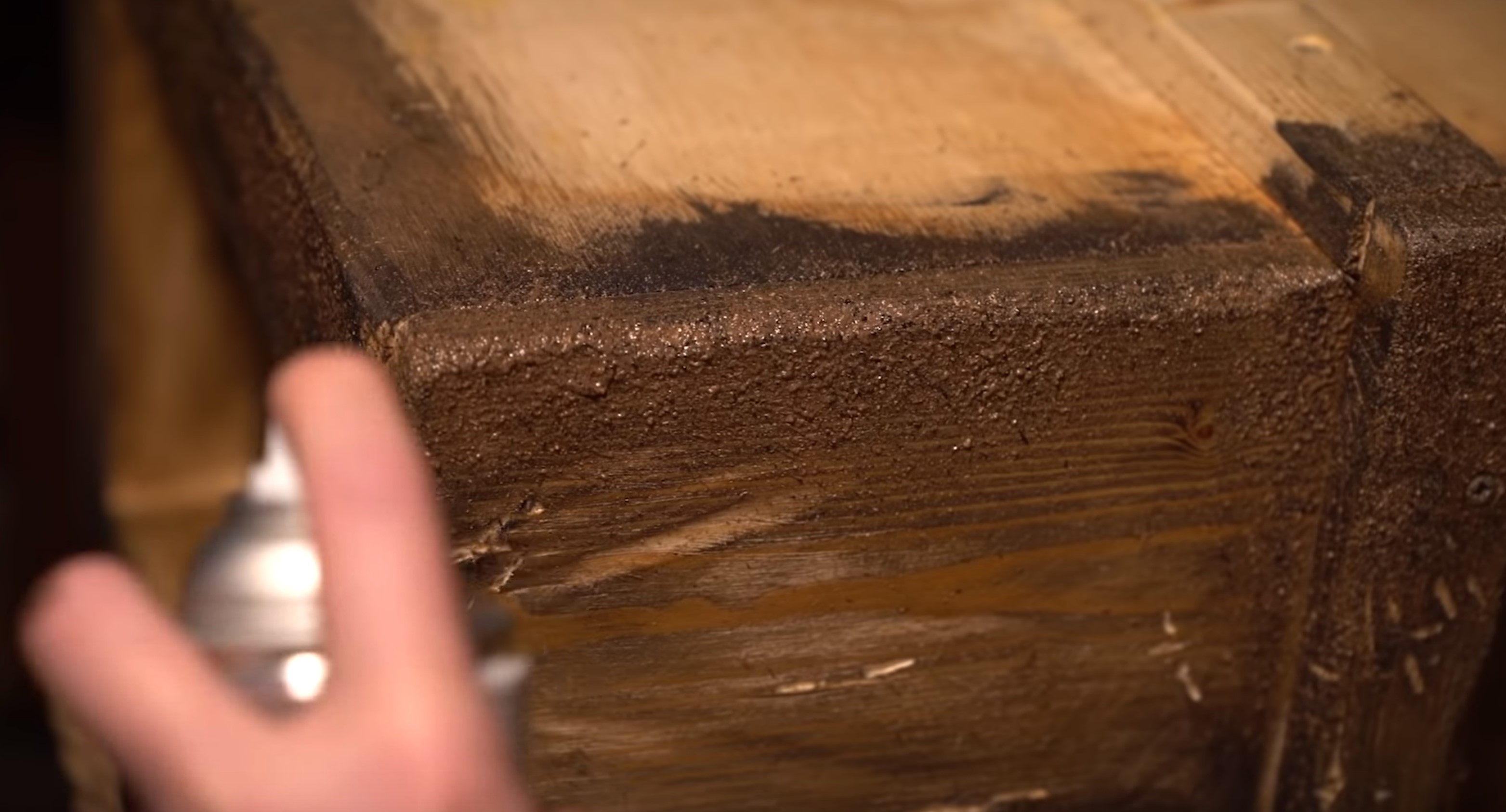 To add some extra depth, we then went over the recessed areas with a dark ebony stain. This stuff's strong, so again we tried to be as light with the application as we could, sticking just to the crevices to be authentic. Ultimately the crate won't be 100 percent realistic, but it's important that it makes sense. Using a dry brush, we applied more of the ebony stain along the corners, just to give that little extra depth, then followed up with blowtorch-aided singeing.