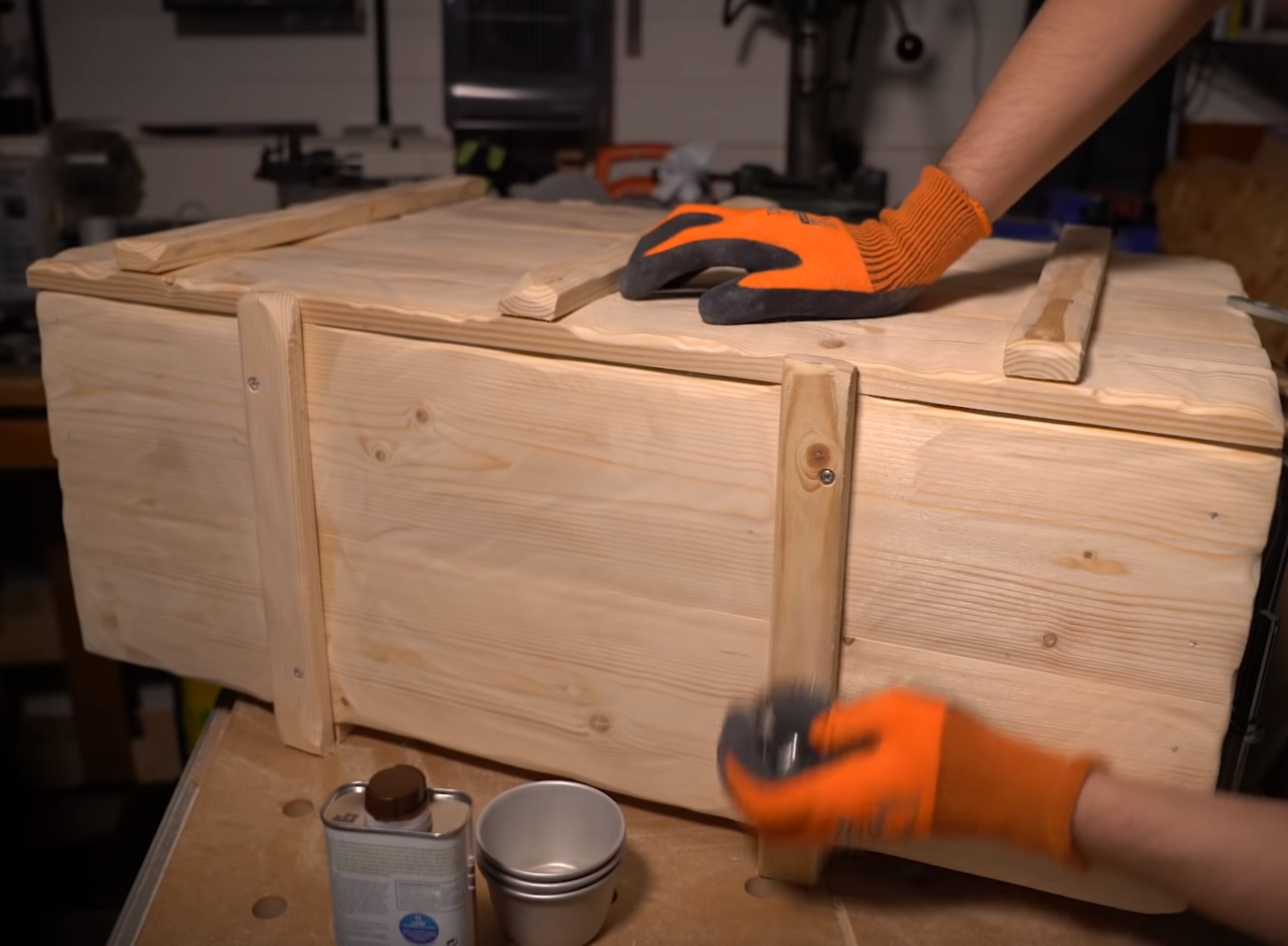 The first one we tried is a staple among prop workers that's used to provide wood with an aged, weather-beaten look. First up, the crate needed to be physically attacked a bit. We began by going at it with the rotary sander - this was mostly to round off corners and add notches and general wear and tear to the exterior. When doing this, we thought carefully about which parts of the crate would most likely have been damaged during use, so targeted areas such as the lid and the strapping boards.