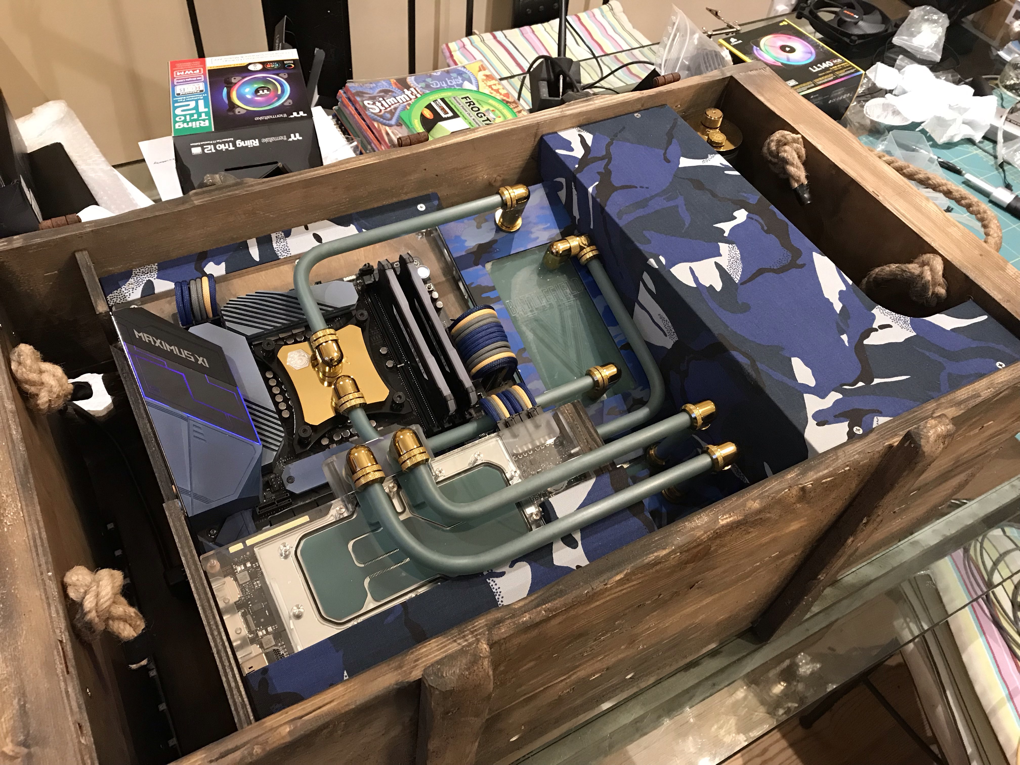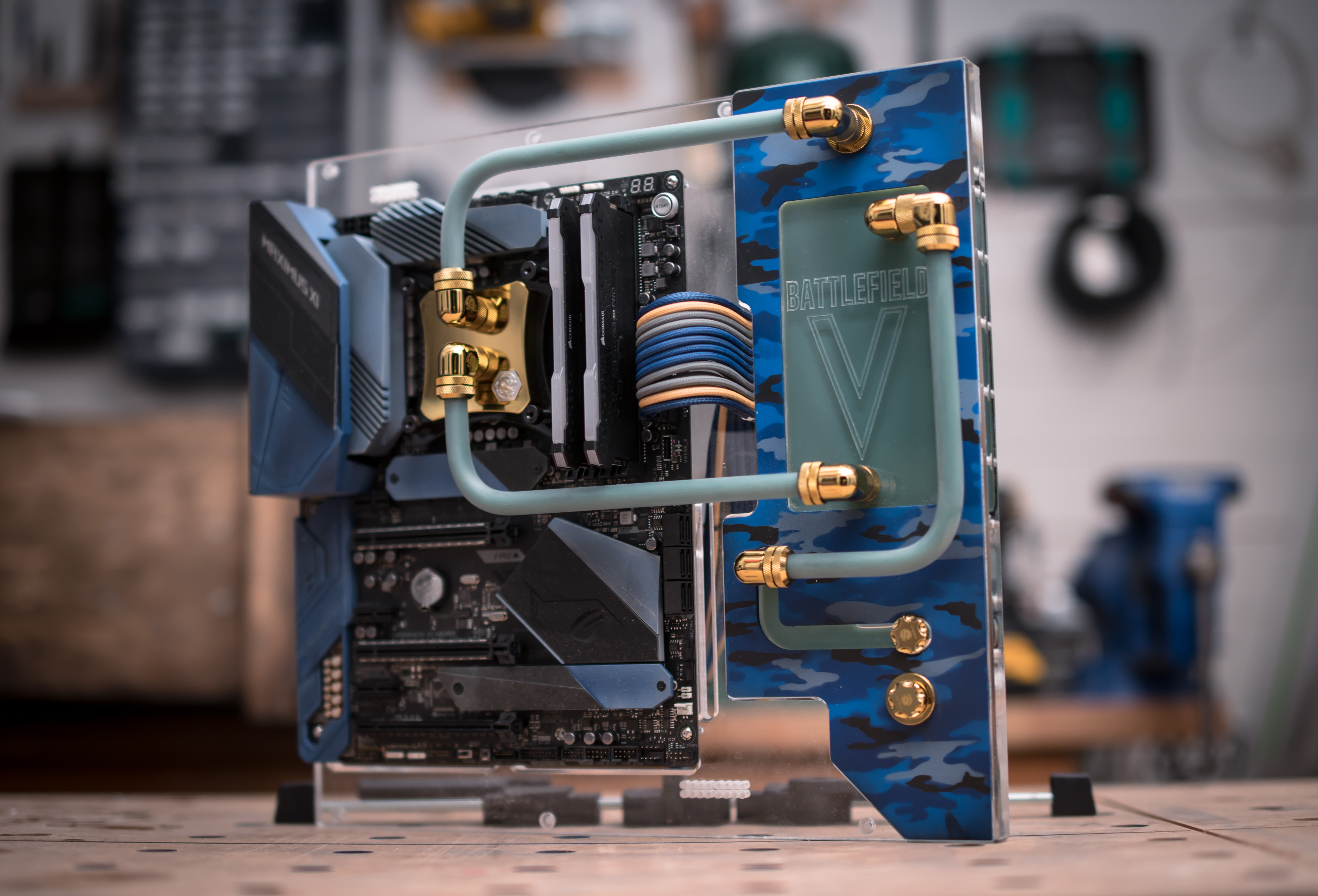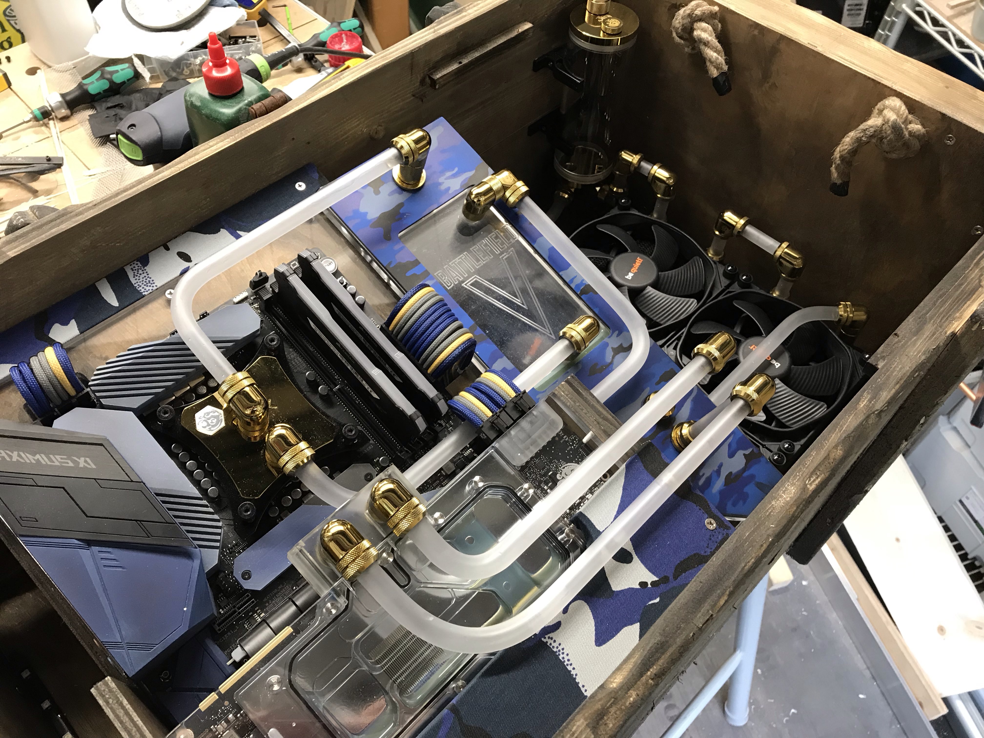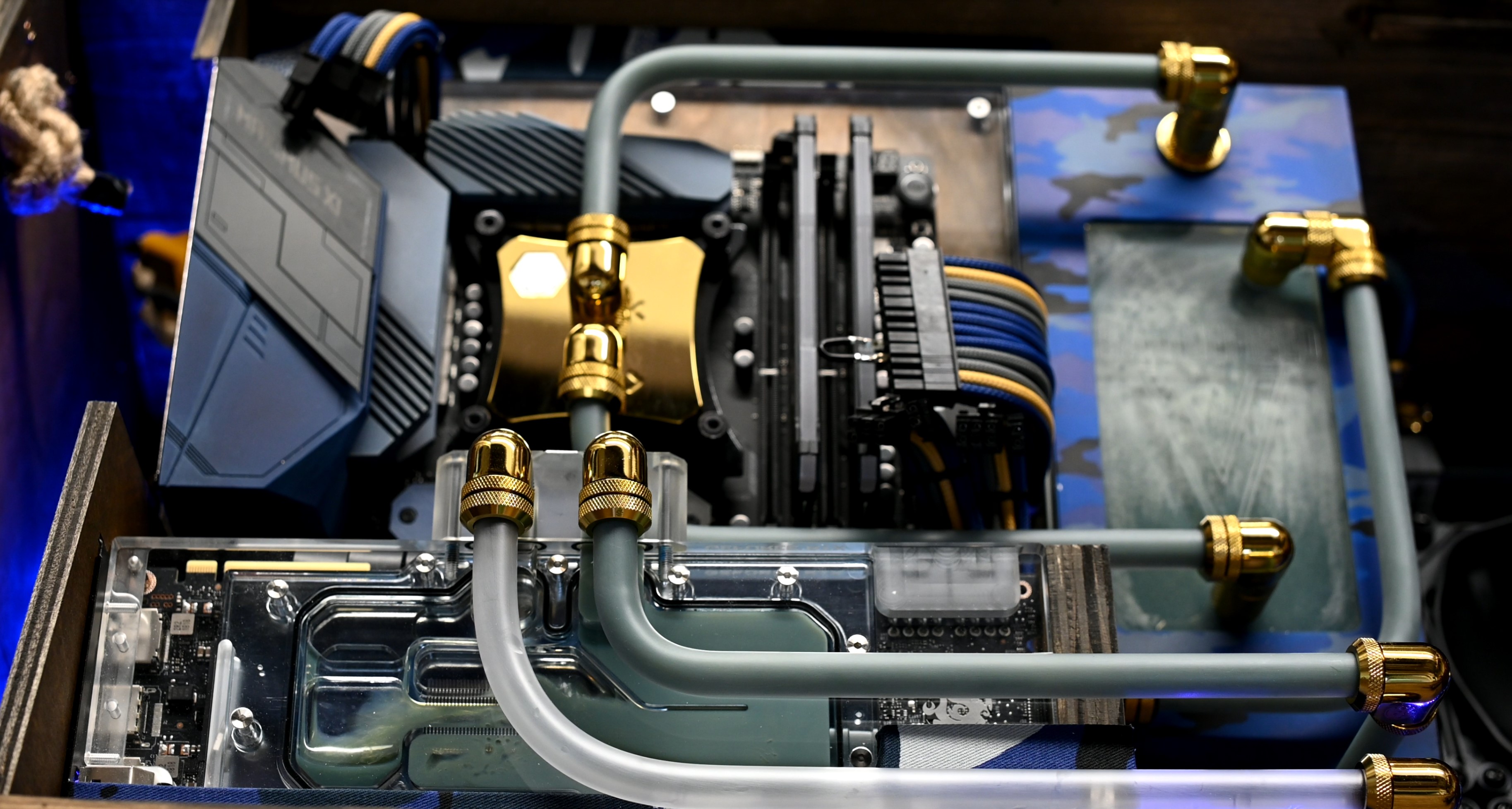 Finally all that was left was to fill, leak test, and bleed the loop. Mick at Mayhems kindly provided us with a special mix of Dark Grey Pastel coolant for the rig, and when set to a slightly teal hue it really complements the blues and greys found in the camouflage and on the motherboard. Lighting was a simple affair; we used a Corsair RGB LED Lighting Pro Expansion Kit, largely because it could be controlled from within the iCUE software alongside the Corsair Vengeance RGB Pro memory. The lights were set to a deep golden yellow, both to match the water-cooling components, but also to provide that warm, almost magical quality when you open the case (think Marsellus Wallace's soul).