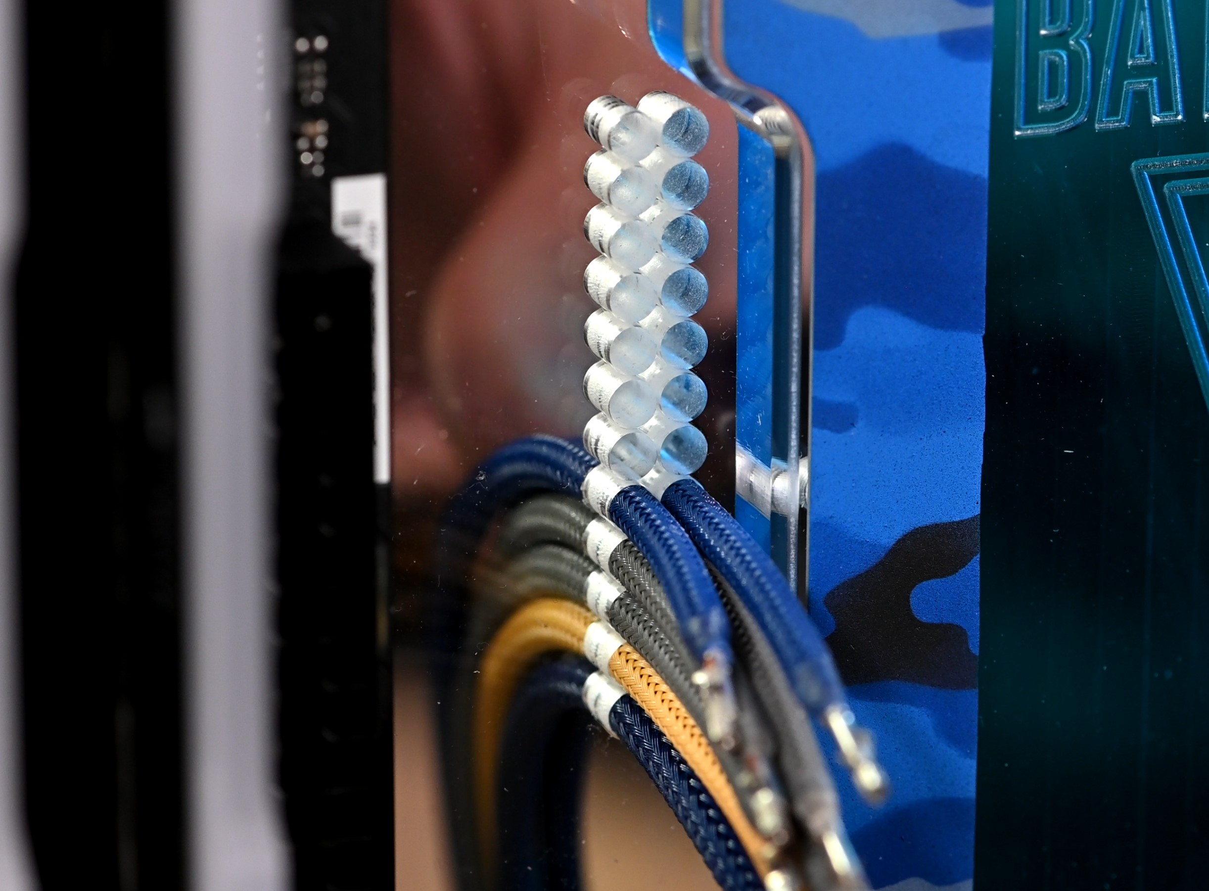 The GPU sits above the motherboard, connected with a flexible riser cable and held in place by a wooden bracket that screws directly into the GPU water block itself. That bracket ensures that the card is held very firmly in place and parallel to the motherboard, making connecting up the tubes a breeze. Speaking of tubes, it was time to work in the final community voting option: whether to use clear or frosted satin tubing. Frosted won by a landslide, so I set to turning the clear acrylic tubes to satin, following the technique outlined in our handy guide on the topic.