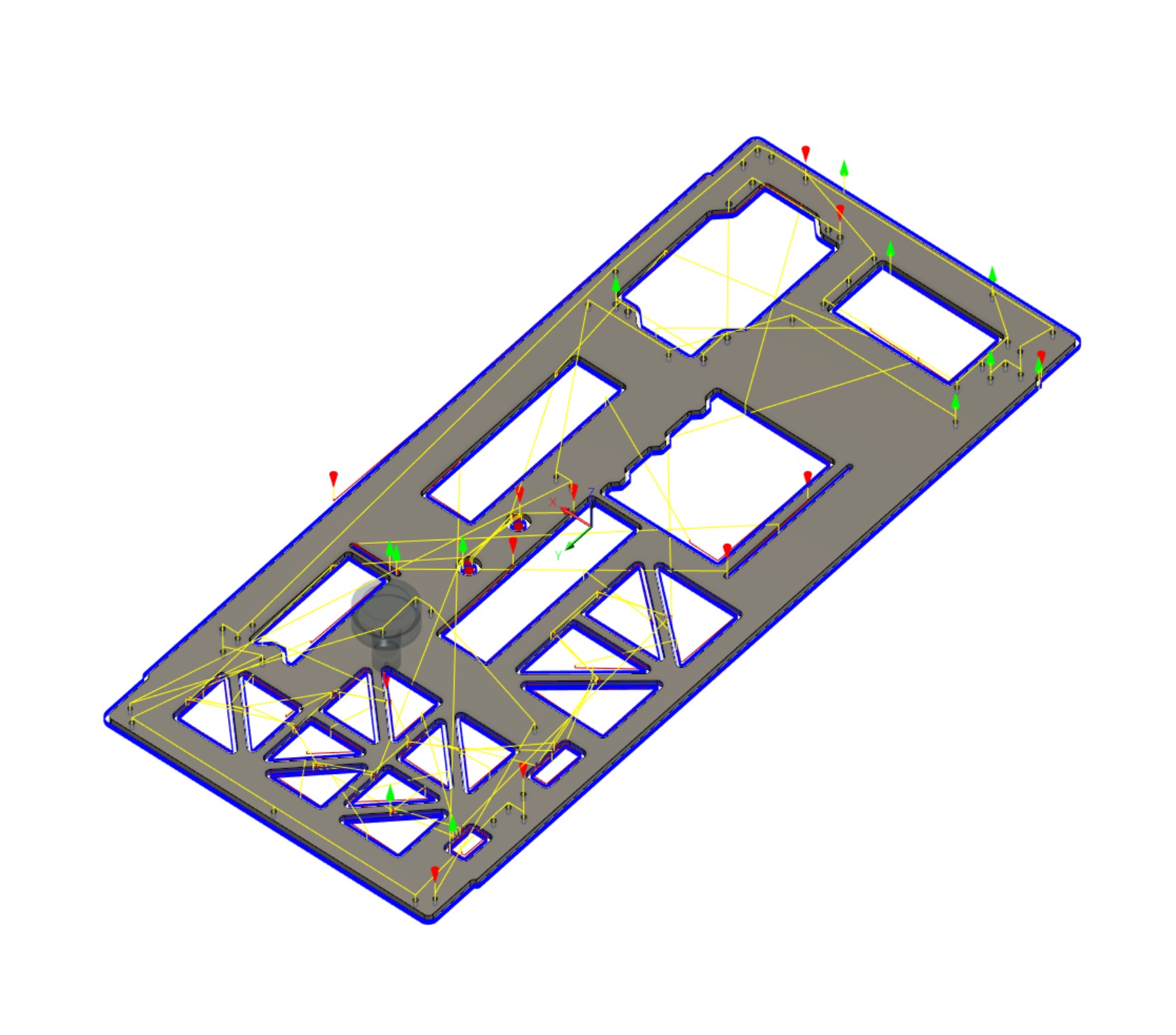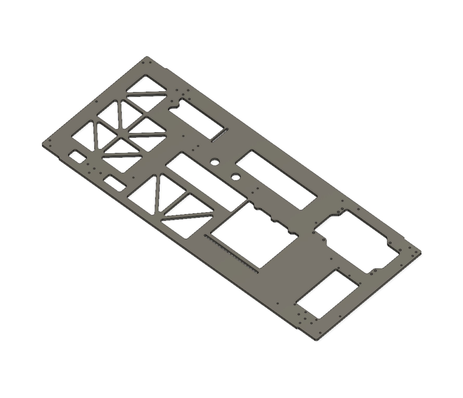 In addition to adding all the mounting points, I added some triangular cutouts to make the panel more visually appealing, they give it an engineered, braced look, even if they don't serve a real function. One issue though is that this is quite a lot of material to remove. I chose to slot-cut basically everything rather than use an adaptive toolpath to clear out the pockets. Slotting on a part like this was quicker but also less wasteful as I can reuse many of the off cuts in the future, rather than reducing them to chips. That said, this meant I had to dial back the depth of cut so as to avoid introducing chatter or clogging the flutes.