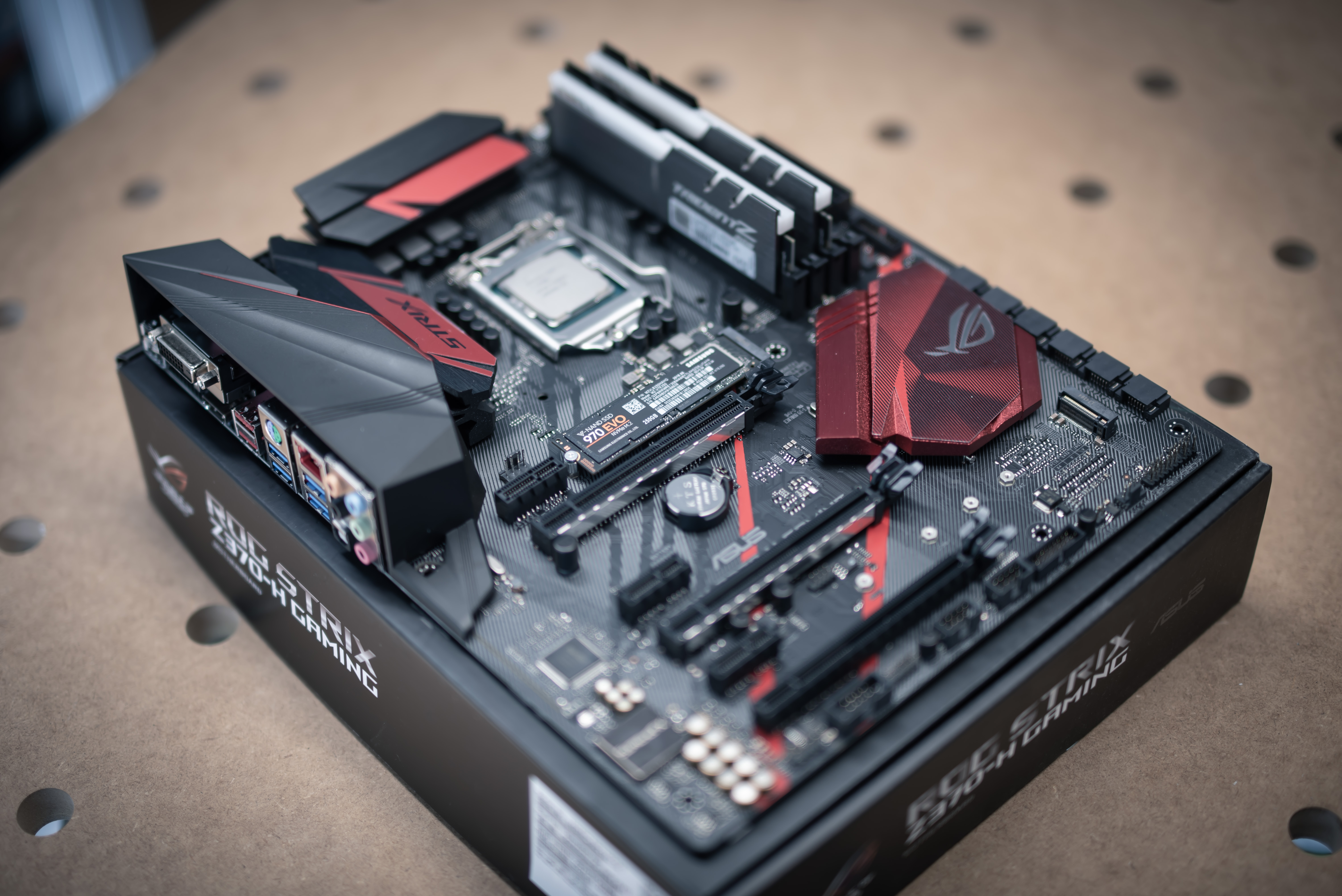 Well, as mentioned, the theme is Fortnite, but that's really not the easiest topic to work around given the style of the game. After considering the hardware, I figured it would be a good move to theme the build around a character skin from within the game, and I chose the Red Knight. The Asus Strix board is quite a vibrant thing, with red not only over the heatsinks but snaking onto the PCB itself too. It seems a sensible idea to work with that instead of fighting it in this case. Now, what about the aRGie Bargie? Well, the LED strips are RGB, but frankly we don't need rainbows for this build, which is handy since I chose RGB water blocks... Okay, I may not have noticed that this particular board doesn't even have RGB headers on it, but no biggie, let's just do it the old fashioned way.