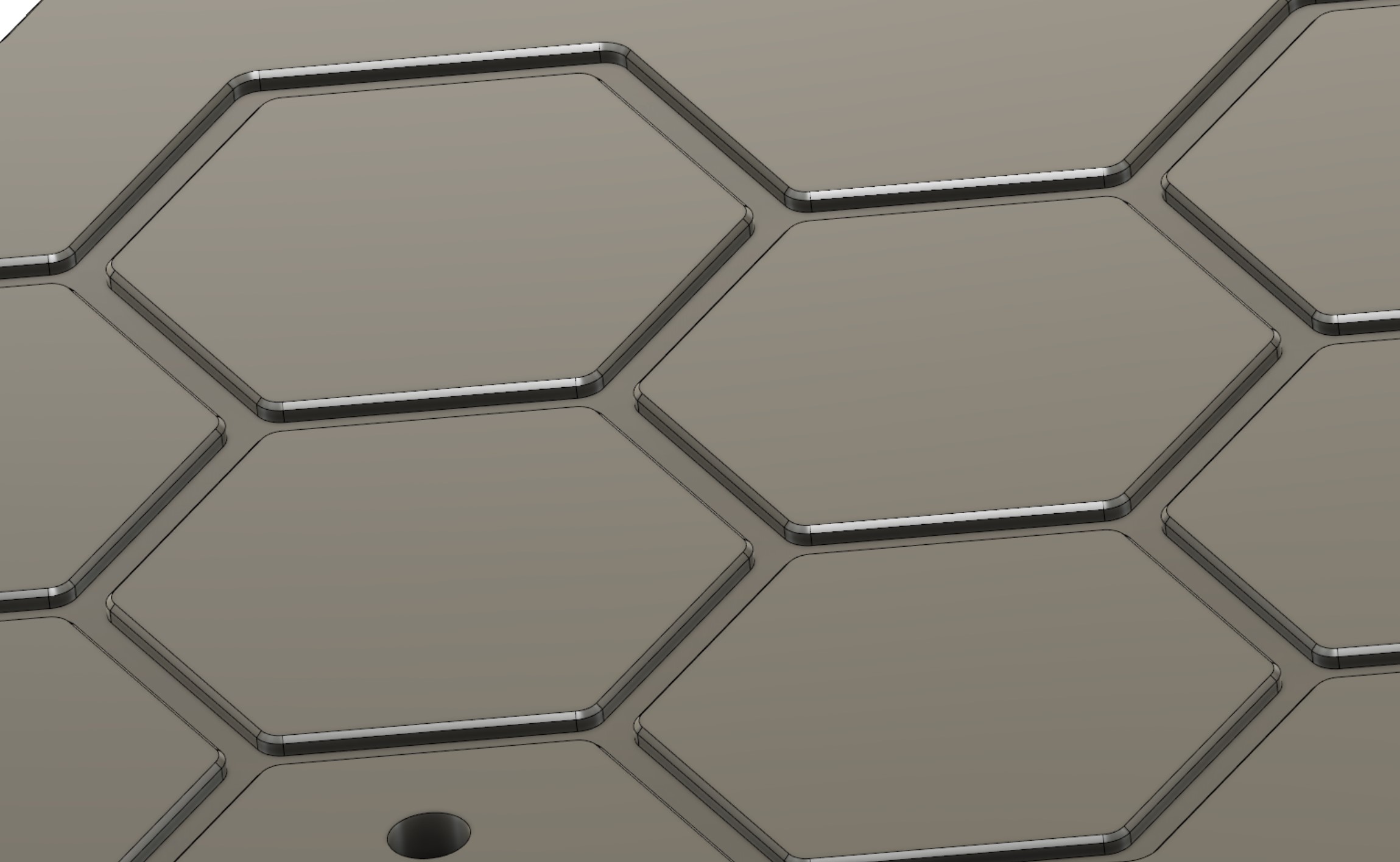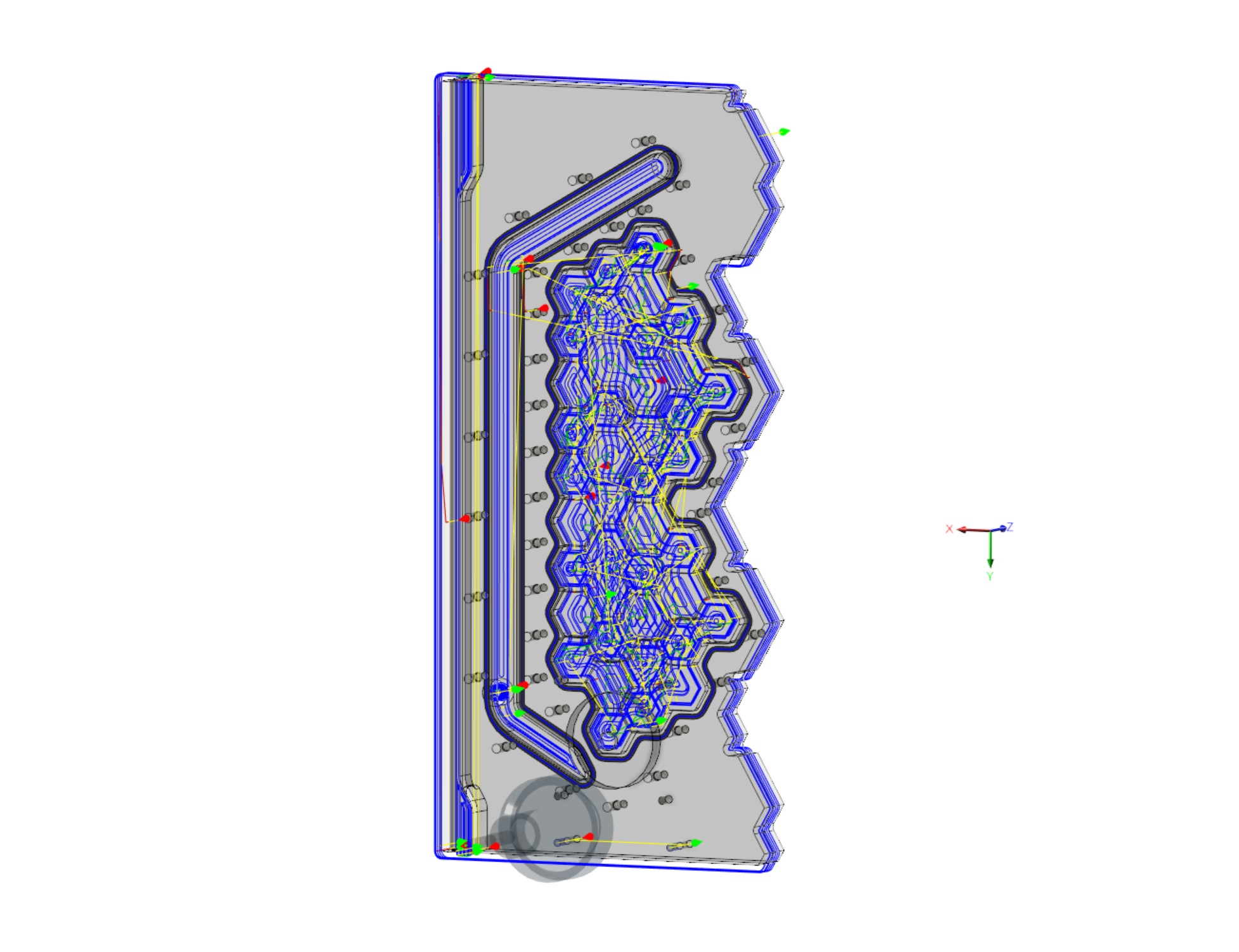 The CAM side of things was quite interesting. The pump-distro plate is a double-sided job, but is also a very simple one, so it didn't really require much planning. Of larger note was toolpathing the honeycomb pattern so that it would machine well. Again it's not really a complicated piece, but it's worth thinking about things like the order of operations so that the best finishes can be achieved. To do this, I separated the flat, depthing operations and the 2D contours, that way I can offset the height of the endmill a smidgen, preventing it from marring the surface finish of the parts as it trims up the edges.
