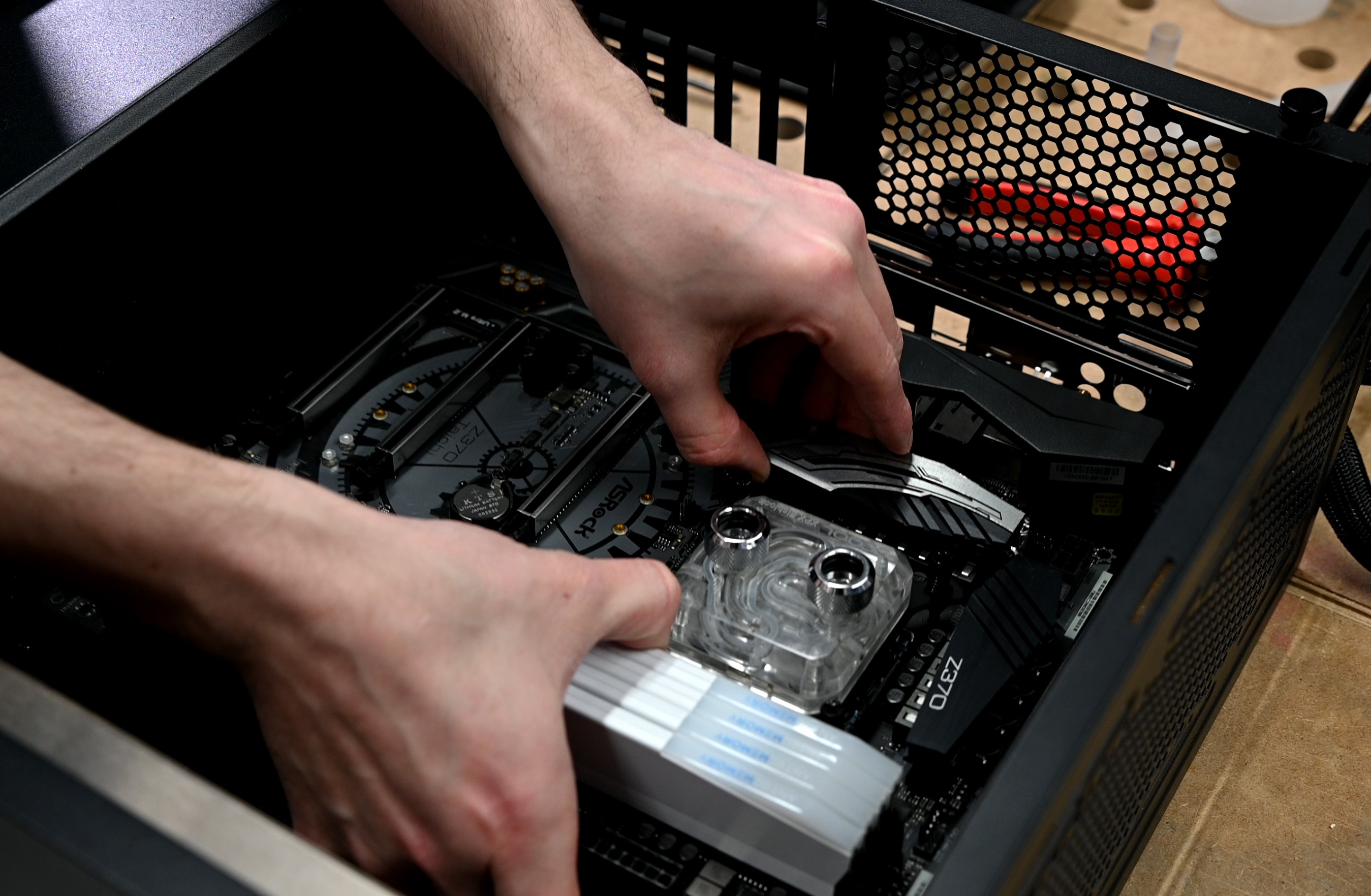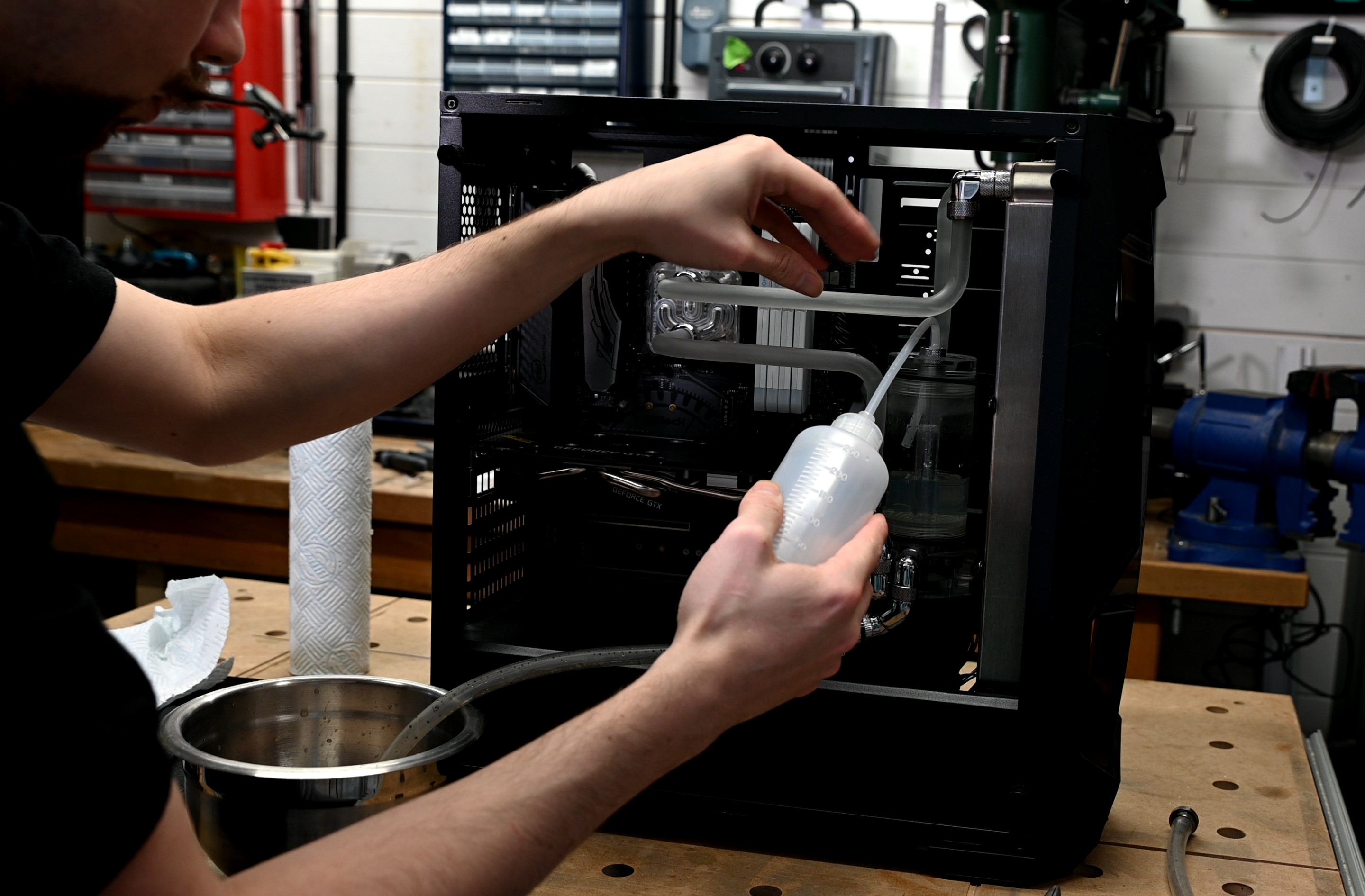 No matter, this is one of the typical difficulties with a hardline loop, since you can't simply remove the water blocks in situ. To get around this, I used a fill bottle with a long tube to siphon the coolant out through the top of the reservoir via the fill port. Once enough of the liquid was gone, it was then possible to remove individual tubes and flush out the majority of the coolant.