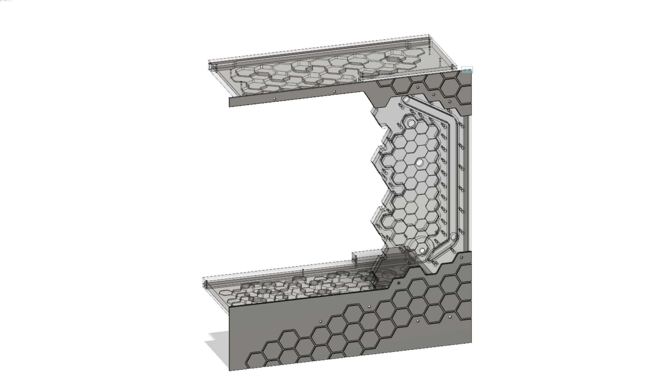 Theme-wise, honestly I just wanted to do something with a honeycomb pattern. There's no real rhyme nor reason to it; it's a nice pattern that's popular for a reason, plus it threw in some interesting possibilities for working it into the acrylic. So taking that and the measurements, I hopped into Fusion 360 and came up with this plan.