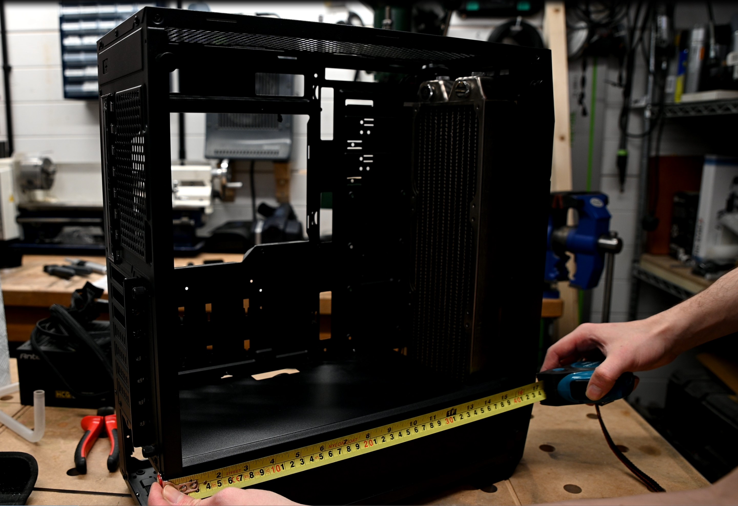 The case has a decent PSU shroud built into it, so it made sense that I should keep that there. Since this is very much a budget chassis, that decision also has the added benefit of greatly increasing the structural rigidity of the case, as the motherboard tray is riveted to it directly. So rather than remove it, it made more sense instead to mount any additional pieces on top of and around it.