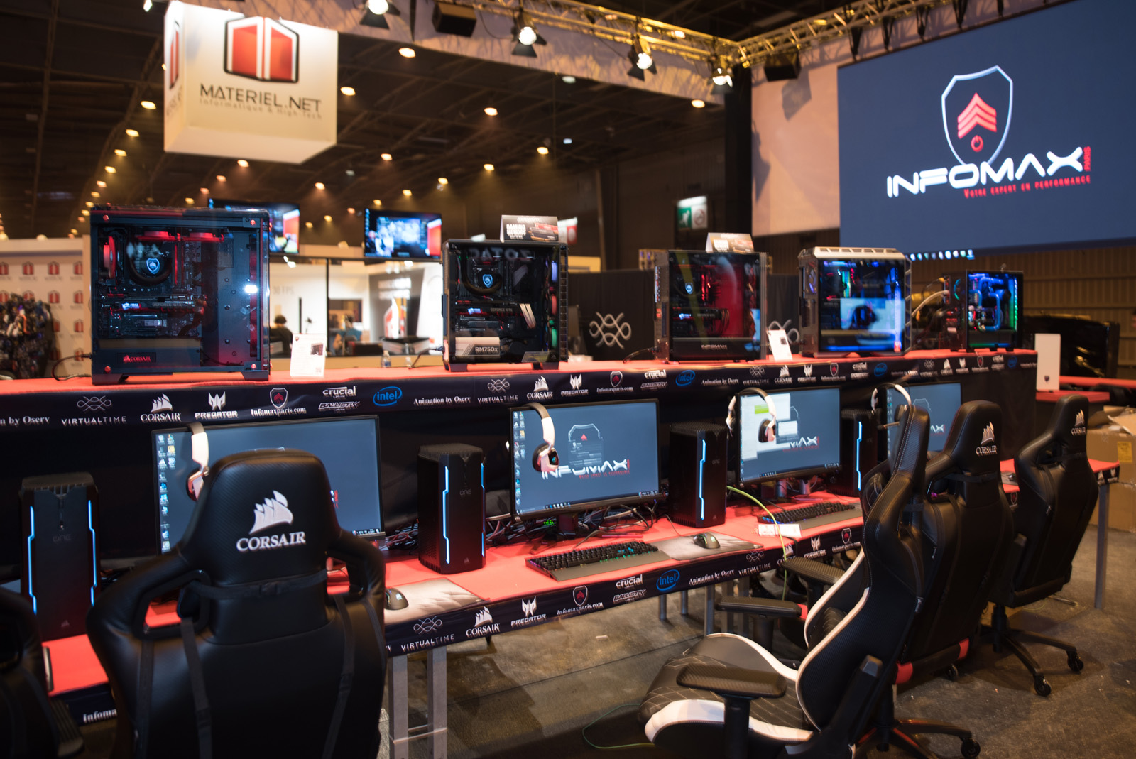 Across from the LDLC stand were Infomax and Corsair, rocking suites of demo PCs and live gaming feeds.
