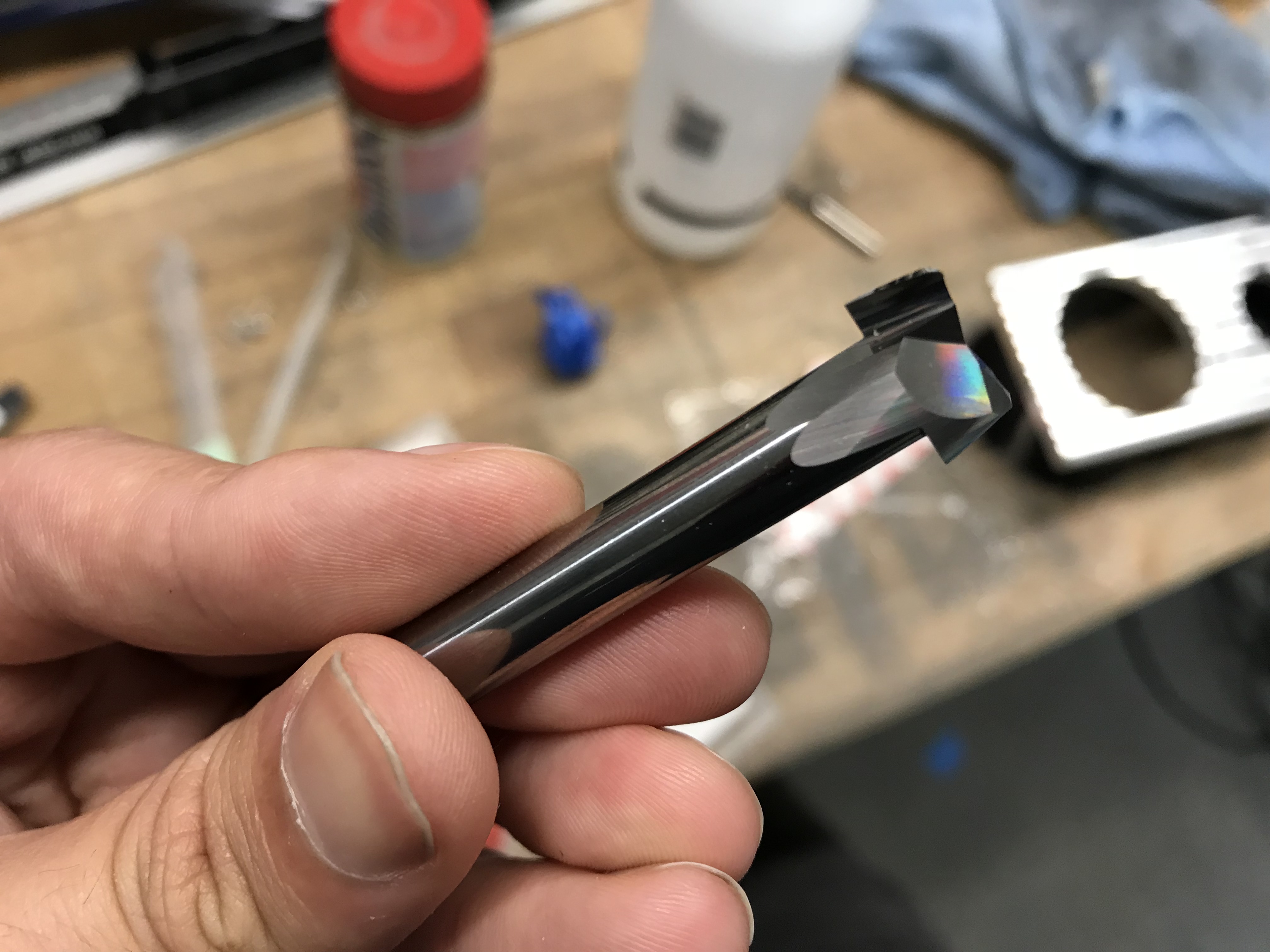 As with the larger blocks, I went with a 2mm o-ring for the interior sections, for this I used a 2.2mm-wide channel cut to a depth of ~1.3mm. The double-sided OPs were handled via the super glue method and located with pins. Tooling wise, I tried to keep things simple, using the 14mm polished edge radius mill for facing, followed by a 2mm single flute for the o-ring channels. The main channels were roughed with a 6mm single flute and then finished with a 4mm polished edge single flute (the top corners are a 2mm radius, so I couldn't use the 6mm). Thread milling was handled with a 2mm Datron thread mill cutter along with a Whitworth 6mm thread mill for the G1/4" ports.
