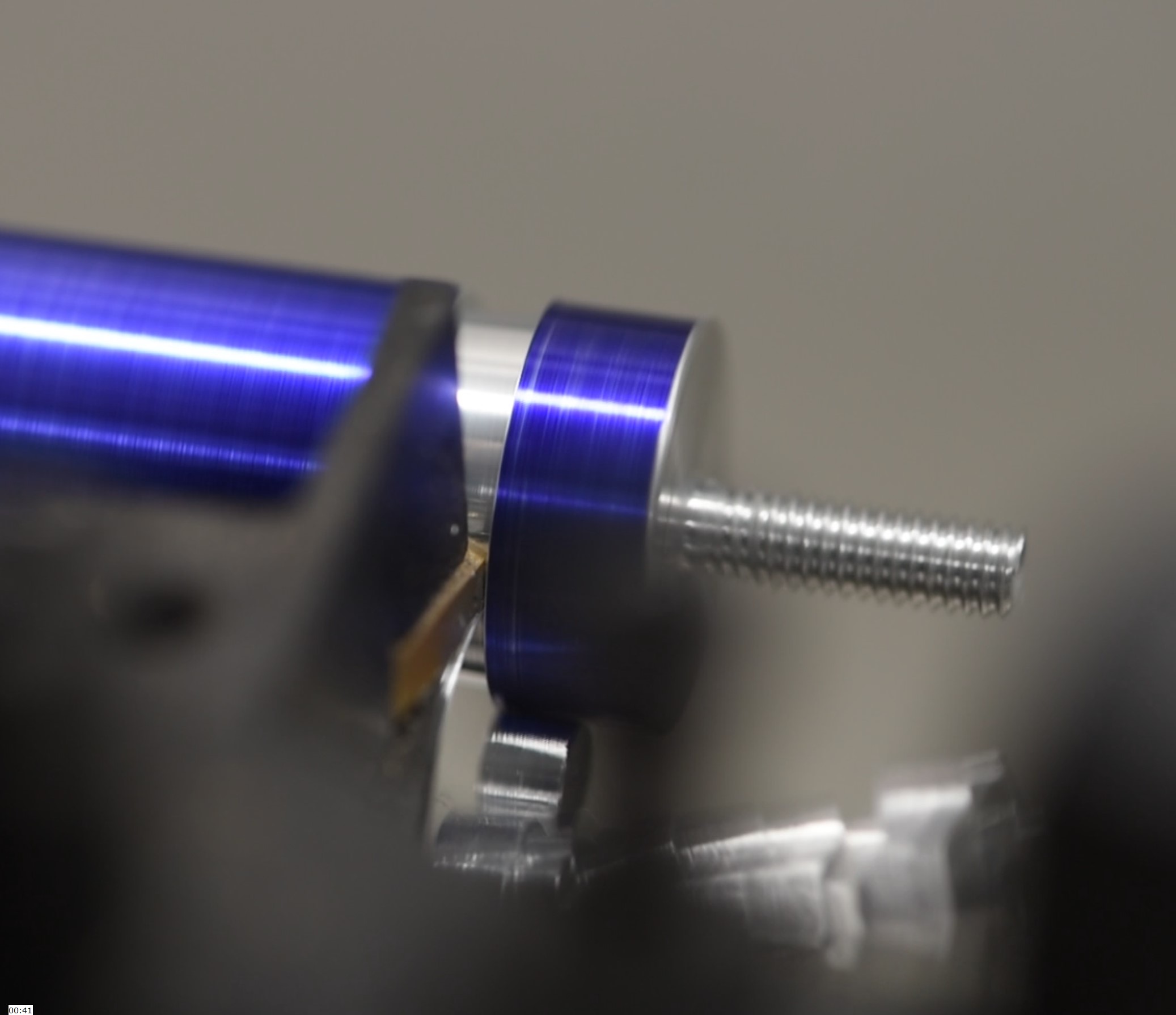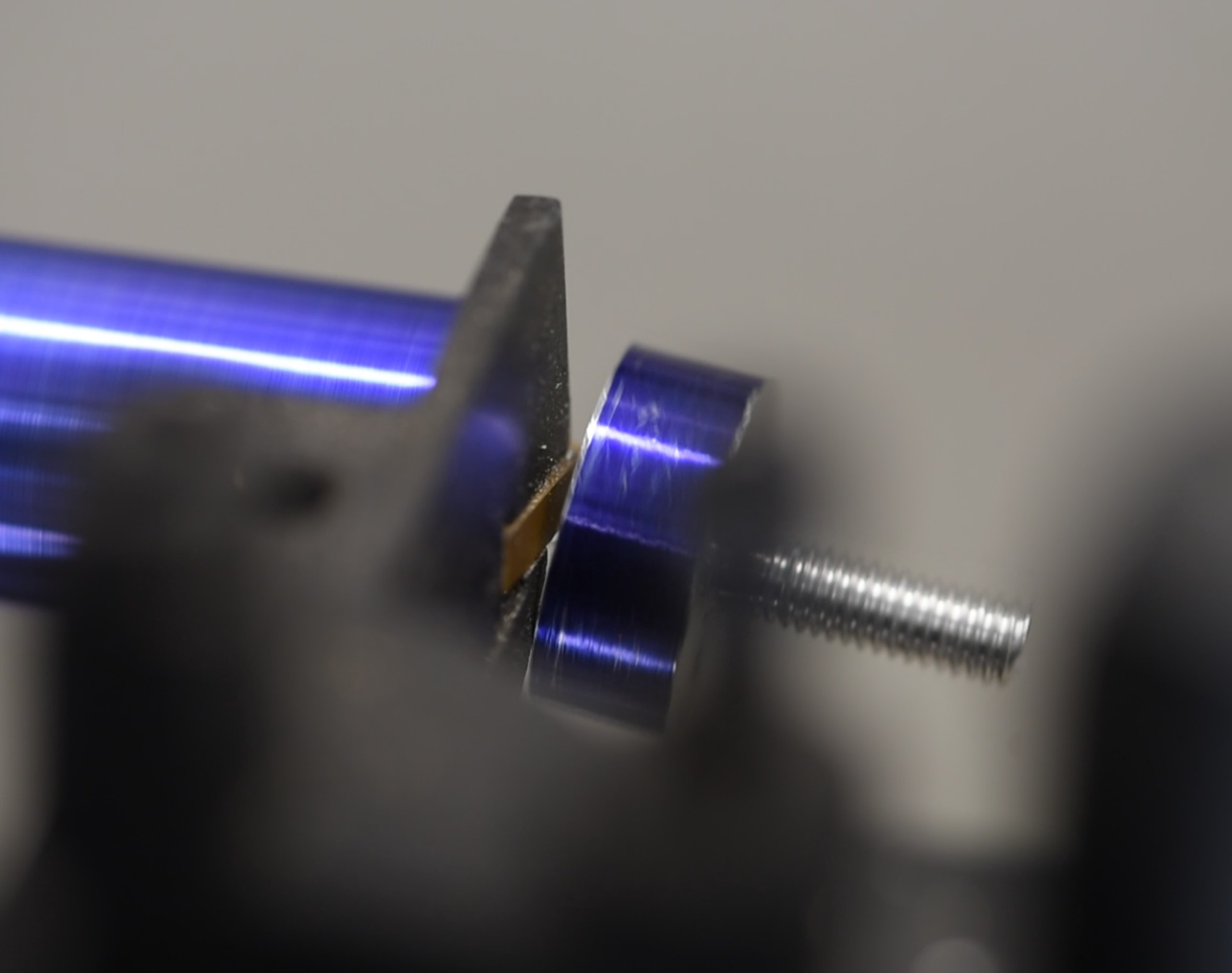 With the thread cut, all that was left was to part it and move onto the next one. Handy tip for doing this on a mini-lathe: If you use the parting tool upside down and with the chuck feed going clockwise (as opposed to anti-clockwise like normal) then it reduces chatter massively, resulting in quicker, cleaner cuts.