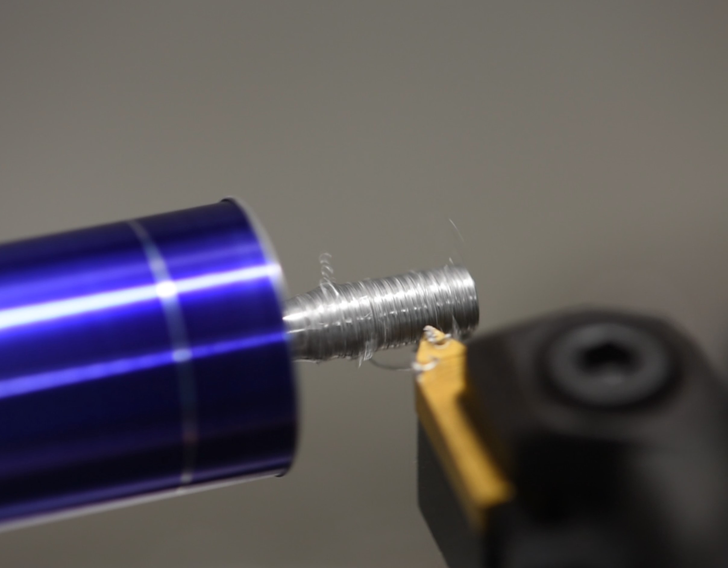 I turned down the section to 3.9mm, then faced the shoulder to make it flat. The thread only needs to be present on the first 8mm of the part, so the very end is left nice and smooth. I set the machine for thread cutting at a 0.7mm pitch, then used a number of small passes to progressively remove more material. Aluminium is soft, so it's not ideal for this sort of work; I had to be very conservative with the feed on this one to avoid stressing the turned section too much.