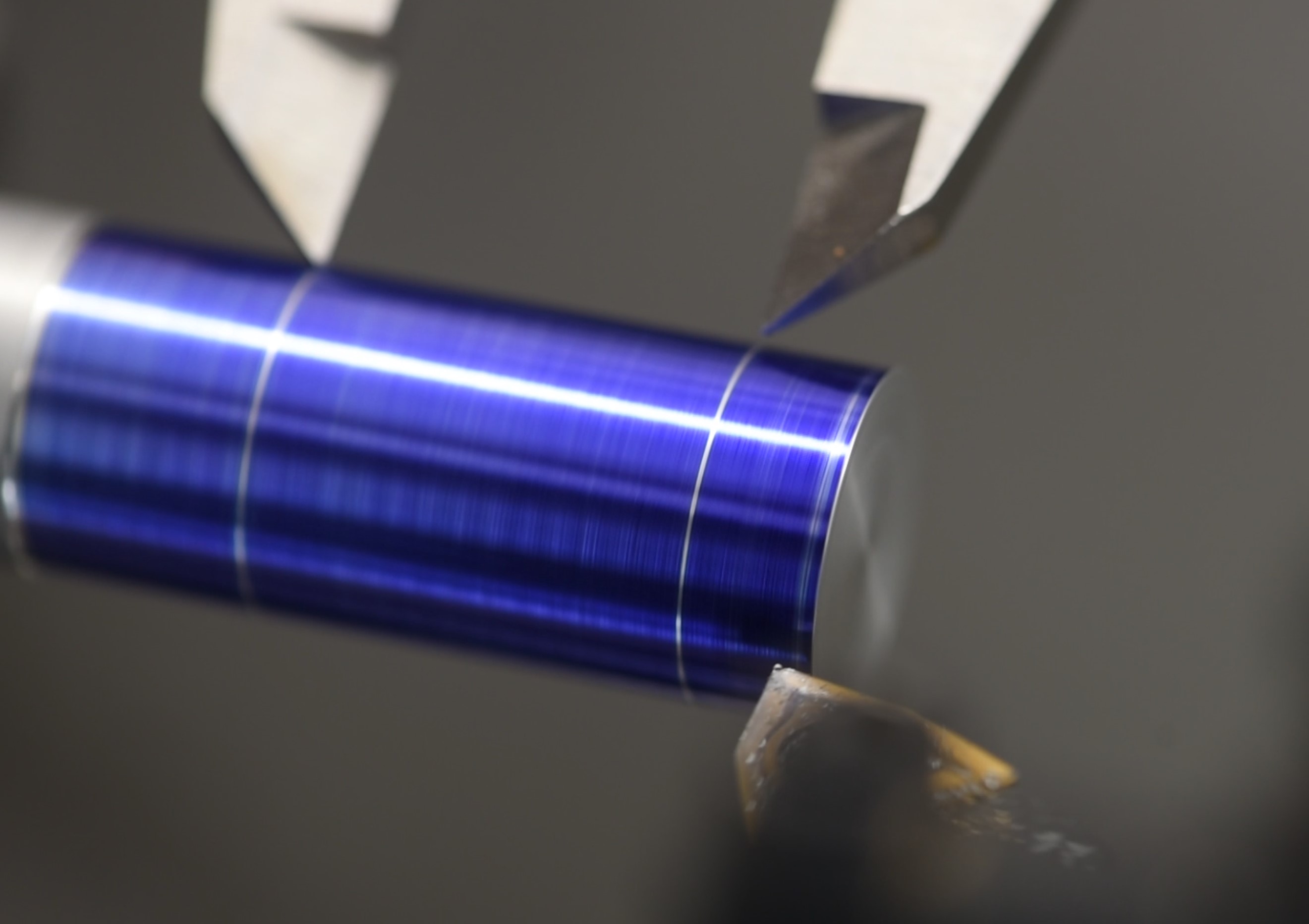 Next up is simply parting the piece. Like before the chuck was spinning in reverse with the tool upside down. I used a dial indicator to help ensure that the stock was properly seated in the chuck again. Since I want the spacer to be 20mm long, I took care to measure the part and approach slowly. Once parted, the tailstock chuck was engaged and prepped for drilling.