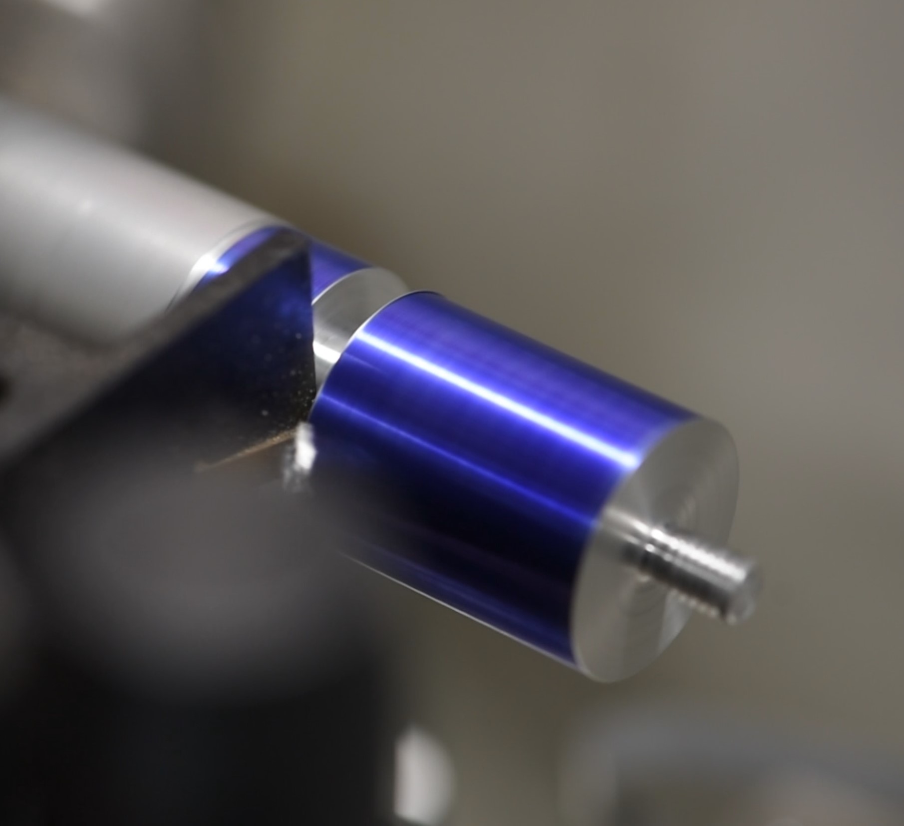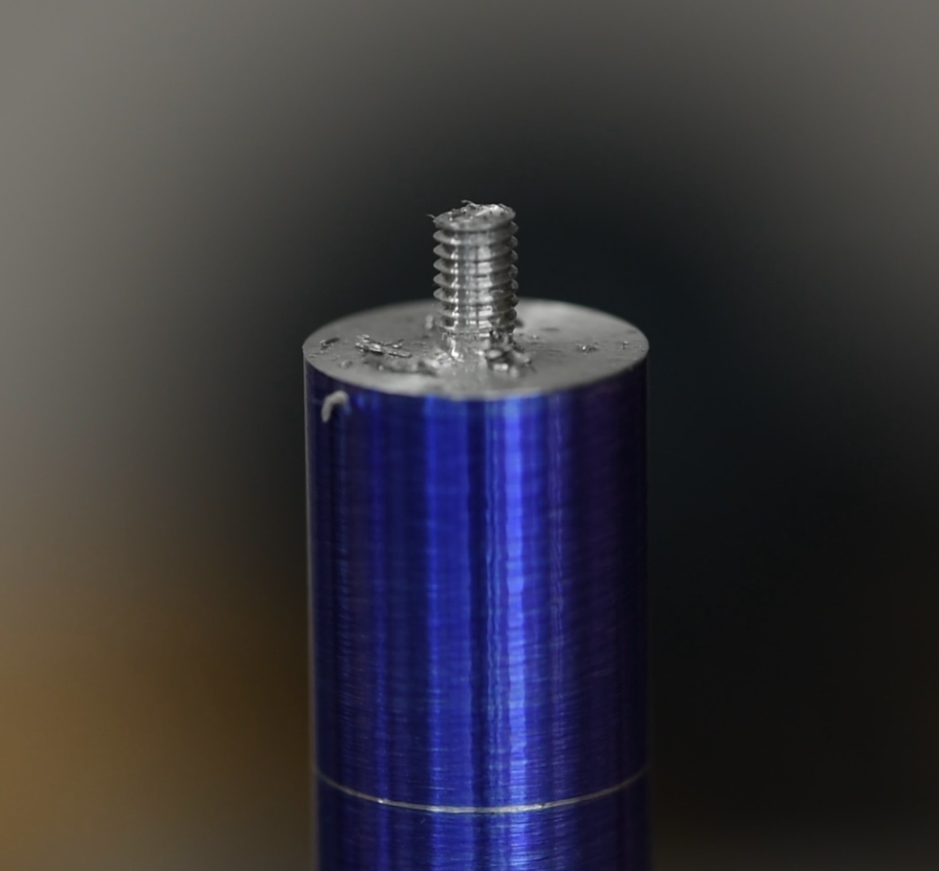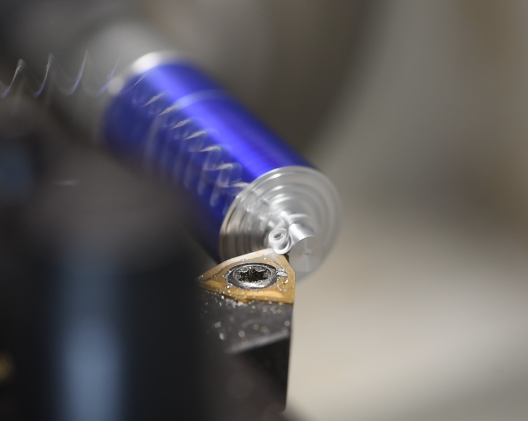 The final step is to tap the hole itself. This could be done outside the lathe but I figured it made sense to just do it with the piece still in the chuck. I put a 4mm tap into the tailstock chuck, then disengaged the clamp so that the tailstock was free to move along the length of the machine. Next I simply pushed it to the workpiece, lubricated, then manually rotated the chuck back and forth whilst maintaining gentle pressure on the tailstock. Moving the chuck like this pulls the tailstock towards/away from the workpiece and results in an accurate tap. You could try chancing it with a very low rpm setting but doing it by hand allows you to feel what's going on; the last thing you'd want is to snap a tap.