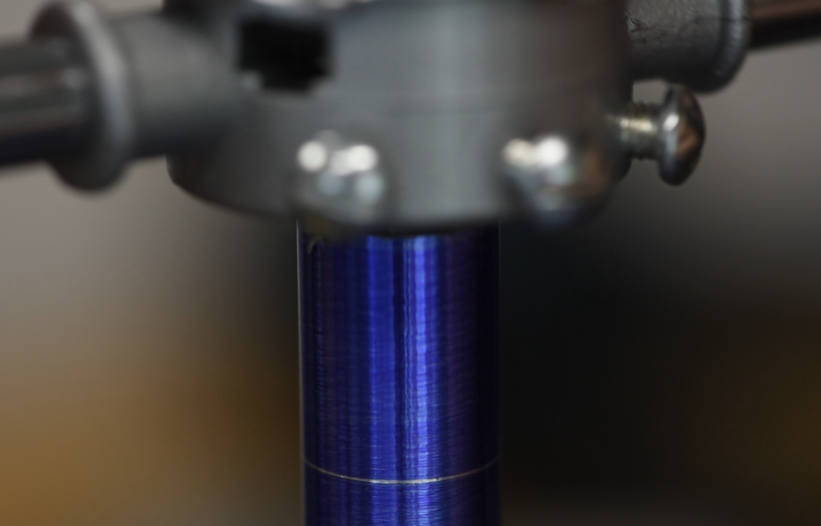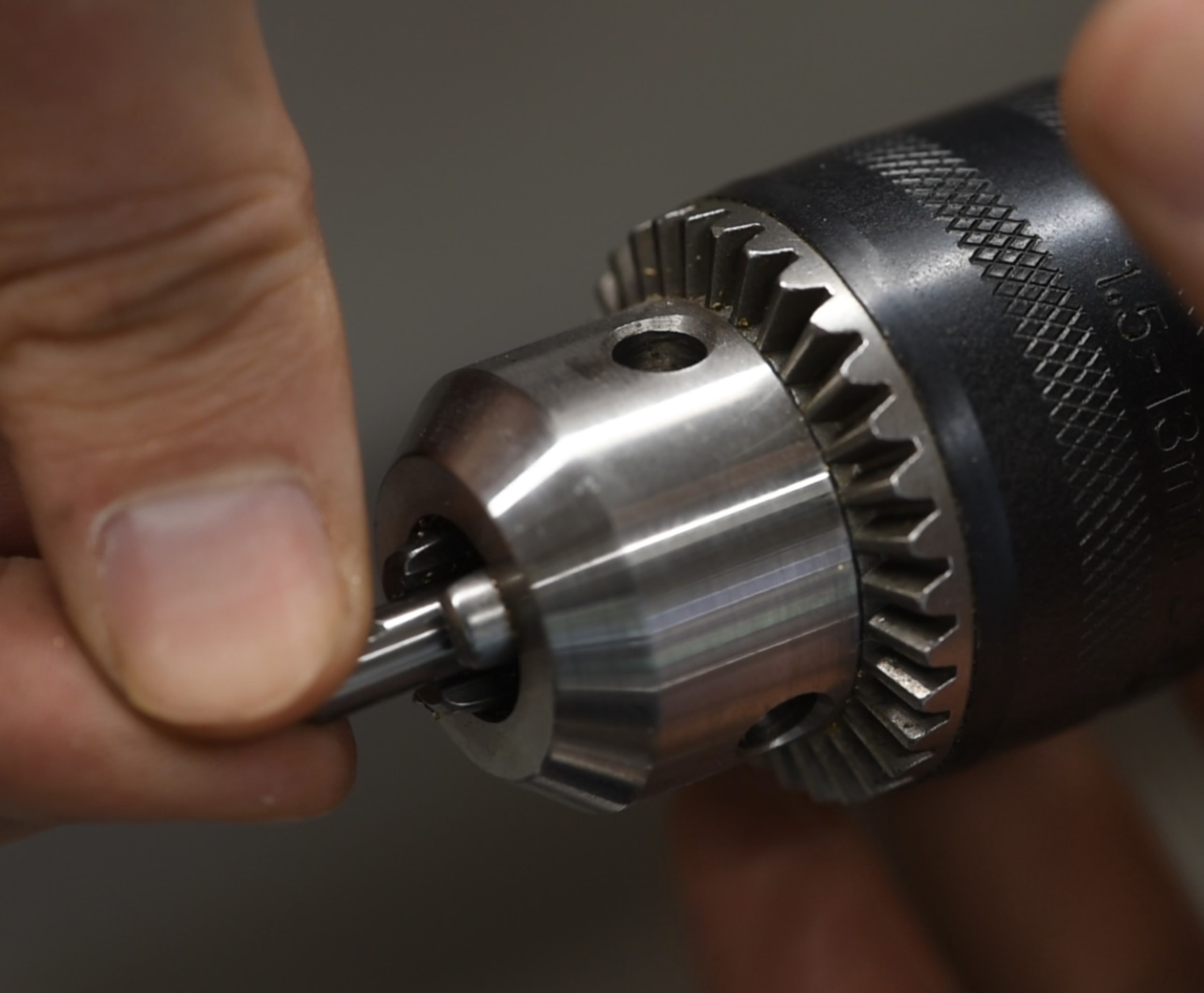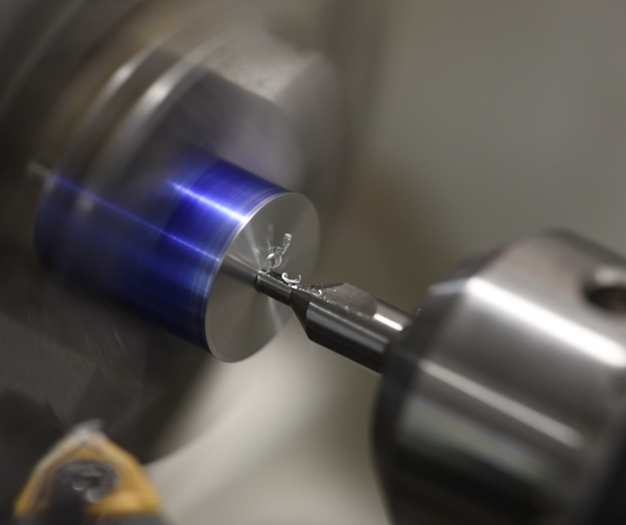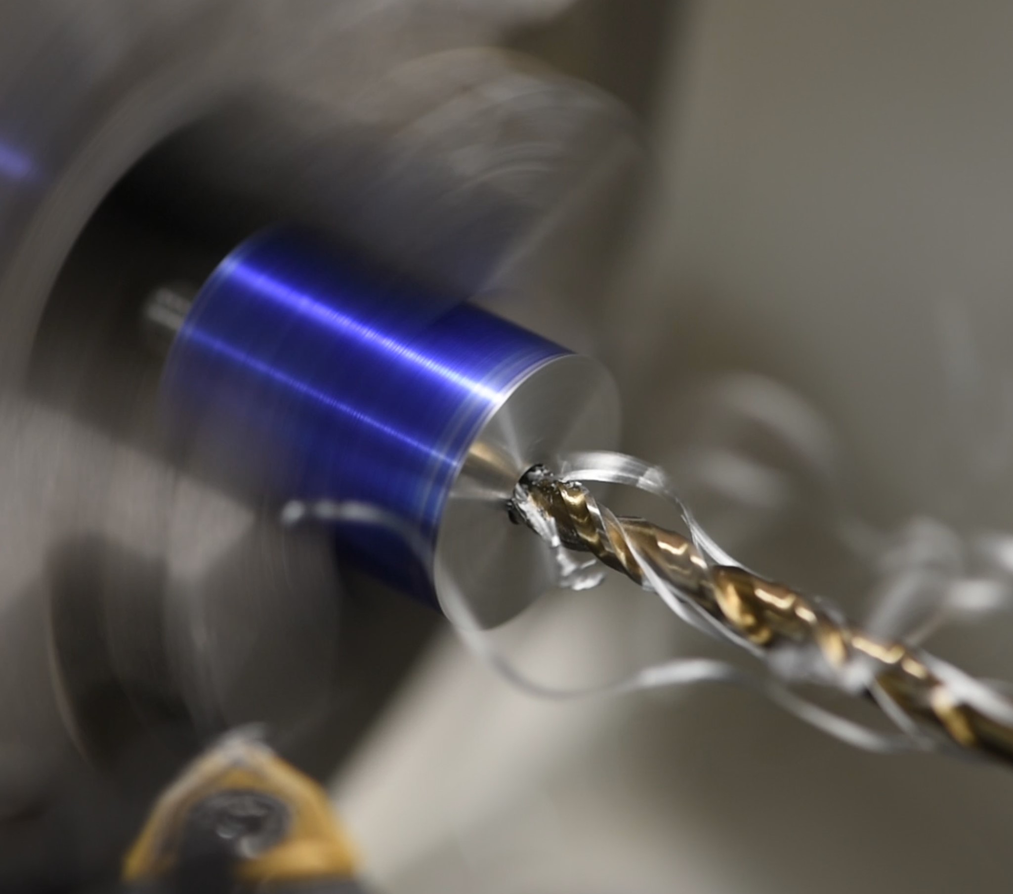 The final step is to tap the hole itself. This could be done outside the lathe but I figured it made sense to just do it with the piece still in the chuck. I put a 4mm tap into the tailstock chuck, then disengaged the clamp so that the tailstock was free to move along the length of the machine. Next I simply pushed it to the workpiece, lubricated, then manually rotated the chuck back and forth whilst maintaining gentle pressure on the tailstock. Moving the chuck like this pulls the tailstock towards/away from the workpiece and results in an accurate tap. You could try chancing it with a very low rpm setting but doing it by hand allows you to feel what's going on; the last thing you'd want is to snap a tap.