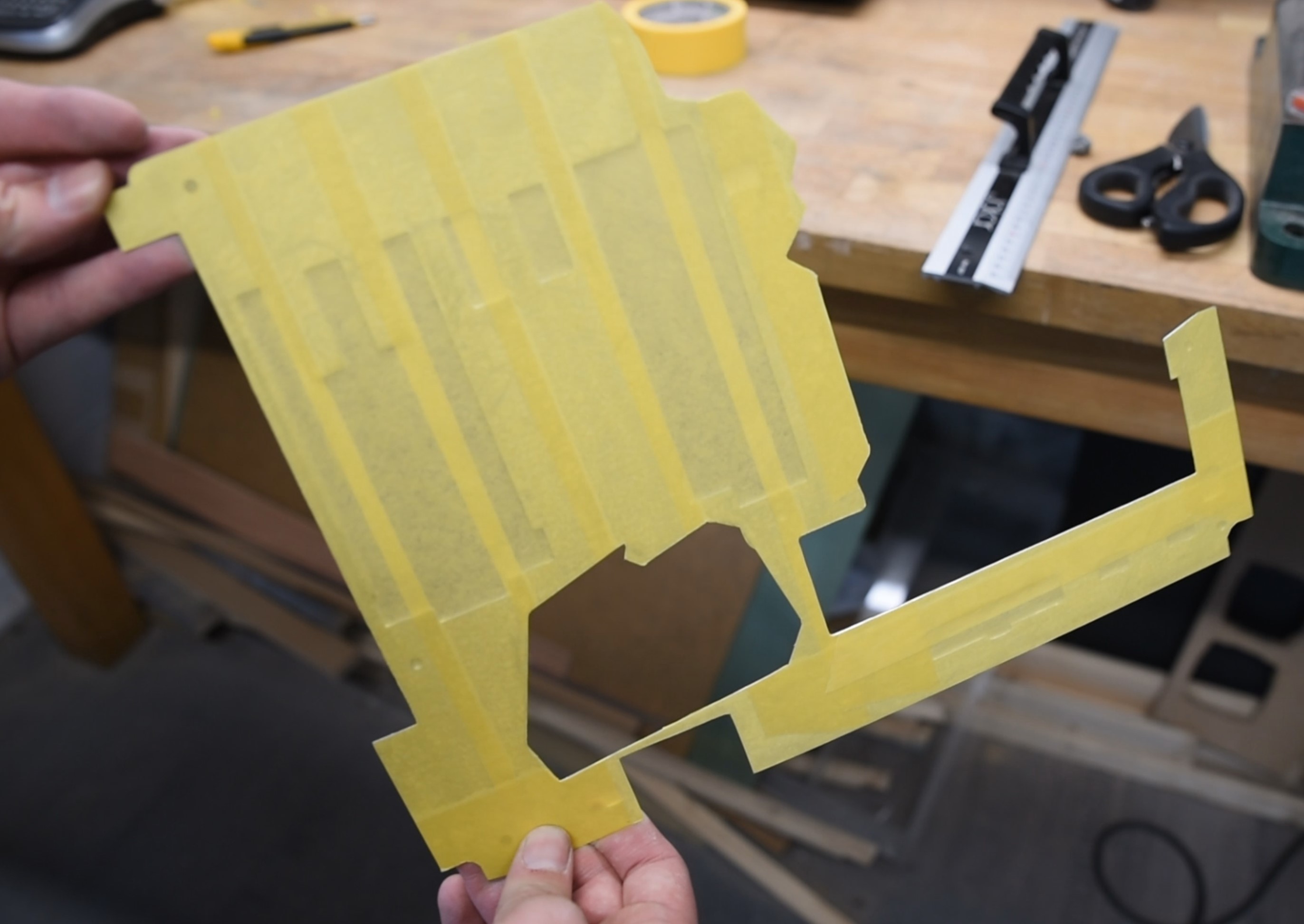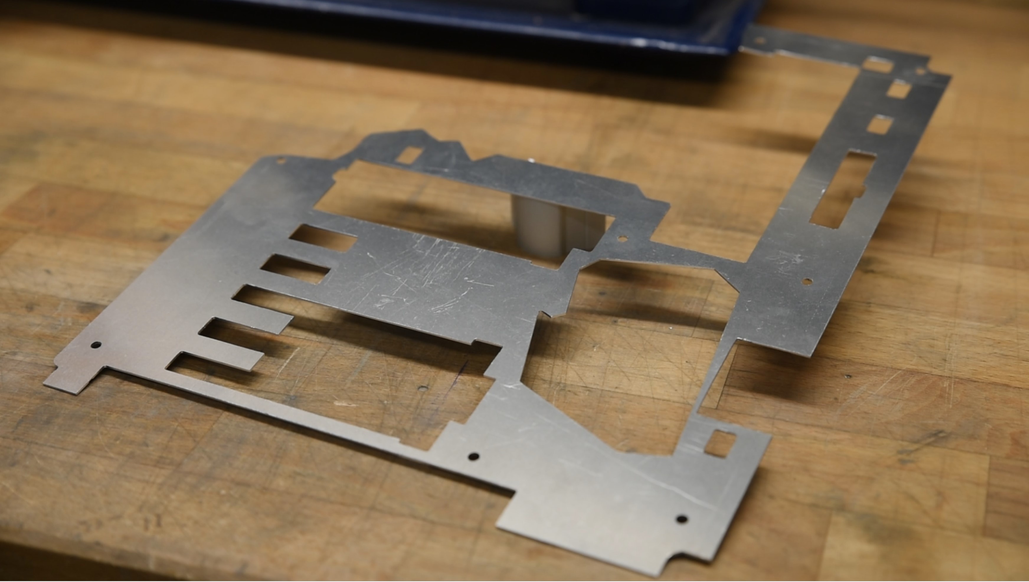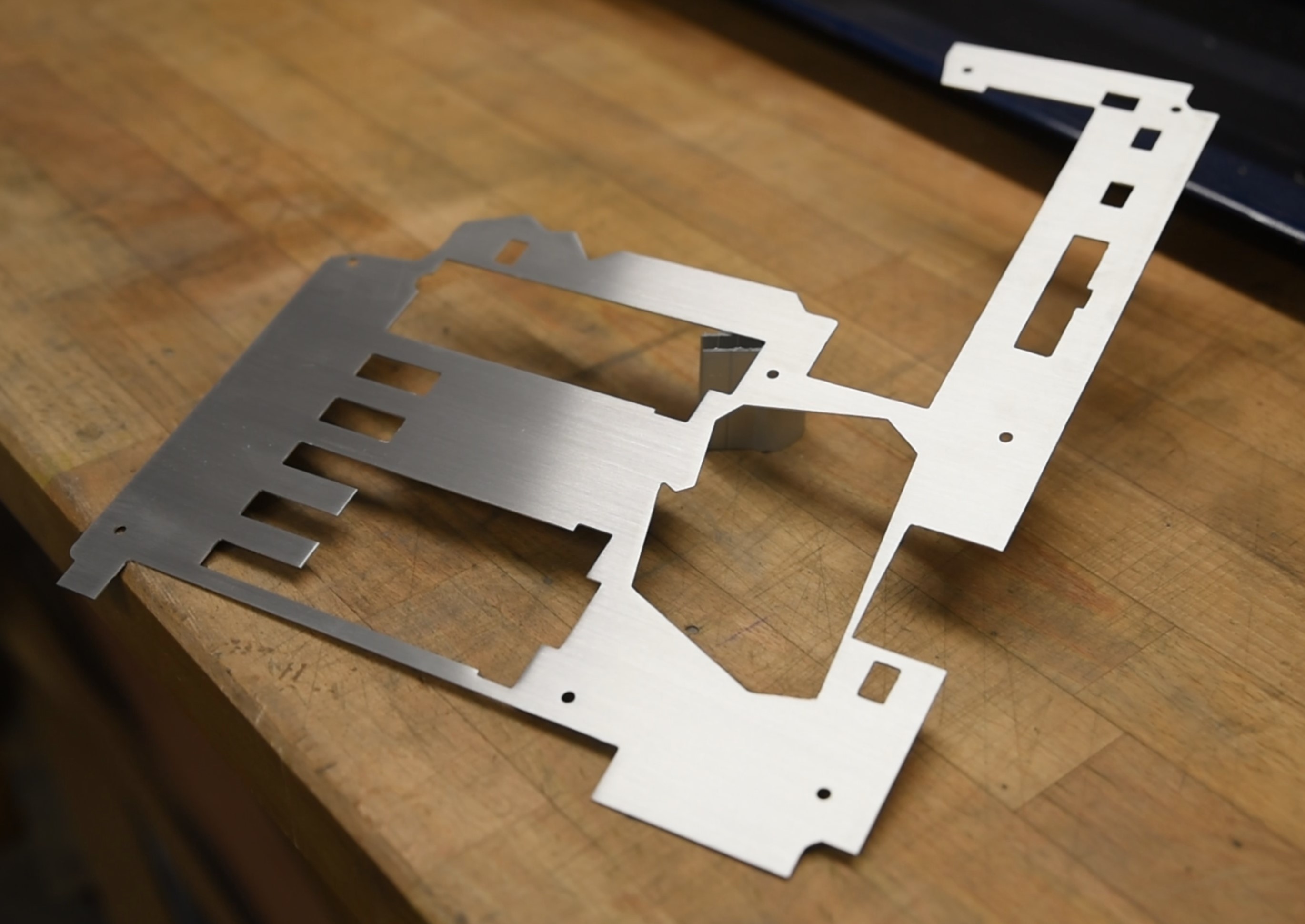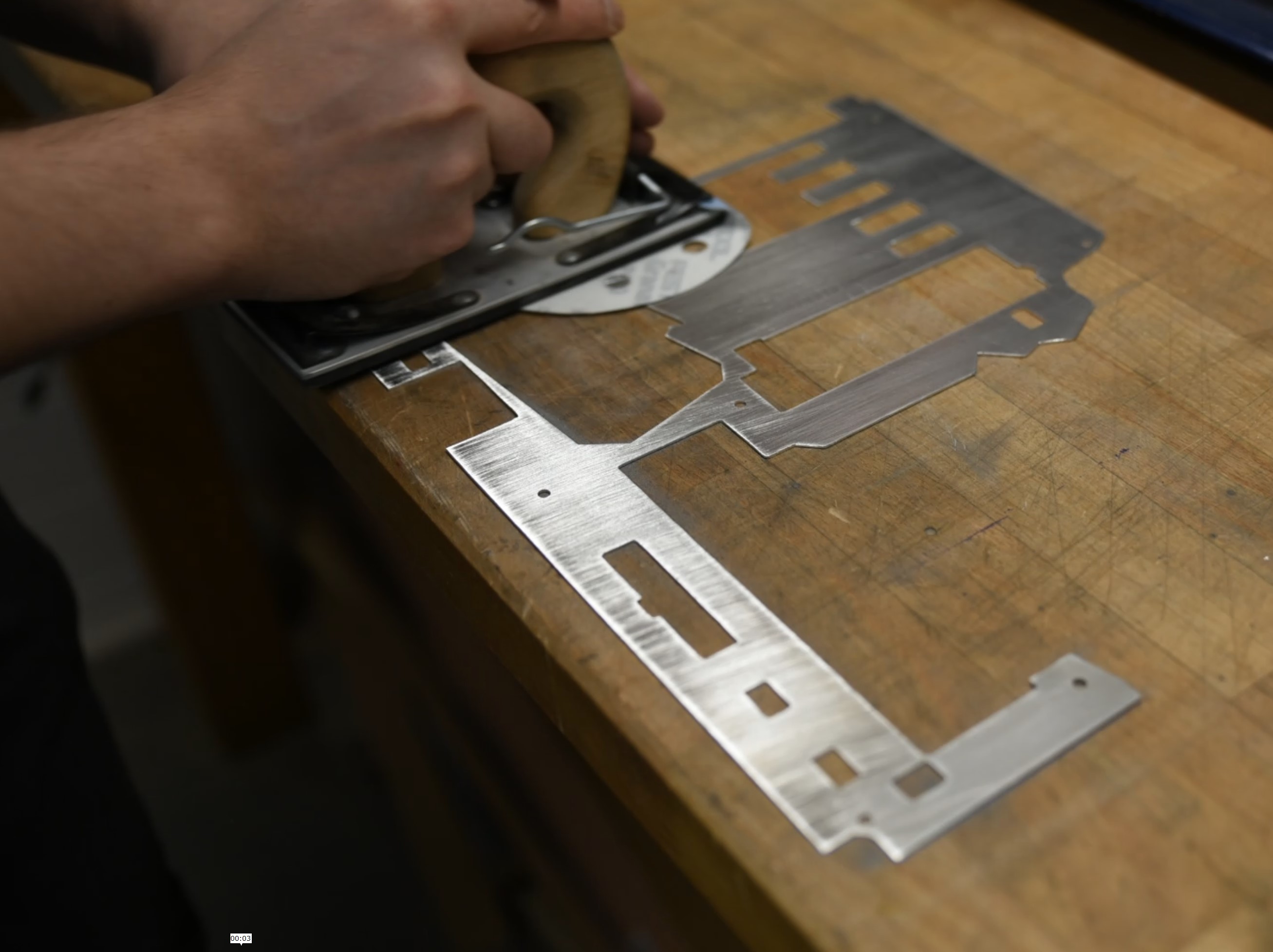 That said, of course we're nowhere near done yet. As with hand work, the cutting is only beginning: We need to finish this up to get it up to par. To do that, it was taped to the bench, and then using a hand sander I went at it with 320- and 500-grit papers following one direction to give that brushed look. I went at it with a bit of 6k polish too just to bring out the sheen a little more.