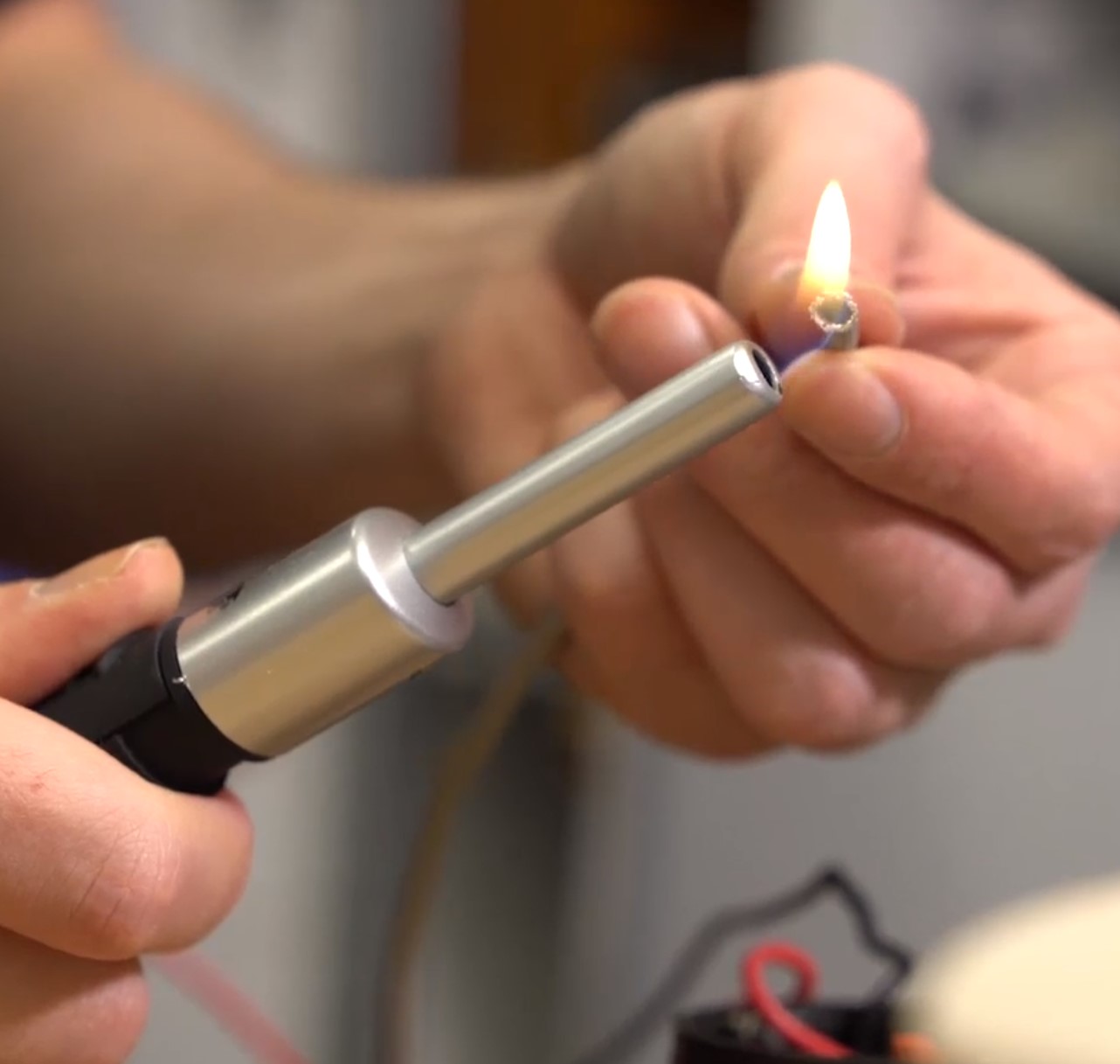 Following the 'heatshrinkless' sleeving method, place some heatshrink on the ends of the wire by the pins, then slightly burn with the lighter. By burning the heatshrink, it constricts but also melts the sleeve underneath, leaving a well-formed cone of melted plastic just behind the pin, this provides ample support for the sleeving material when you pull on it. You can either rip the heatshrink off the end with some pliers or slice it and peel off. I've definitely become a fan of the slicing method recently, as it means you can remove the heatshrink when it's cool, which tends to leave a really pretty melted cone. It's also not really much slower; if doing a big cable like a 24-pin, you can heatshrink all the wires in one go, then remove the shrink in one go without swapping tools and so on, like a small production chain.