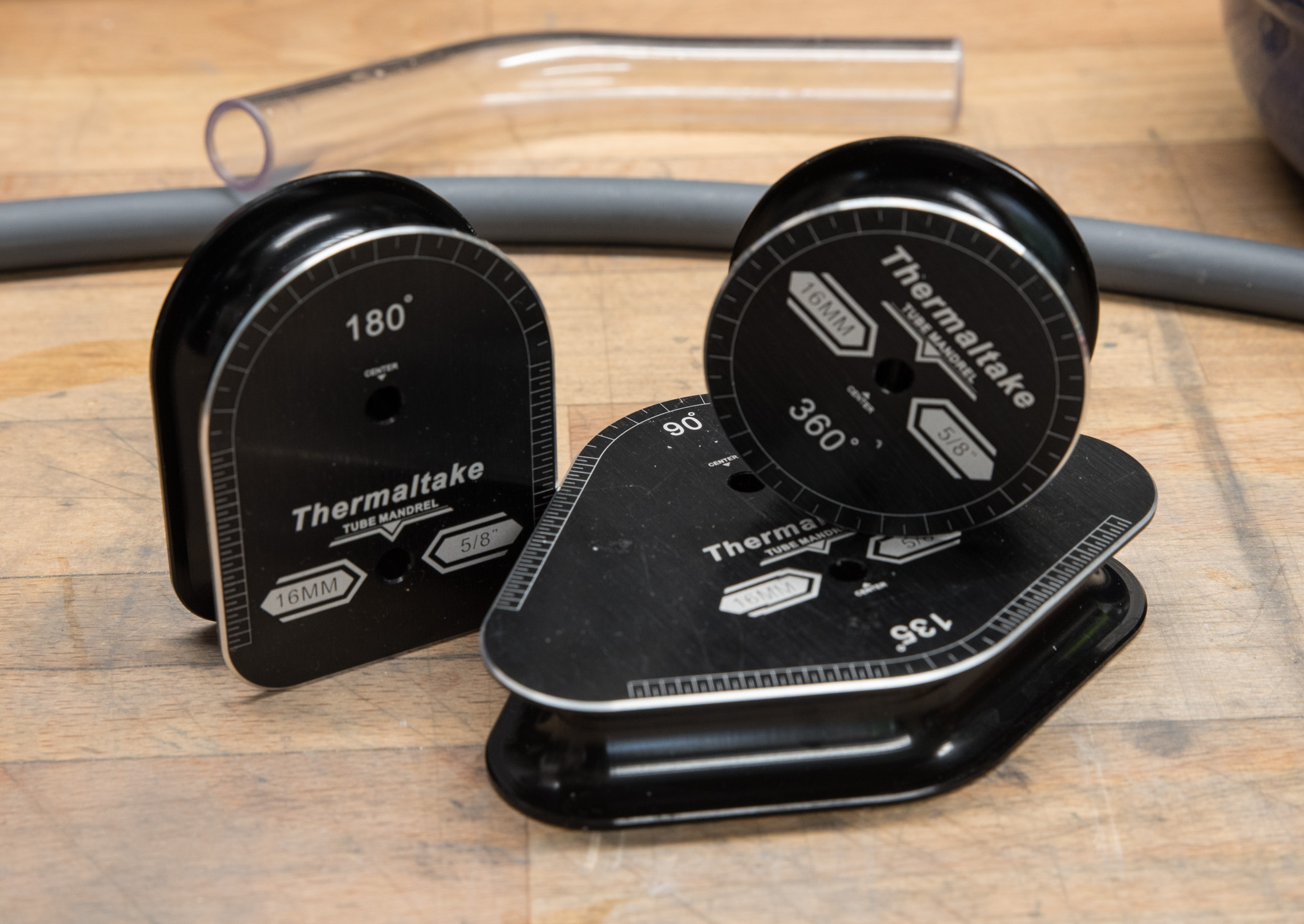 Whilst not essential (when we started using acrylic tubes these kits didn't exist), bending mandrels can make the process of producing accurate bends much easier. They're particularly helpful if trying to do multiple 90 degree bends with a consistent radius, something not easy to do freehand. A number of kits exist, ranging from simple setups with a few mandrels, a cutter, chamfer tool, and a silicon insert, all the way to the frankly ludicrous Alphacool Eiskoffer with its 3D bending jigs and numerous accessories.