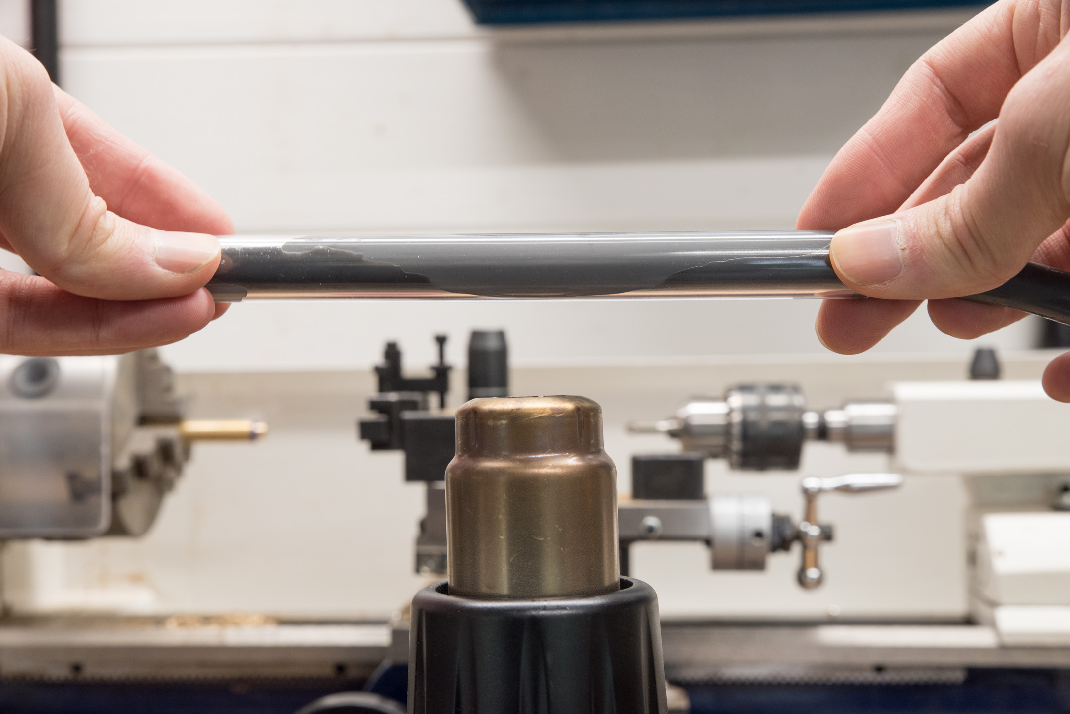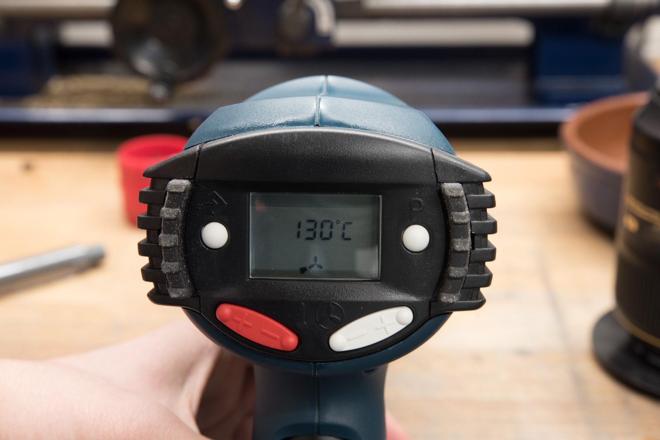 Push the insert into the tube, and we're ready to start heating. If your heat gun has temperature control, set it to between 130-150°C (or a low/medium setting); if it doesn't then you're just going to have to be quite diligent. I like to work with this temperature, as it's close to the glass point, which means you can heat with less of a worry of overdoing it - I'll show you later what happens if you overheat the tubing! If you're looking to grab a new heat gun, be sure to have a look at our Toolbox Guide! Place the heat gun on your surface, facing up, and then hold the tube over the nozzle, about 3-5cm above. It's important to heat the tubing evenly, so rotate it and also move it back and forth so that the heat doesn't concentrate in one small patch.