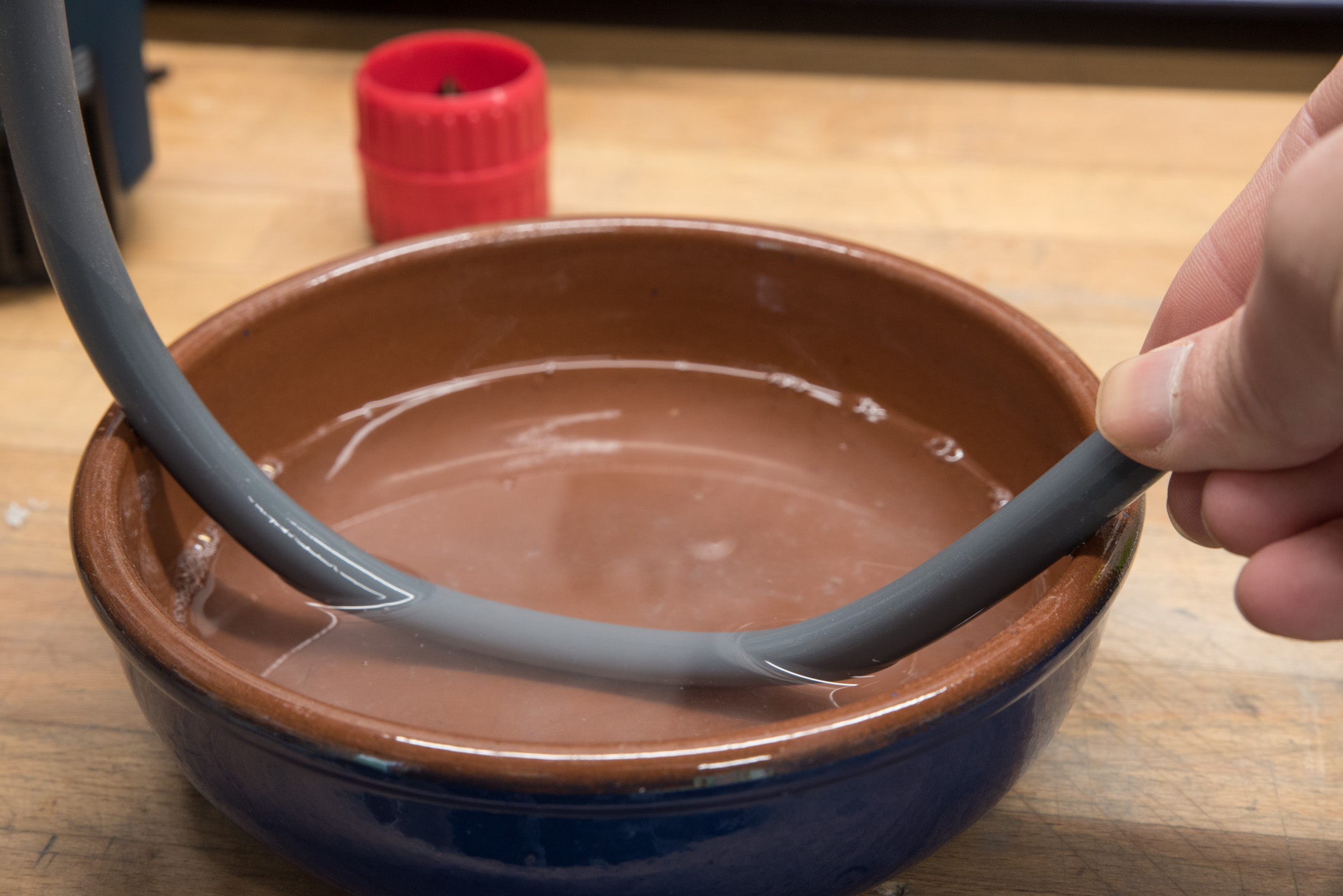 We've got a prepared length of tube, so now let's have a look at how to do the actual bends. This involves heating the tubing until it's reached its glass-transition temperature. First up, though, is inserting the silicon bending cord. This piece of equipment is 100 percent vital to the process, as it stops the tube from collapsing. You need to use one rated the same size as the internal diameter of your tubing. From experience, I fully recommend lubing that thing up, because once inside the tube it can be a pain to remove, especially if you have more than one bend in a run. The simplest way to do this is with some water and a bit of dish soap; I like to keep a dish full of water nearby for this reason.