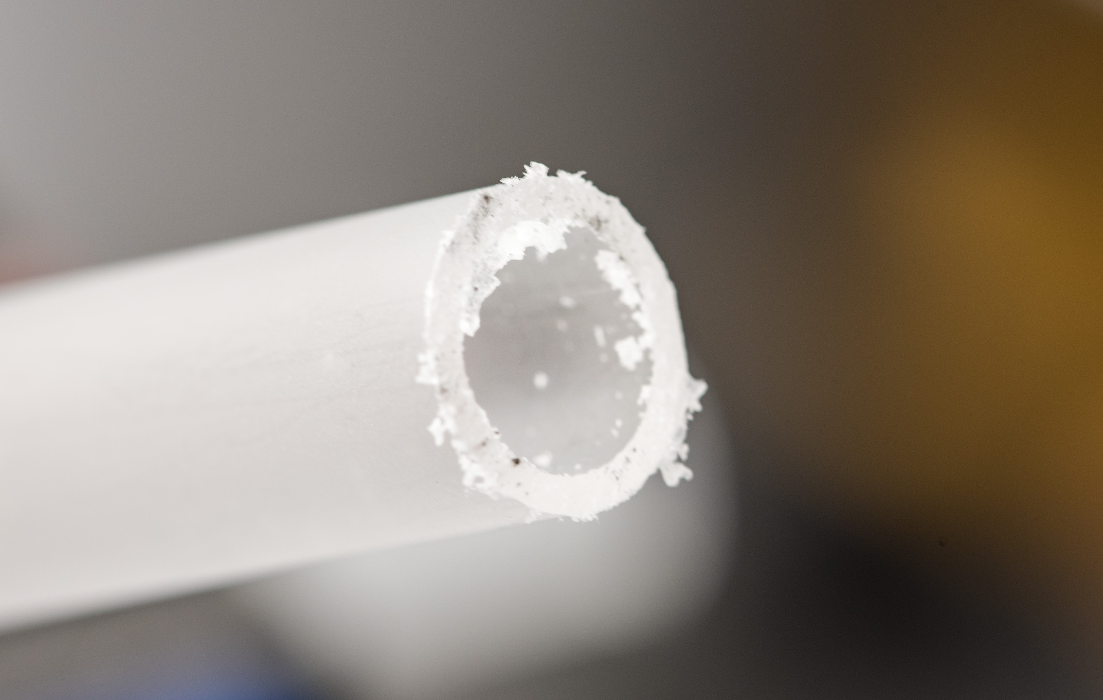 As with the PETG, the acrylic will be rough from the cutting, and since it's harder than PETG it's even more important to smooth the ends well to keep your fittings happy as Larry. Acrylic sands very easily, so I like to use this method. Simply go over the ends with 320-grit paper on top of a hard surface, then do the same around the outside to make a neat chamfer. A chamfer tool will also do this task well, but once again it can occasionally leave a rough finish. For the interior, I used a deburring tool, as the sharp blade leaves a very neat edge and it only takes seconds. The chamfer tool would work, too, as would a large countersunk bit (see the Drill Bits Toolbox for more!). You should be aiming for a neat edge like the one below.