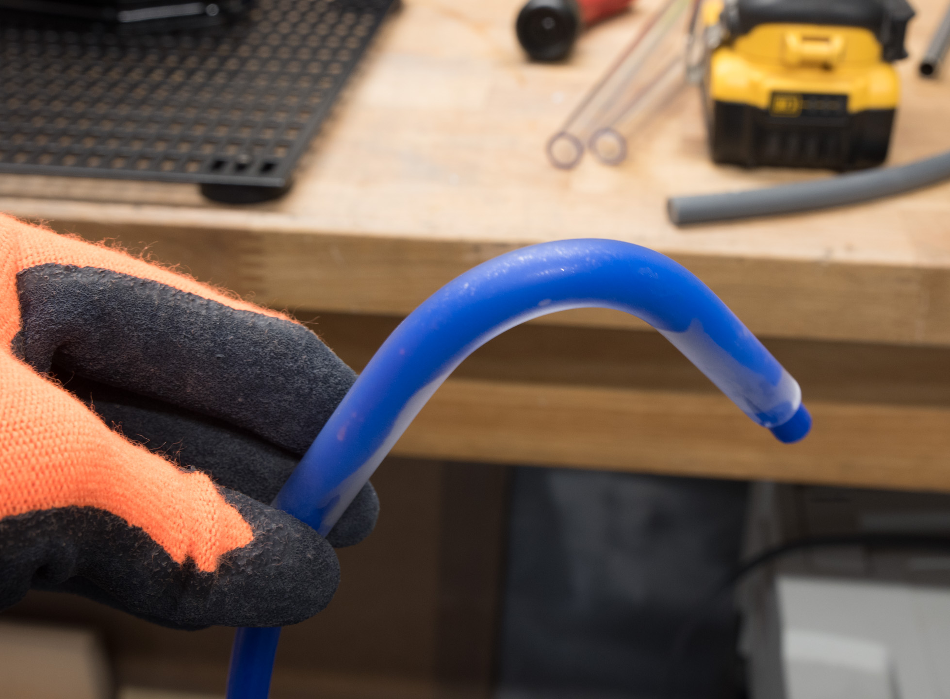 In much the same fashion as with PETG, we want to heat the tube evenly and carefully. I usually set the heat gun to 280°C or so this time. You need to heat the acrylic more, so this will make the process a bit easier. It's very important to keep a close eye on the tube, though, since acrylic can tip from usable to dead in a matter of seconds if you're not careful. Keep a close watch for any bubbles forming in the plastic. If you see those, chuck that piece and start over.