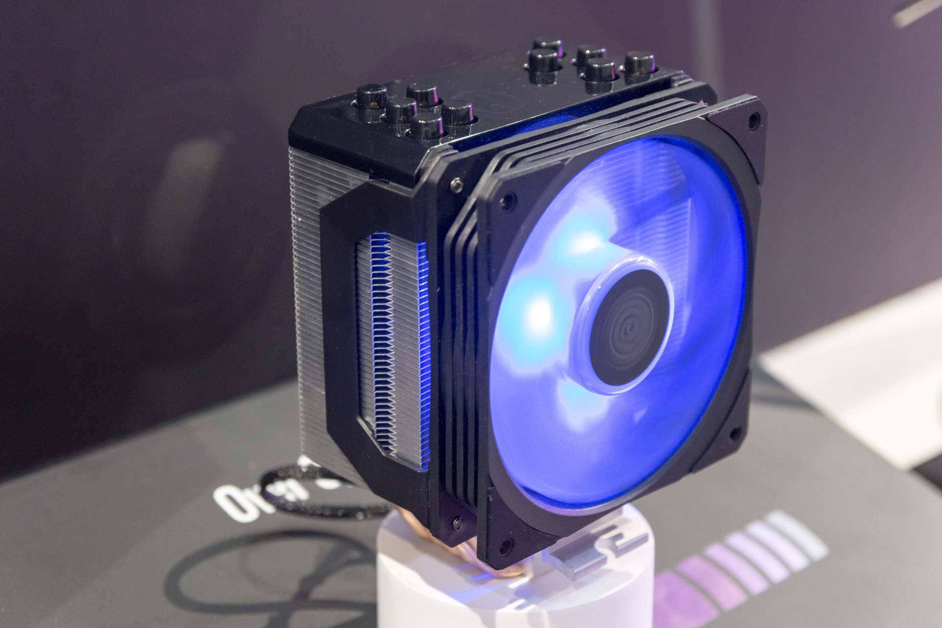 Onto cooling, we first saw the H212 Concept, a reworking of the popular Hyper 212 cooler. The design isn’t final, but the one we saw had closed off aluminium fins to guide airflow, an extra heat pipe (five not four), a design that avoids memory conflicts, and an RGB fan and logo. This is expected to launch at the end of Q3.