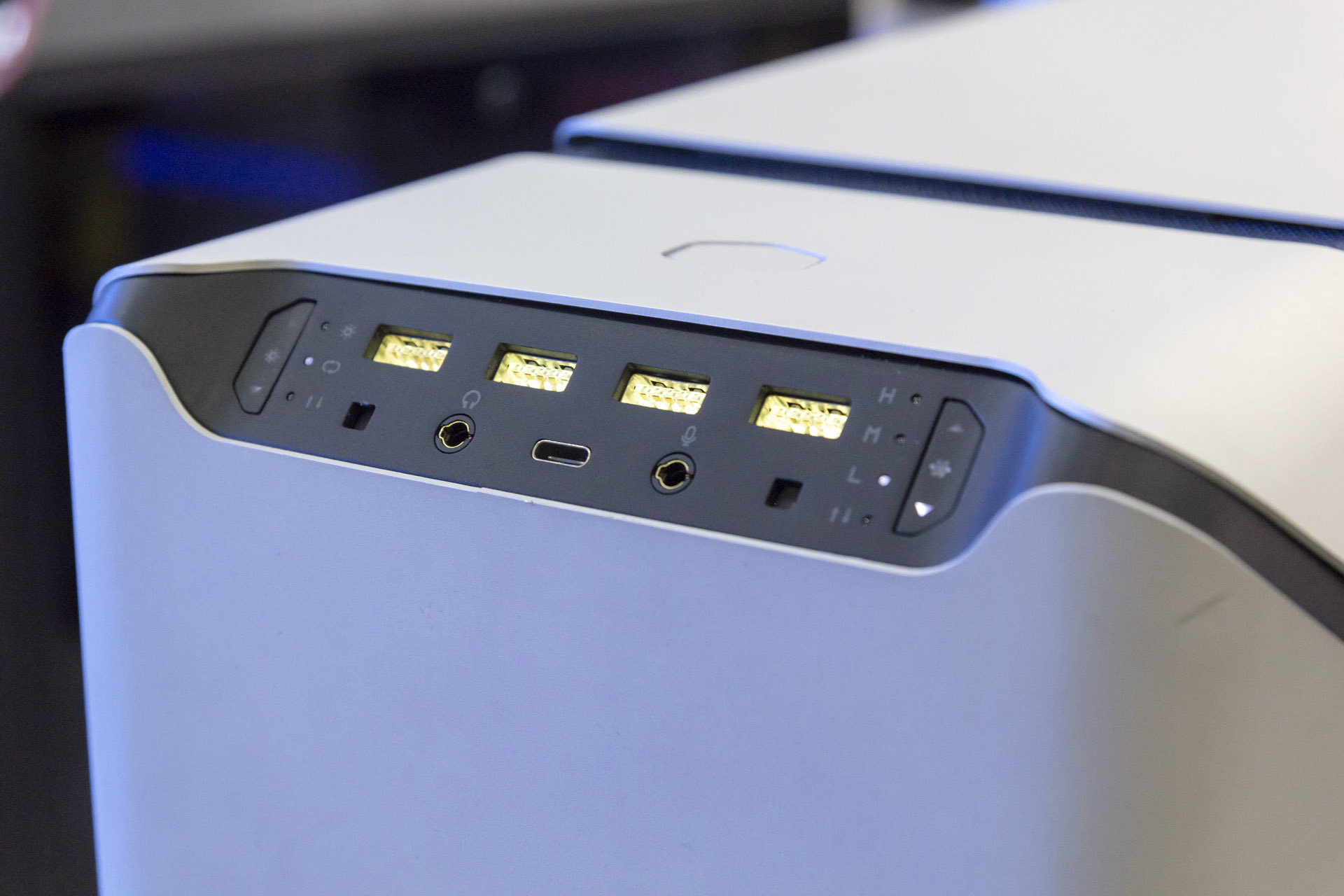 There were quite a few cases on show too, so we’ll limit ourselves to the two newest and most interesting ones. The MasterCase SL600M will debut the SL series. The aluminium on the outside is anodised rather than brushed like most other implementations. The front I/O includes multiple USB ports including a Type-C header, and it has an integrated proximity sensor that can be used to turn the port lights on. Inside is a chimney-style bottom-to-top airflow configuration. This is very much a prototype, but Cooler Master is aiming for a $230 price point in Q4.