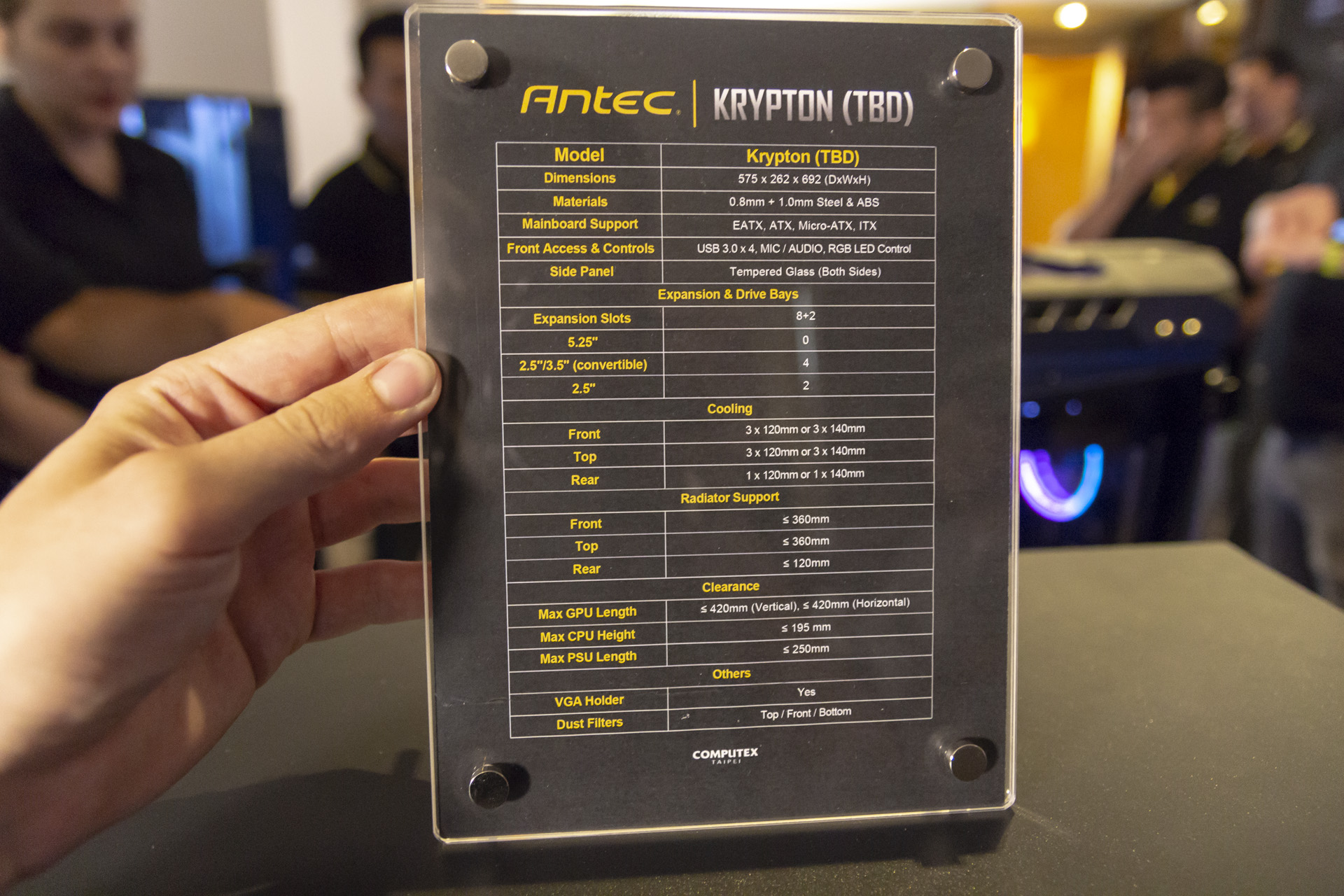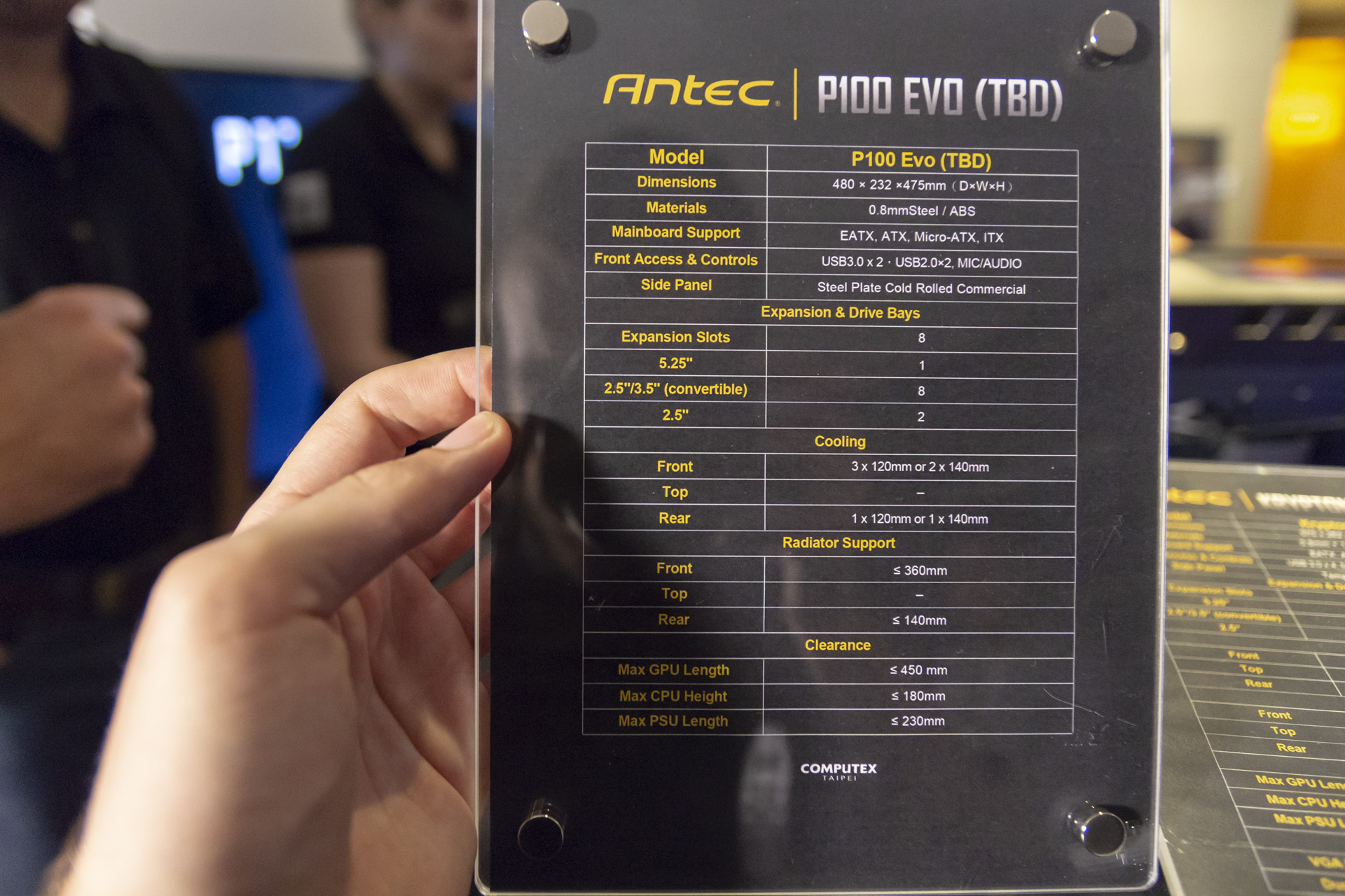 Moving now to cases, Antec had on display three new models. The first is the P100 Evo, a steel and plastic mid-tower set to launch in Q4 2018 for $89 excluding VAT. It has sound dampening side panels, E-ATX motherboard support as well as ATX, micro-ATX, and mini-ITX. Internally, we find a PSU shroud and, unexpectedly, a single 5.25” drive bay. A few more specs can be seen in the picture above.