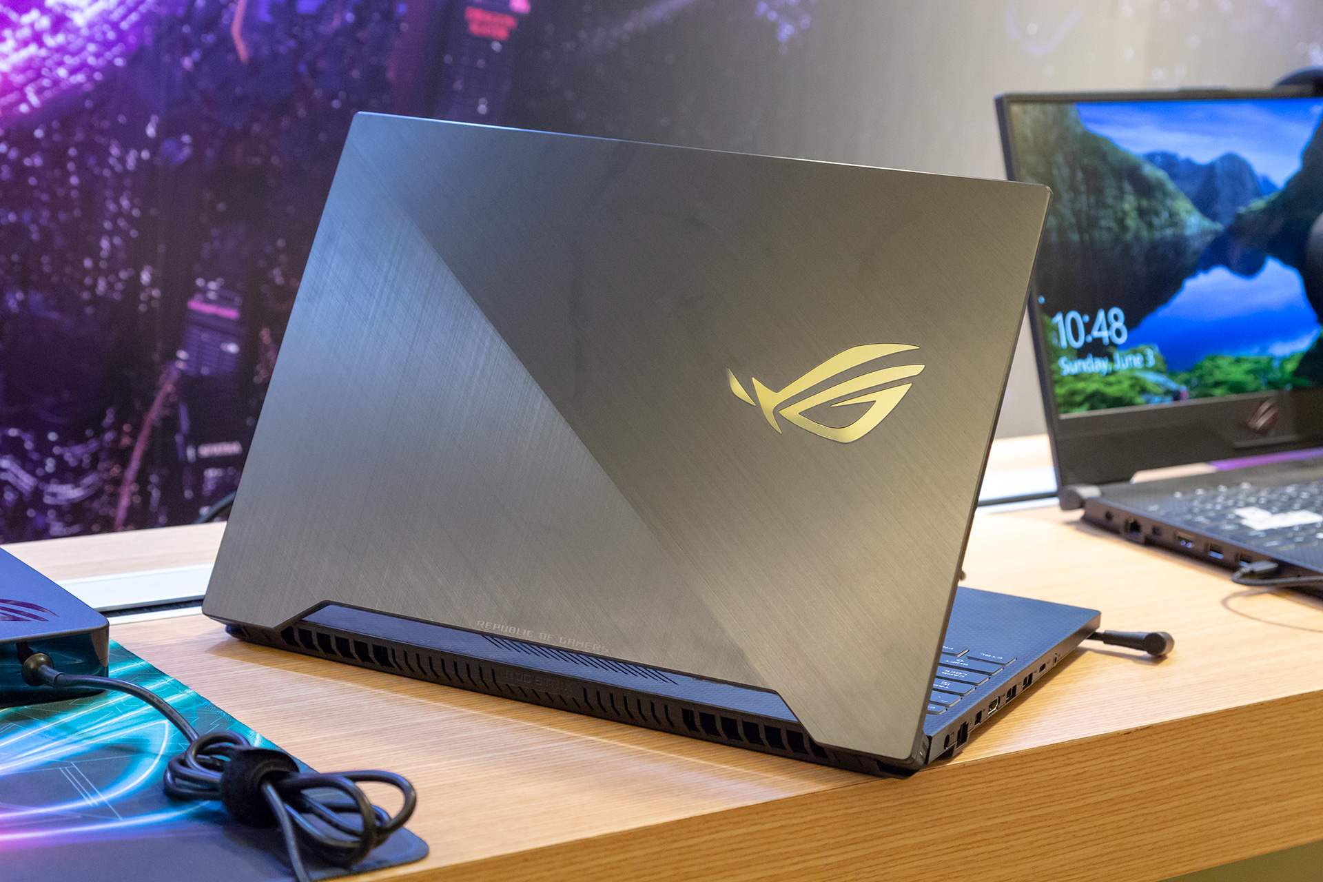 Next, the laptops. The ROG Hero II is geared towards MOBA players, while the ROG Scar II is aimed at those who prefer FPS games. It’s a small difference, really coming down to which keys are highlighted (QWER or WASD respectively) on the mechanical keyboard, which has four-zone RGB lighting (Asus Aura Sync supported) and n-key rollover. The chassis has a two-tone contrasting brushed metal finish and a new RGB light bar along the front edge. The border around the screen has been reduced by 2.33cm compared to the original models, resulting in a lower overall footprint. The 14” display is a FullHD (1080p) IPS panel with 144Hz refresh rate and 3ms response time. The lid is designed so as to not block the rear exhaust vents when opened, and the cooling system has seen a number of upgrades such as extra cladding on the heat pipes, improved fans, and ulltrathin 0.1mm fins.