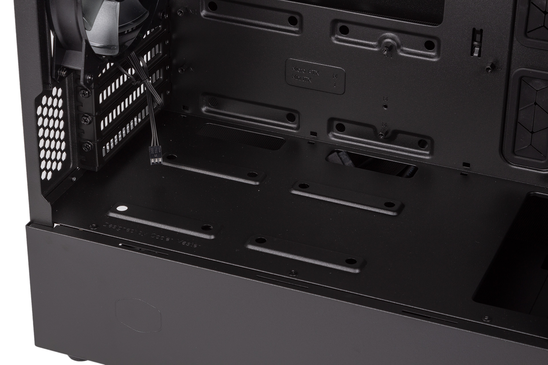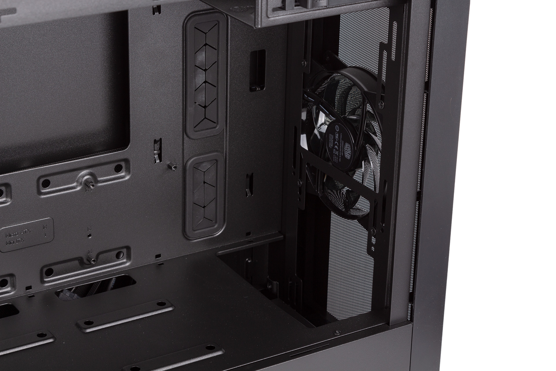 Given the price it’s not surprising to see notches and rails used for the side panels rather than hinged and/or magnetic mechanisms, but Cooler Master’s implementation works well enough and has captive screws on the glass panel. It would perhaps be nice to have a small handle on the glass panel to help with sliding it backwards without getting the glass all smudged, but that’s a minor point.
