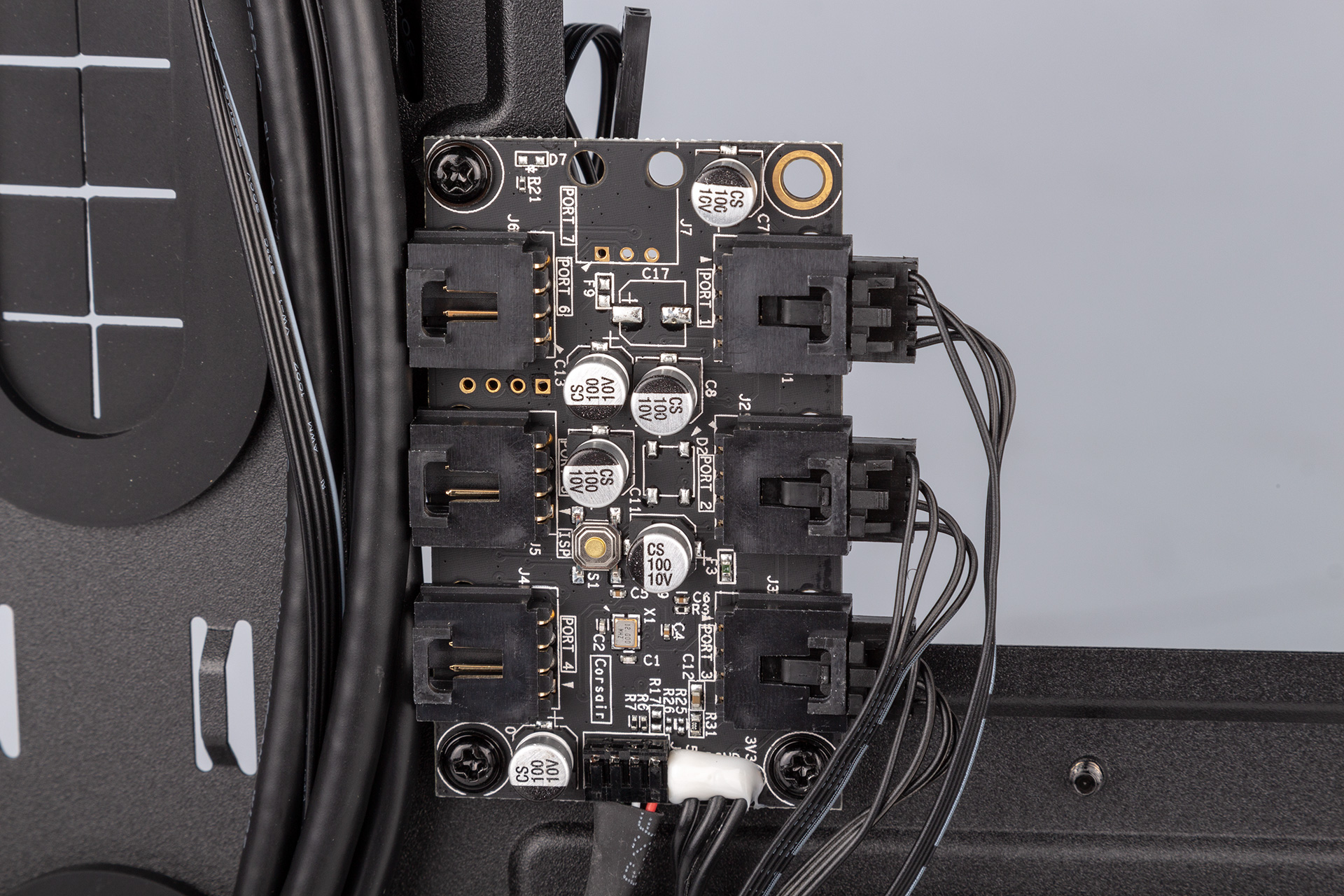 The iCUE Lighting Node Core controller is mounted behind the motherboard tray as well. It has a USB 2.0 header for data connection and SATA 12V for power, sporting six RGB LED hub connectors, three of which are pre-connected to the LL120 RGB fans. The others can be used for other Corsair RGB fans, and the total number of connections matches the total number of fan mounts in this case. The controller is presented as a PCB without housing, which keeps the space it occupies down.