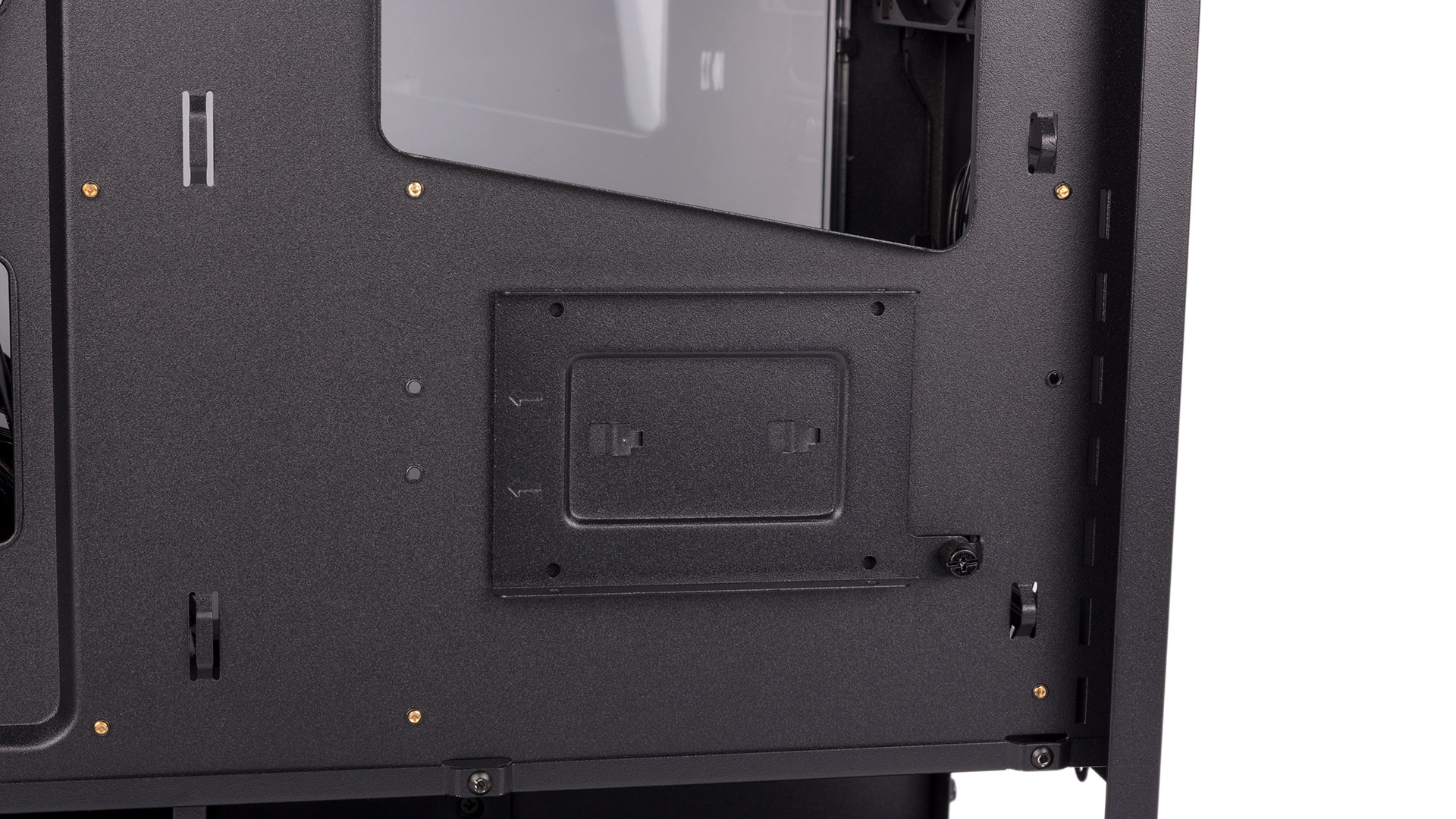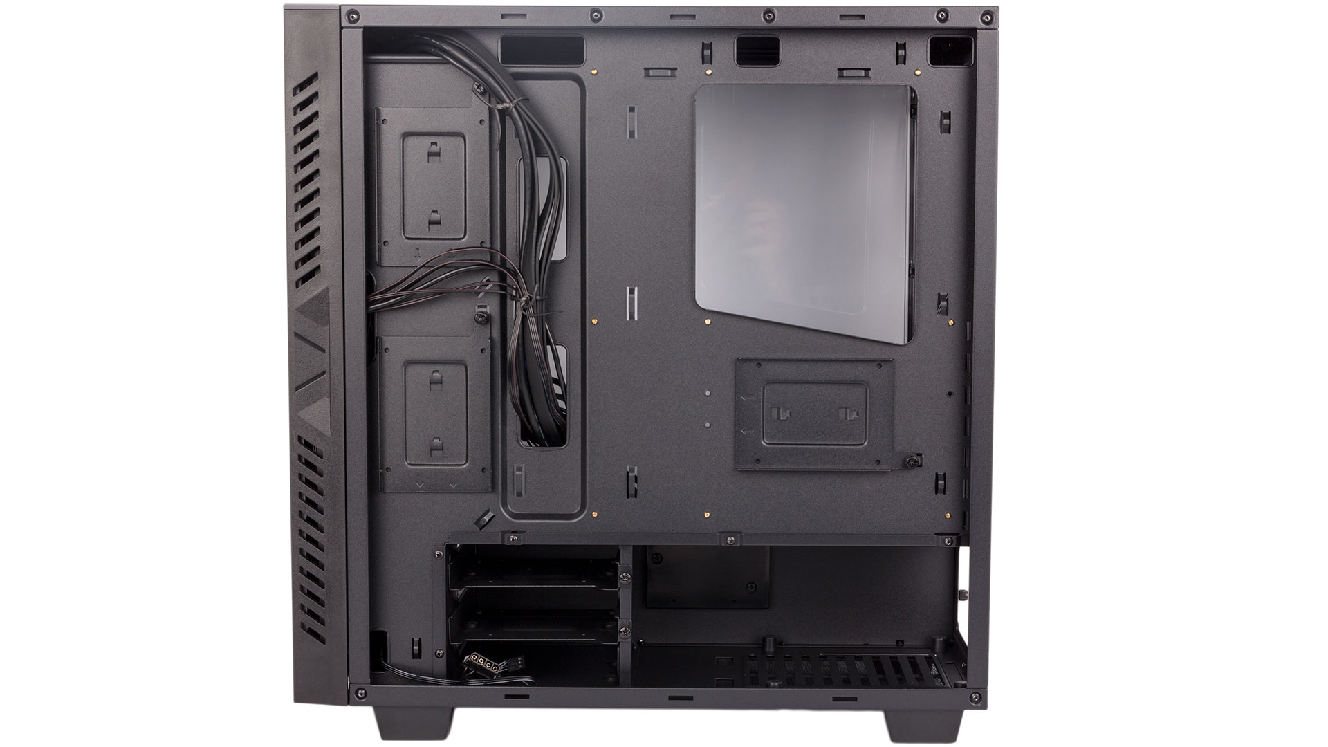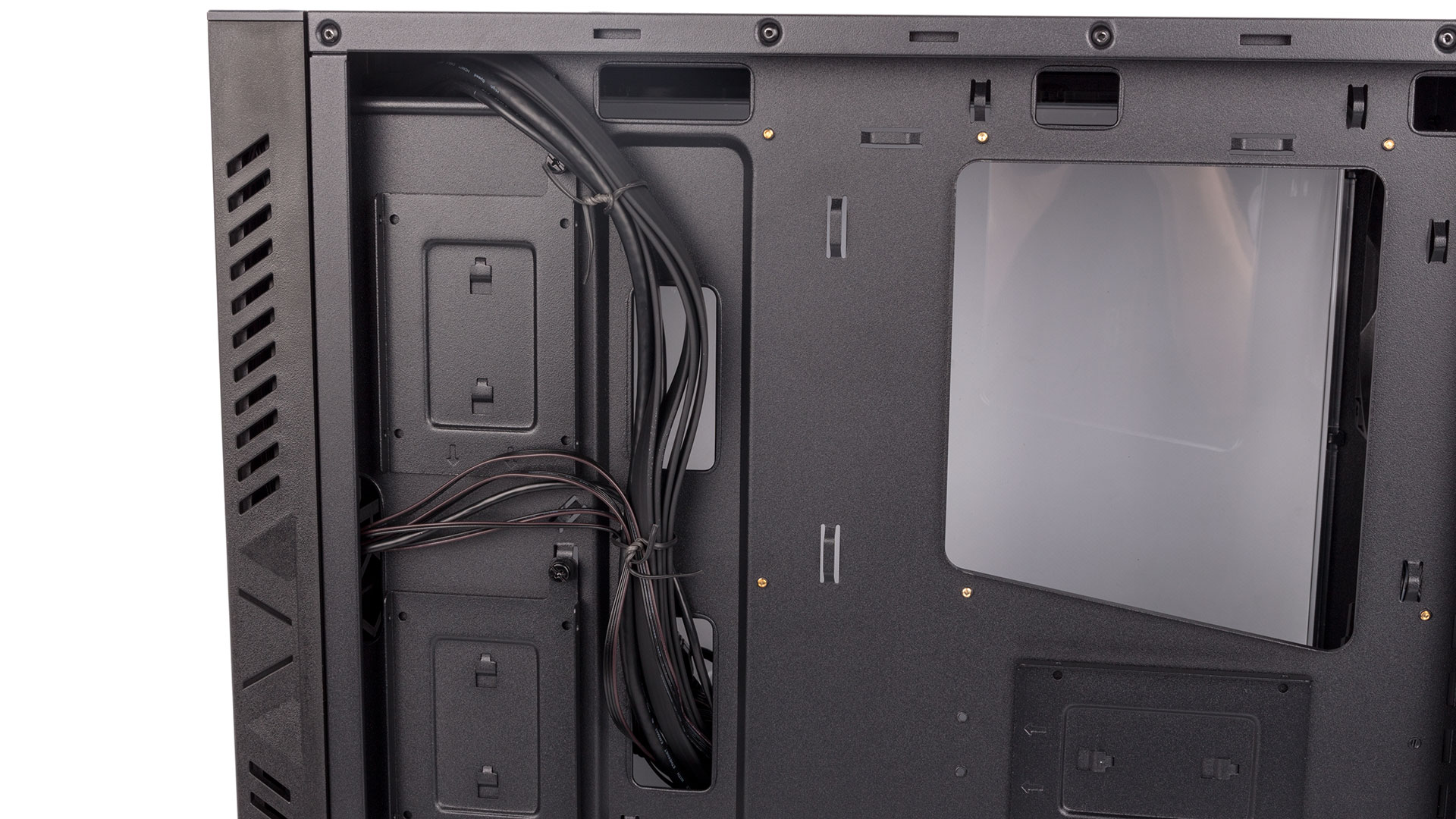 All drives are relegated to installation either behind the motherboard tray or beneath the PSU shroud. There are three metal trays fixed to the back of the tray (two near the front of the case, one behind the motherboard itself), each using a single thumbscrew for easy access. Our only gripe is that aligning the notches once a drive is in place can be fussy, as you can no longer see them.