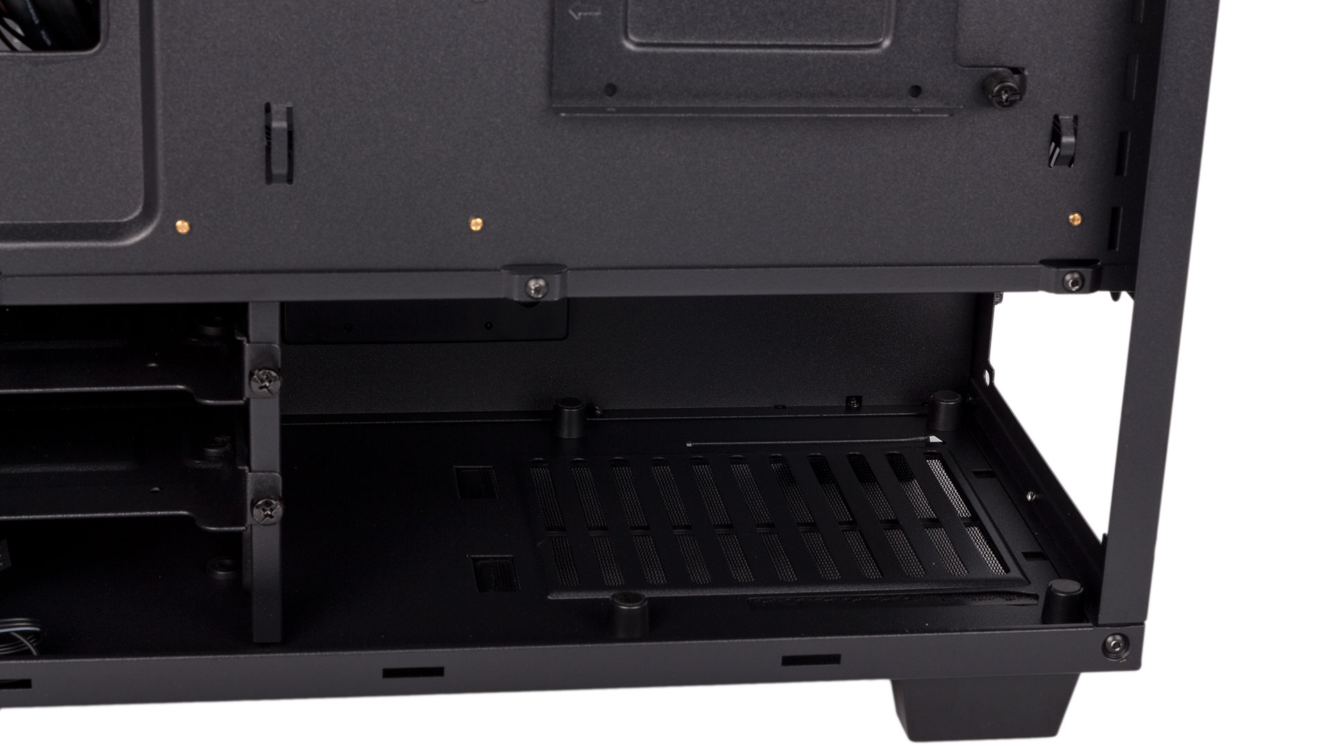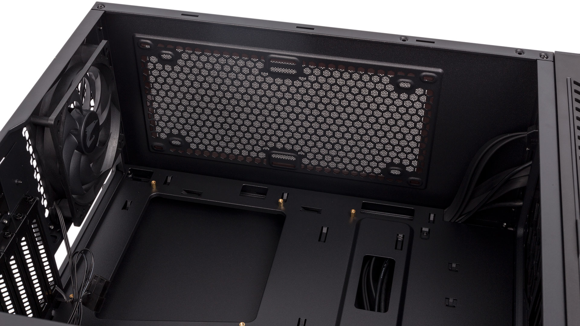 The PSU shroud nearly extends the full depth of the case, but Aorus has opted to leave a gap of just under 40mm between its inner wall and the front fan. This means there's at least 60mm of room for radiators and fans if you choose to utilise this area for water-cooling, and in turn this means that practically every all-in-one cooler is supported, as both 360mm and 280mm radiators can go here. The offset roof mounts also support 240mm and 280mm models, but clearance with the motherboard is tight.
