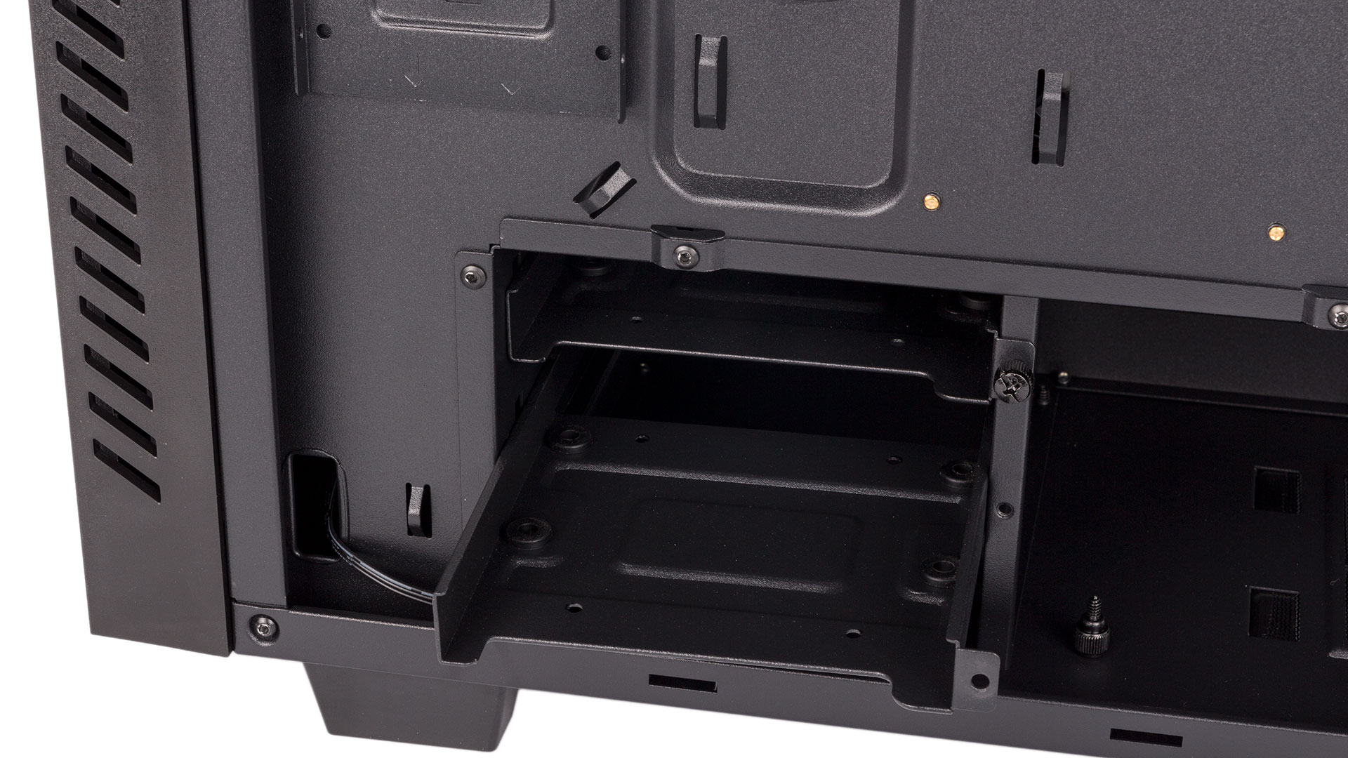 There's also a two-bay HDD cage with trays that are again made of metal and this time have grubber grommets on the mounting holes for 3.5” drives (2.5” drives are supported in each tray too). There's also a set of grommet-covered 3.5" mounting holes embedded directly in the case floor, and the inner wall of the HDD cage (that closest to the PSU) is removable as well.