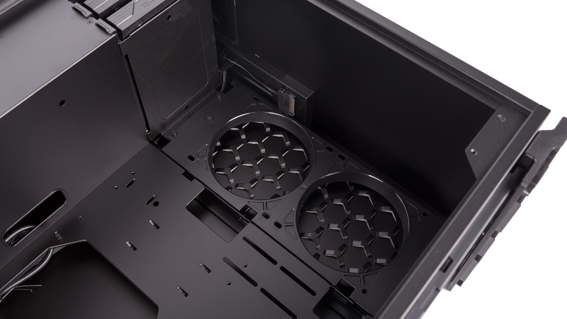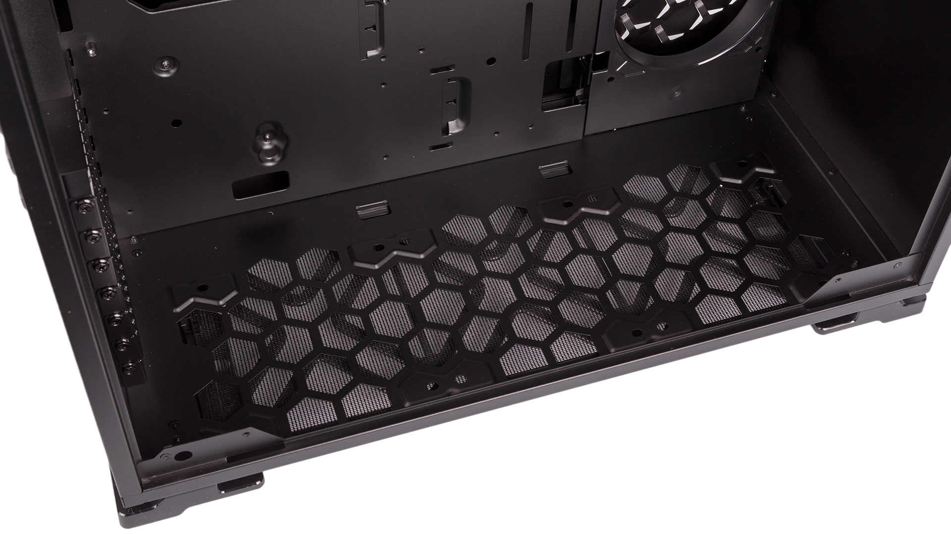 At the front of the upper chamber is a drive cage home to a pair of 3.5”/2.5” trays with nifty little locking arms and tool-free support with rubberised pins for larger drives. They’re very easy to use, as are the two metal trays fixed to the rear of the motherboard tray dedicated to 2.5” device mounting. Having support for only four drives seems small, but given the capacity you can obtain for both SSDs and HDDs now (not to mention M.2 drives you might use), it will be enough for most people, especially those shopping for a £65 chassis.