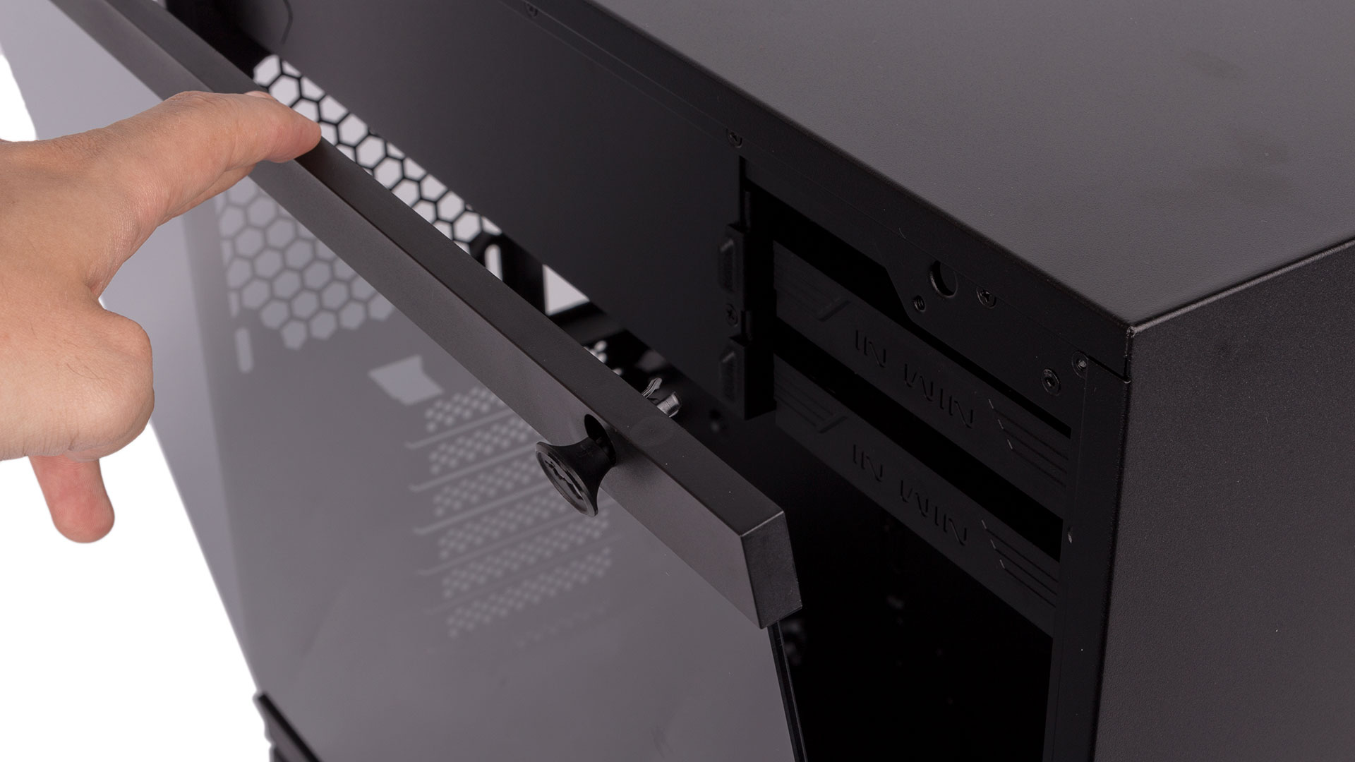 Our initial enthusiasm for the 101’s build quality took a hit when we played with the side panels. To be clear, the attachment mechanisms for both are very easy to use. The left glass one is secured with two push-to-lock pins at the top, while the right one utilises a pair of thumbscrews also at the top. However, the plastic of the left panel’s pins is easy to bend out of place if you misalign the panel even slightly (you may have experienced a similar thing with Intel stock coolers), and the front pin on our case quickly lost its grip strength. Meanwhile, one of the thumbscrews on the right panel actually sheared off completely, rendering it useless. We are admittedly a little at fault here, as the screws are not designed to be removed from the panel itself, which we did do, but it literally snapped on our first attempt at getting it back in. Thankfully, the remaining screw was enough to keep things locked in place, even with the system built, but we’d still be annoyed if this happened to us as quickly as it did had we purchased the case.