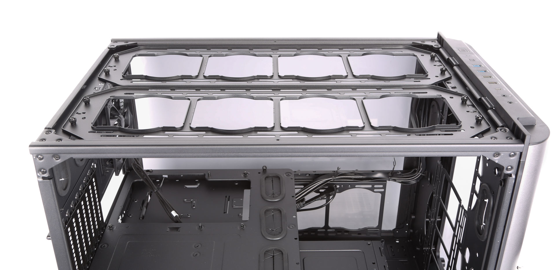 You get eight PCI expansion slots, and just in case the countless massive radiator mounting points aren't enough, there are rear grommeted holes for routing tubing and cables.You can also see the two PSU mounts and we're surprised Thermaltake didn't consider a dual-system option here given how much space there is. The rear fan also sports an adjustable mount too so you can align it with your CPU cooler. The front panel pops off to reveal fan mounts for a pair of 200mm or 140mm fans or three 120mm fans with corresponding radiator support too, including a 360mm (dual 180mm) monster - and yes, they do exist.