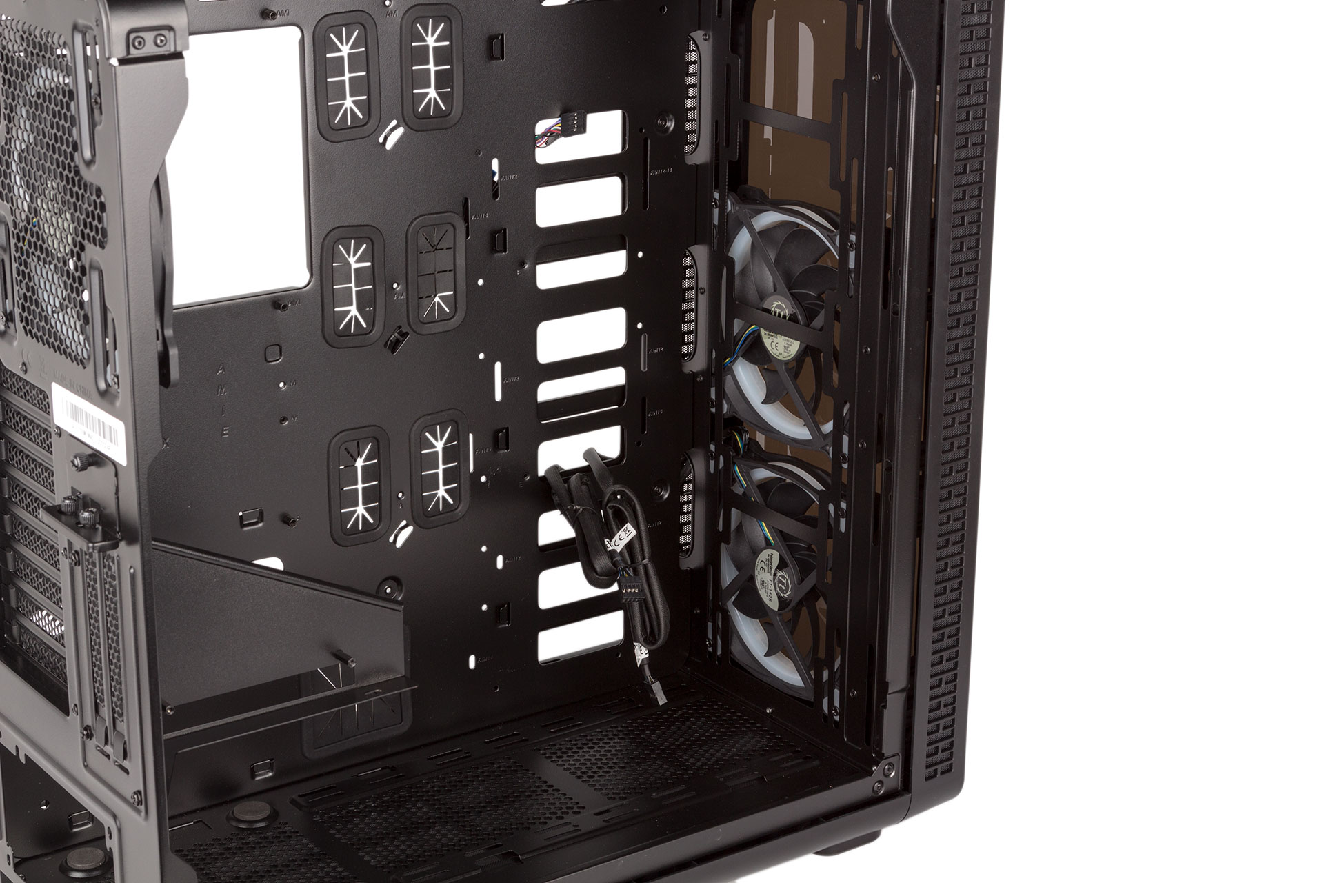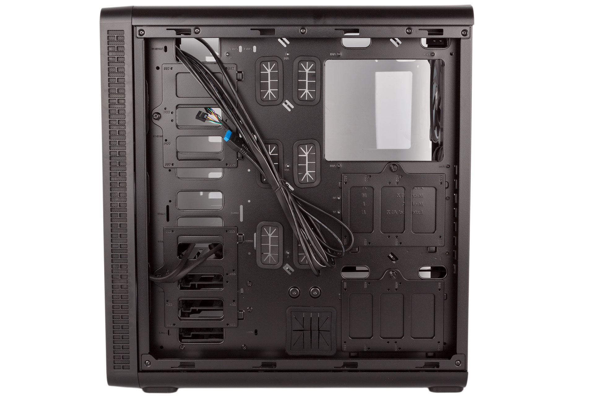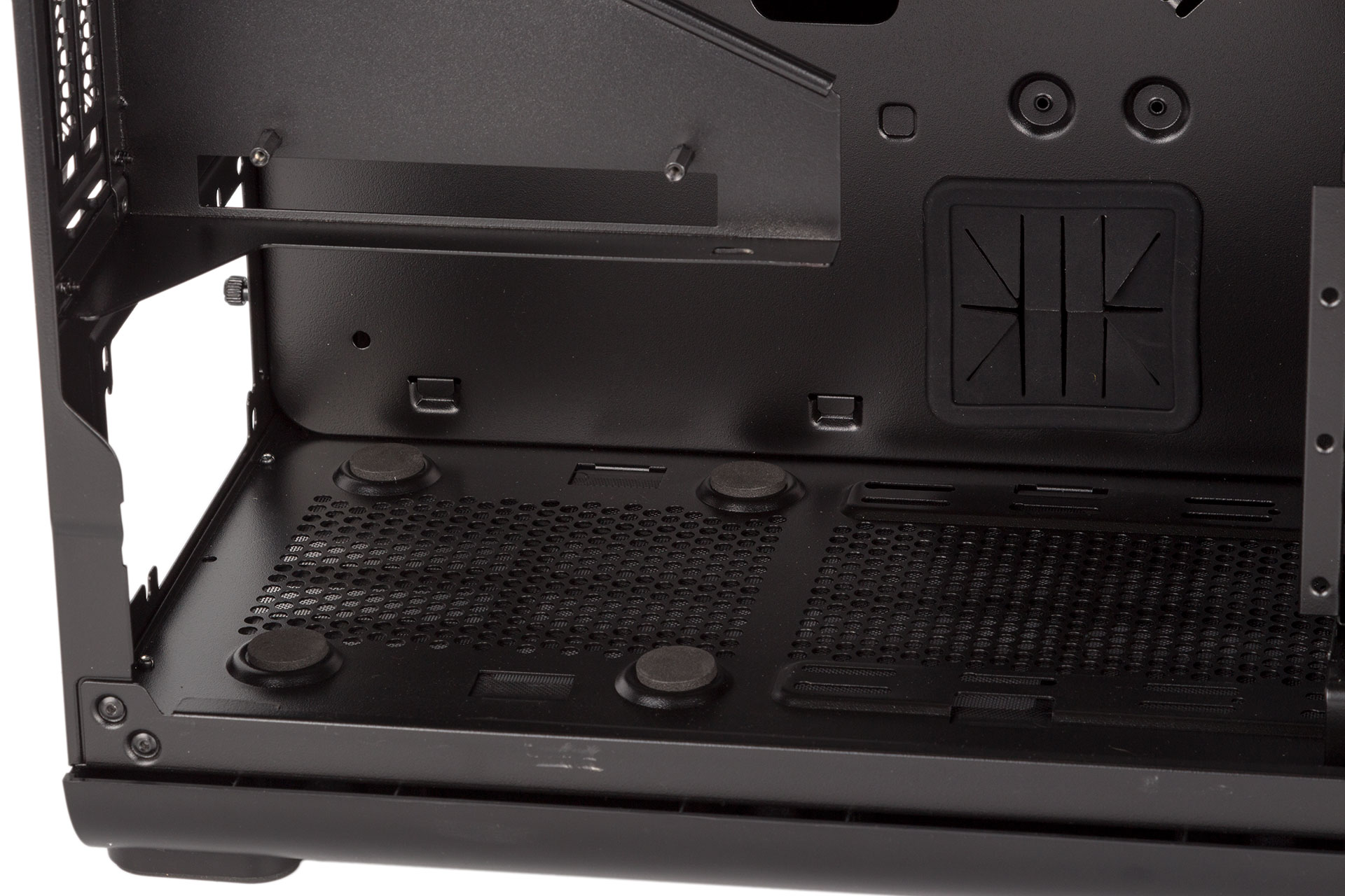 Inside is pretty spacious, and the full-length motherboard tray supports E-ATX models. Most motherboard mounts are pre-installed, but the furthest right set you'll need to do yourself. There is no PSU cover, which isn't surprising since this is quite a flashy case clearly designed more for showcasing hardware than hiding it away. The PSU area itself has pads for the unit to rest on, but these are made of foam rather than the preferred rubber.