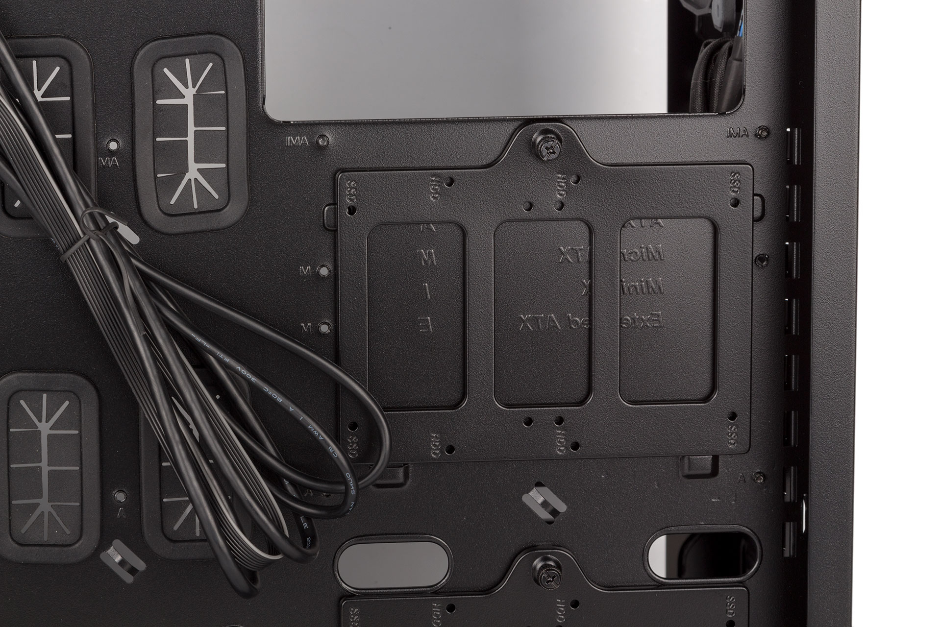 In the bottom-front corner is a three-bay HDD cage. Each bay is filled with a plastic tray with squeeze-to-release clips and a tool-free locking mechanism, although all drives, be they 3.5” or 2.5” models, will need screws to be installed in these. Note that there is no rubber built in to help with keeping vibrations down. As you might have noticed, there are rails atop the HDD cage, which allows you to stack cages and then secure them to the elongated motherboard tray.