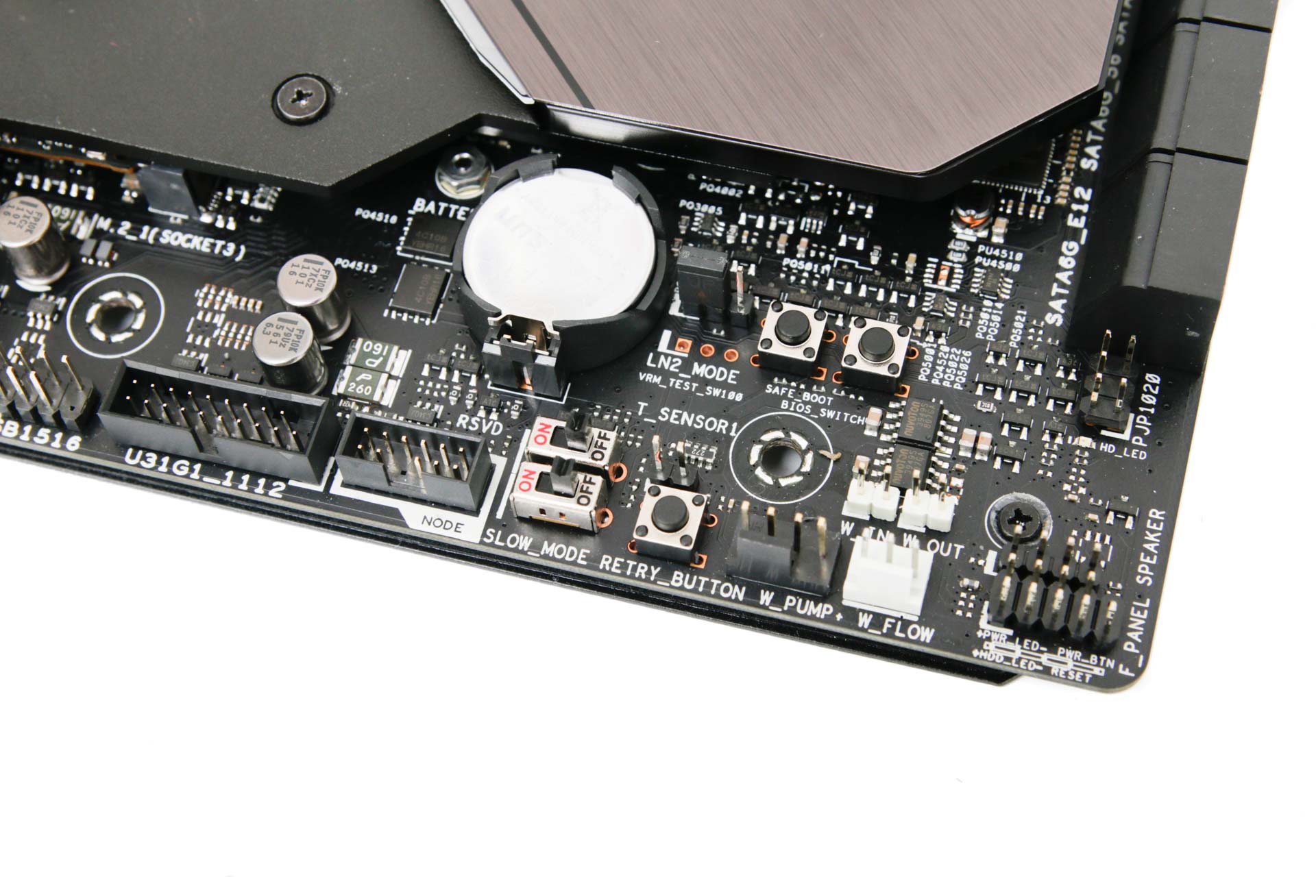 The board is clearly designed with both content creation professionals and extreme overclockers in mind. The latter can benefit from a decent array of overclocking tools such as slow mode, LN2 mode, BIOS switch and the more typical onboard power, reset, and CMOS clear buttons, plus LED POST code display. If you're gunning for a water-cooled rig then there are plenty of things to like here too. You get flow rate and thermal probe sensors on the PCB, and while you only get six four-pin fan headers, one of these can dish out up to 36W, which is more than enough for any single water-cooling pump, while the accessory box includes an expansion card that offers another six fan headers.