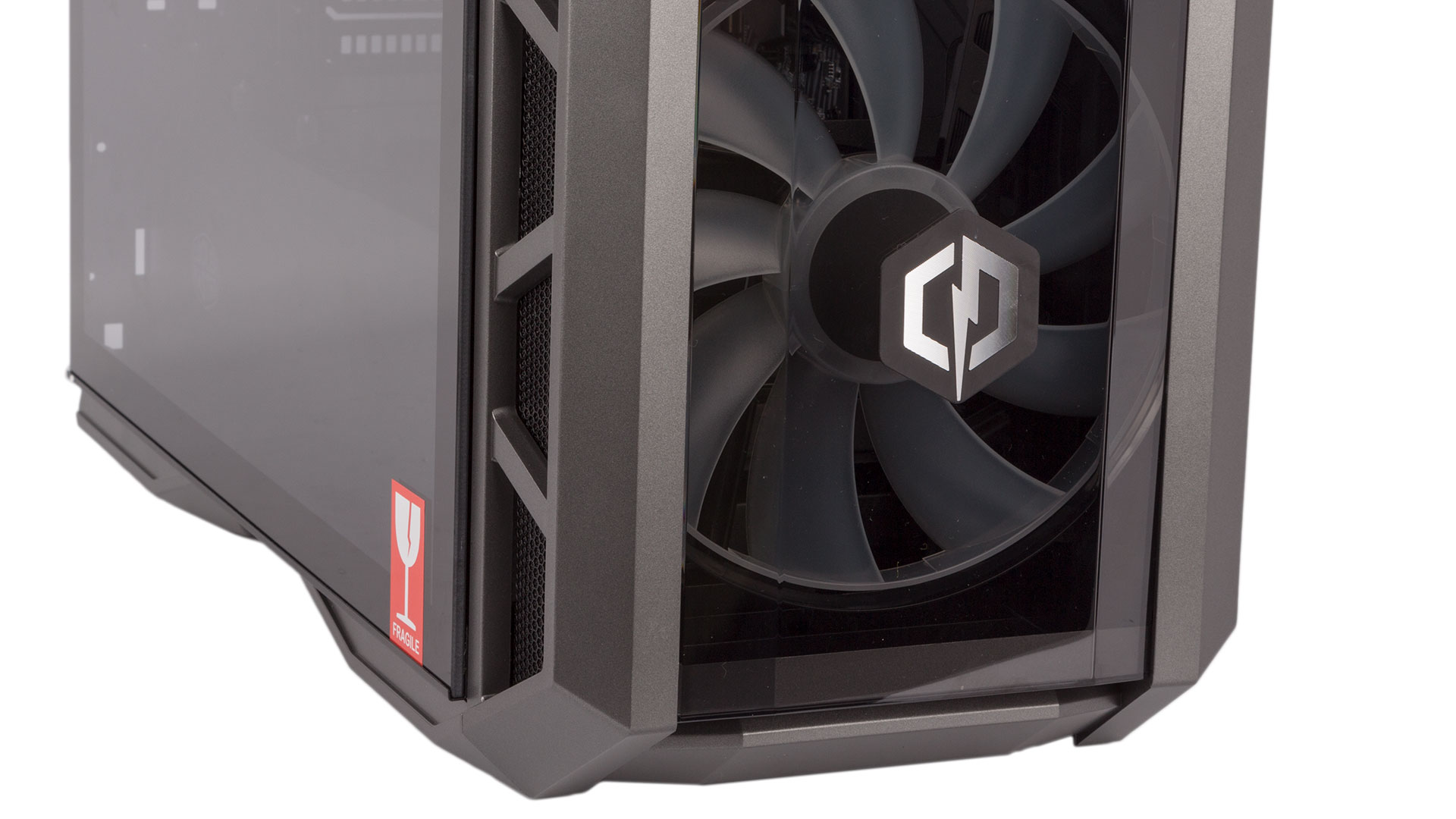 However, there are more pressing issues with regards to how the PC was assembled. It arrived with the case panels quite badly out of place and a wonky hard drive too. These could potentially be shipping issues, but CyberpowerPC specifically offers a more premium packaging option at an extra cost. Similarly, you can pay more for ‘professional wiring’; you may remember that the cables behind the motherboard tray were a little messy. These extra options are nice on the surface, but to us they suggest that the company isn’t doing as good a job as it could by default. We could perhaps forgive it on lower cost systems, but when you’re paying a premium for the assembly already, the wiring and packaging should be top notch.