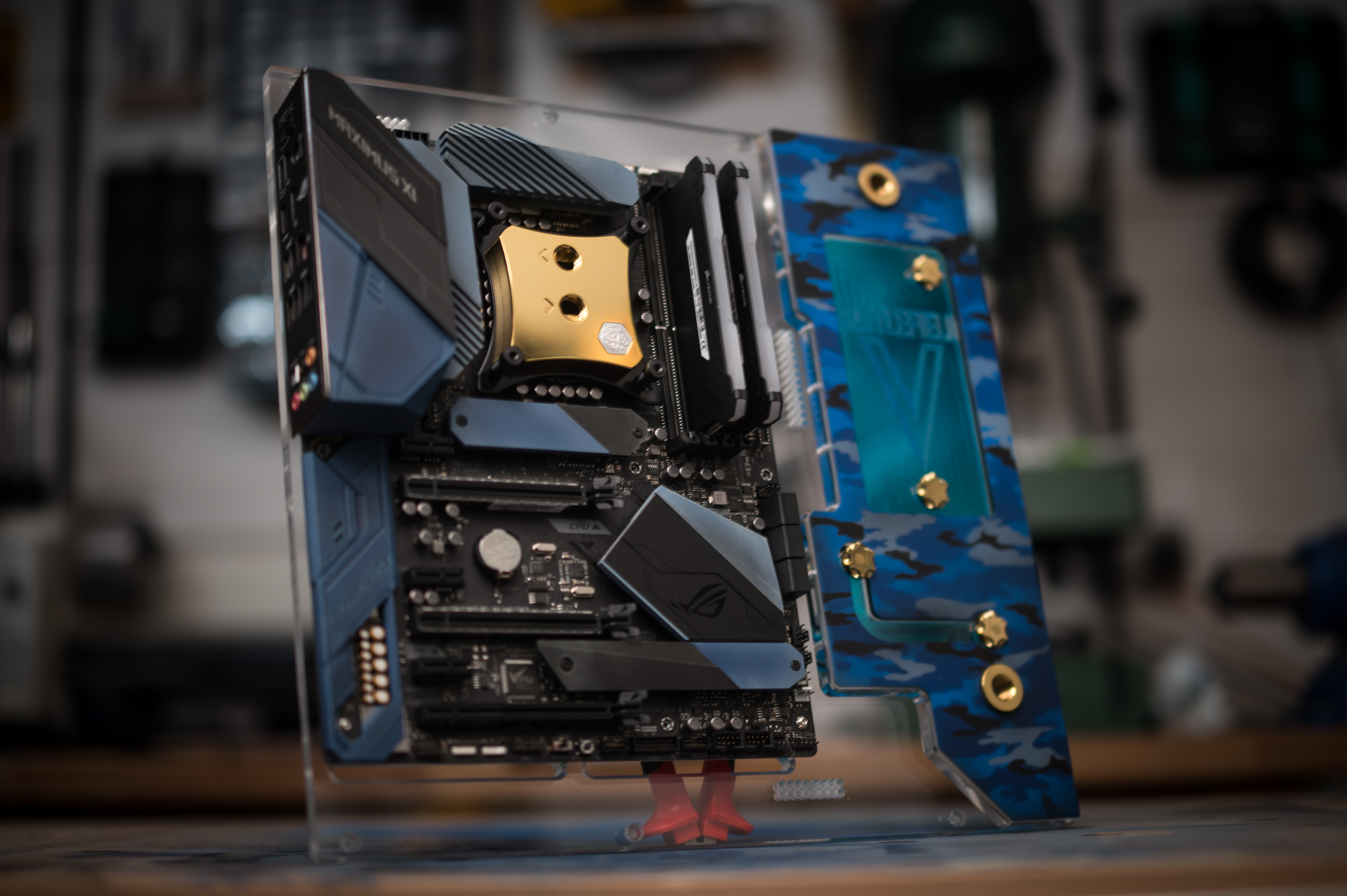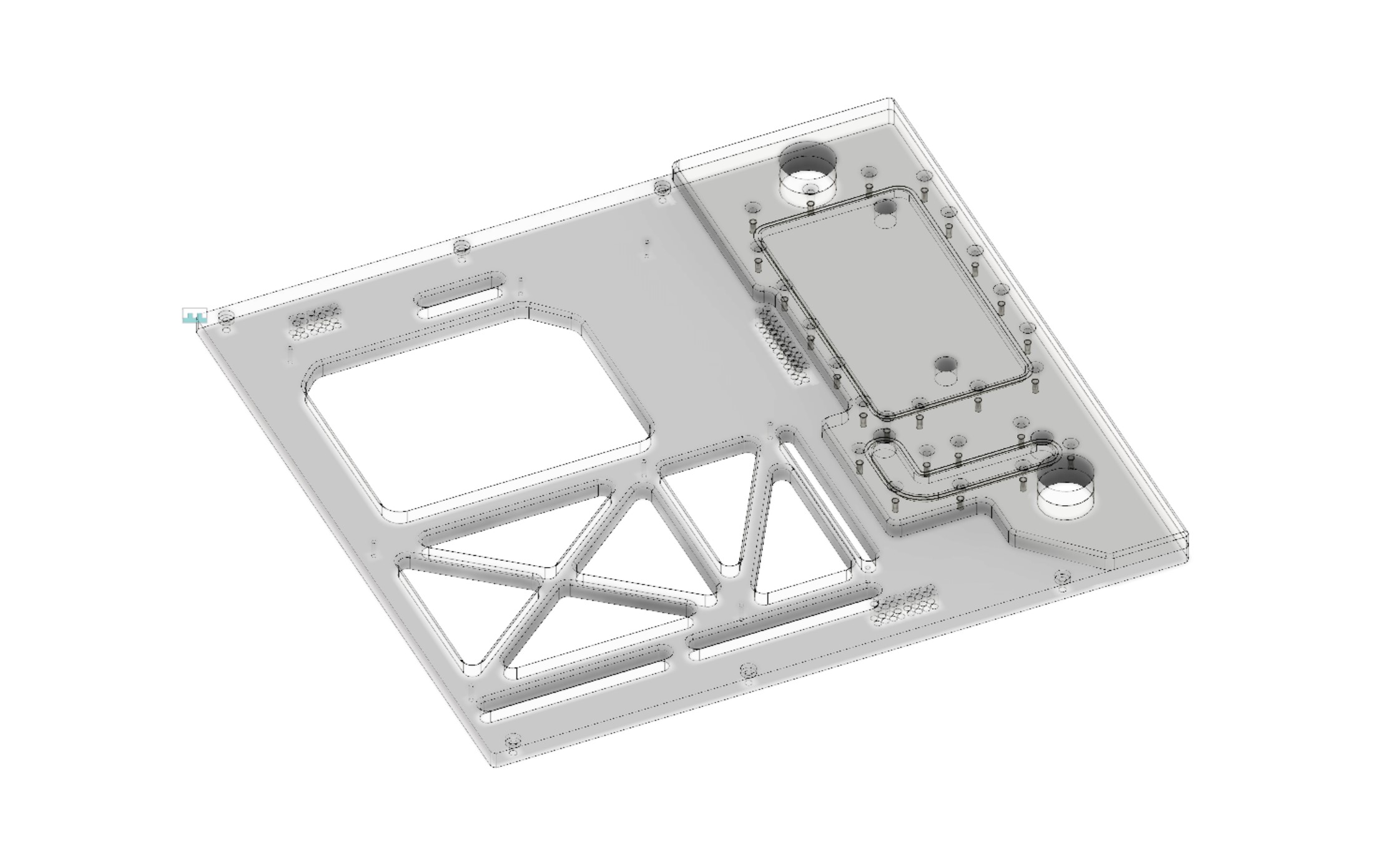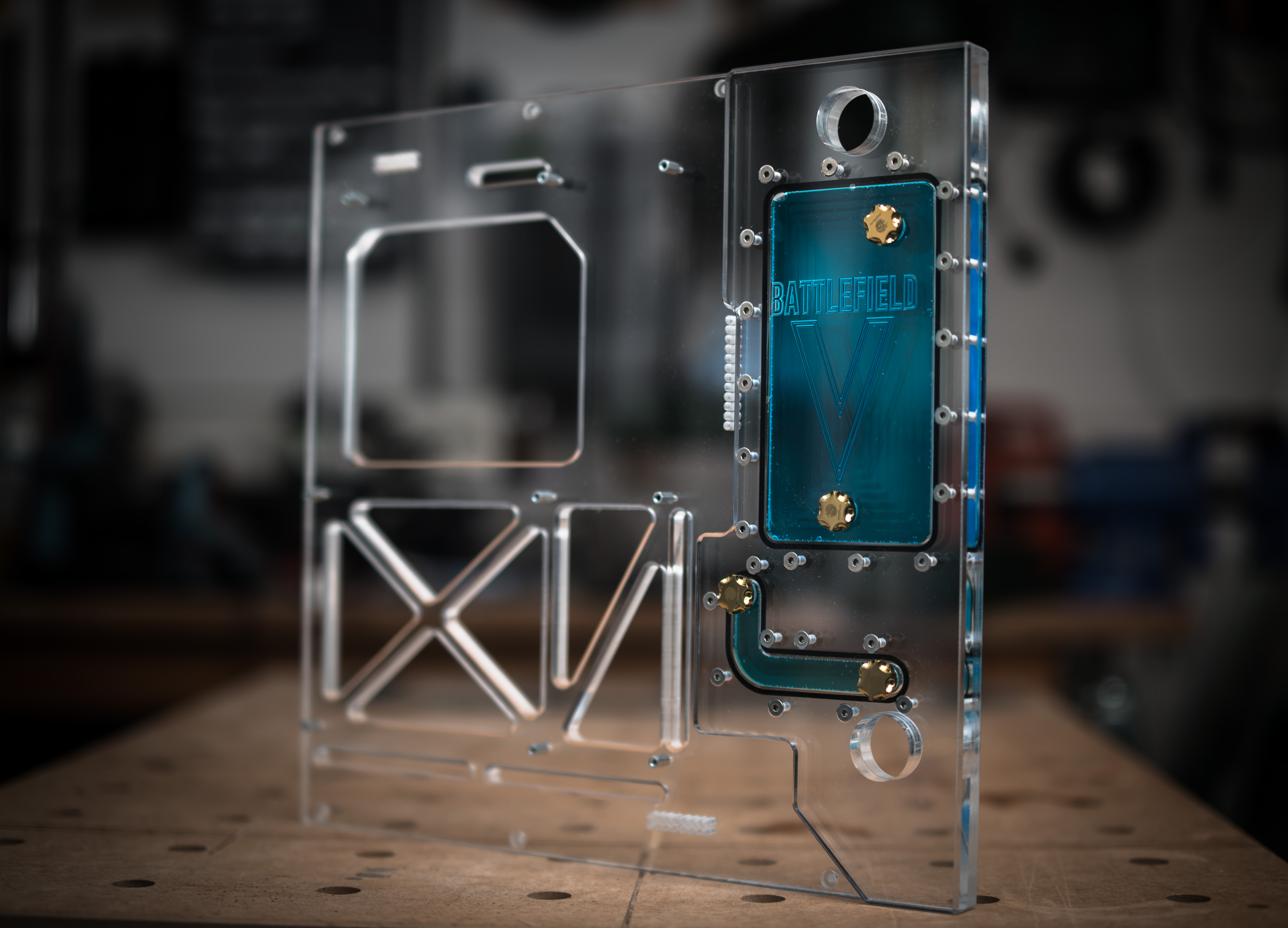 With that primary conundrum solved, I set to work designing the motherboard tray itself. Since this build was destined to contain a distro plate of sorts from the outset, it only made sense to have the motherboard tray perform this role. The first community vote was to decide the theme of the distro plate, with the choices being 'RTX' or 'Battlefield V'. As you can imagine, Battlefield V won the vote (but by only a small margin, I might add) so that was worked into the design too. In the end I went with a fairly straightforward design with a reservoir to the right of the motherboard, a few coolant channels, and cable pass-through holes to keep clutter away.