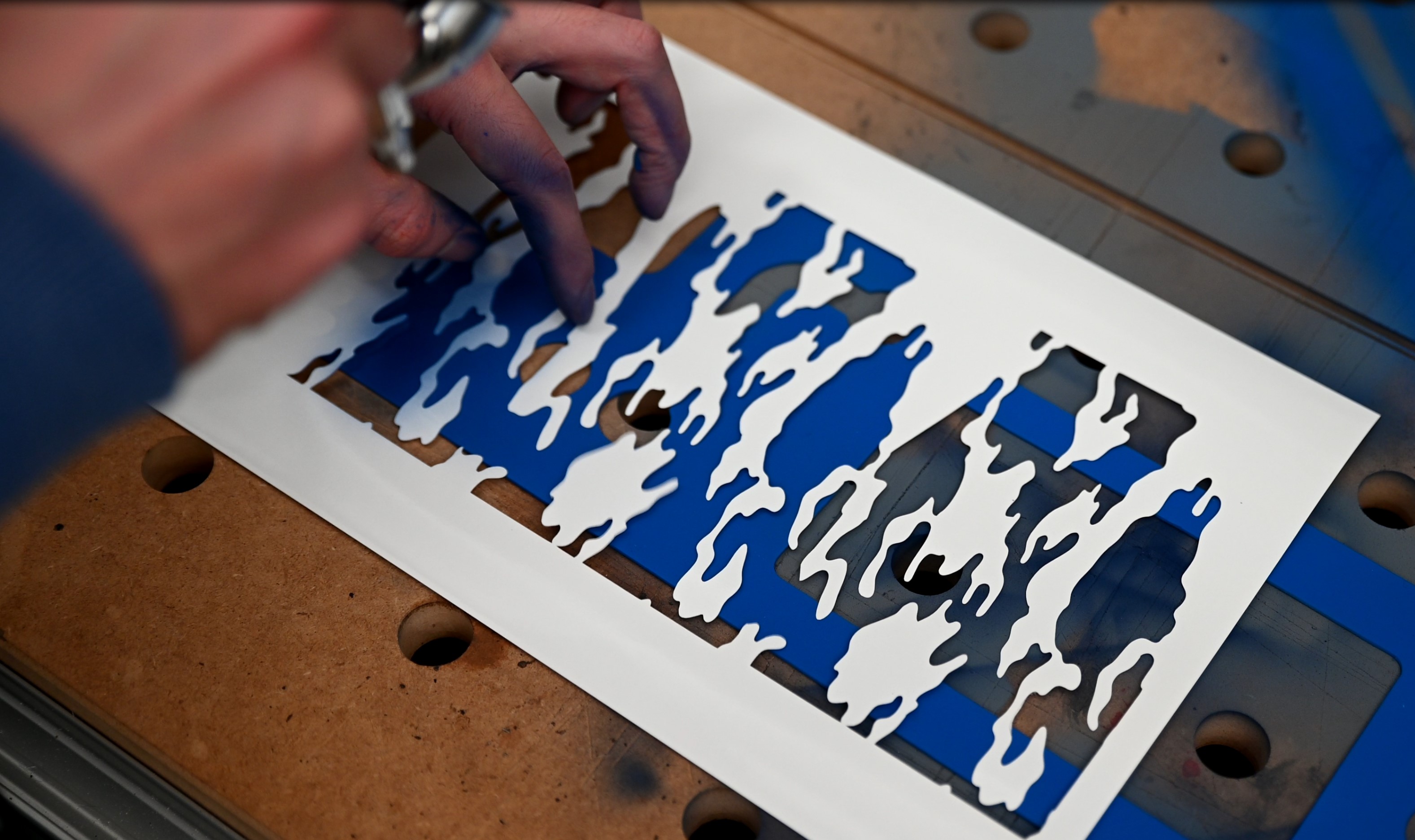 The cover plate for the reservoir was more complicated, however, as that did require a pattern to be applied. It made sense to stick to using the airbrush for this, so I drew up a set of camo stencils in Illustrator and cut them on the vinyl plotter out of some glossy photo paper. I'm not particularly experienced with an airbrush, having only used one for a bit of model painting and cake decorating (of all things) in the past, so stencils seemed like the wise approach. From there it was simply a matter of layering up the colours and patterns to create a suitable camo effect.