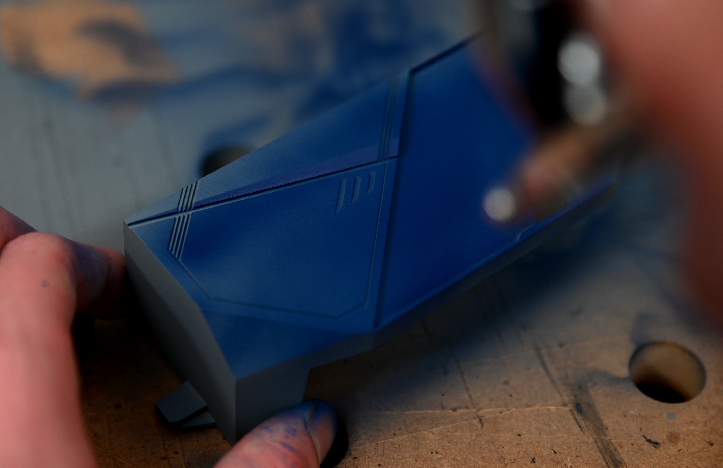 For the theme vote, users were given the choice of either having a woodland camo interior (so brown and green) or a navy camo (blue and grey). Rather inexplicably, navy was chosen here, which frankly still baffles me, but c'est la vie. The idea was that the chosen colour scheme would then be applied to the components and structural parts of the interior. The first component to go under the brush was the motherboard. I removed all the plastic shrouds and the heatsinks, then went about air brushing them a combination of royal blue and shadow grey. I had considered trying to add the camo pattern here, but since the pieces are quite small it felt like it would be perhaps too busy. Instead I decided to keep it fairly straightforward, simply adding some mild weathering here and there in order to add a little depth to the pieces.